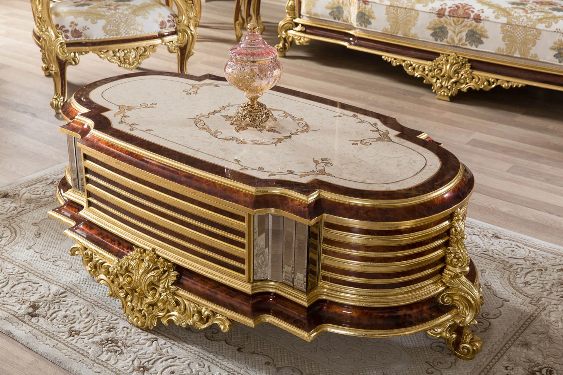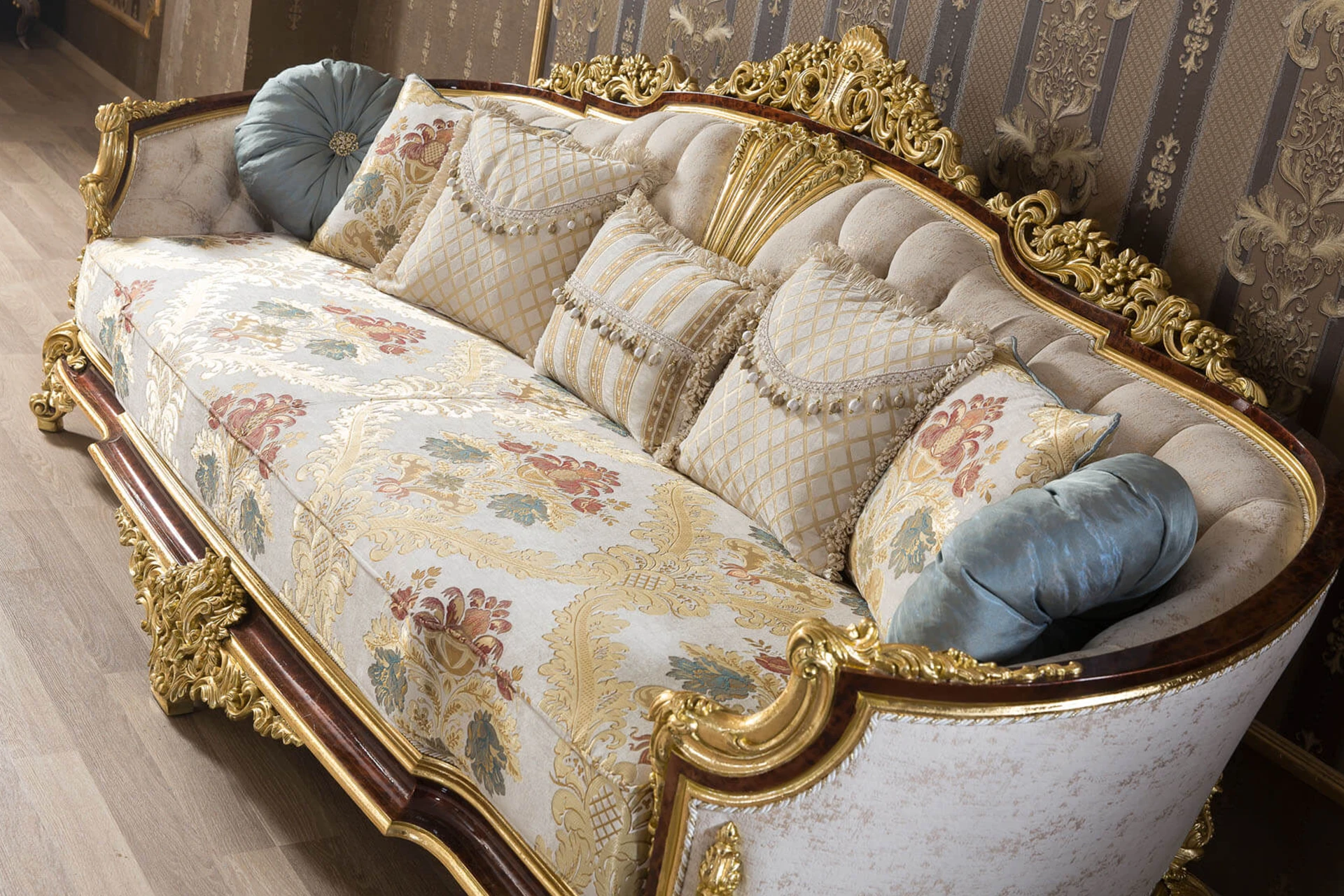 The Kral sofa set is a testament to classic elegance and royal charm. Each piece is adorned with lavish carvings, highlighted in rich gold, adding a sense of grandeur to any space. The luxurious upholstery, featuring intricate floral patterns, pairs beautifully with the meticulously sculpted wooden frames. Plush cushions and the delicately curved armrests promise comfort while enhancing the overall aesthetic. The oval coffee table, with its layered gold accents and detailed legs, completes this regal setting, making it a perfect centerpiece for a sophisticated living room. Kral transforms your home into a palace, capturing the essence of timeless luxury.