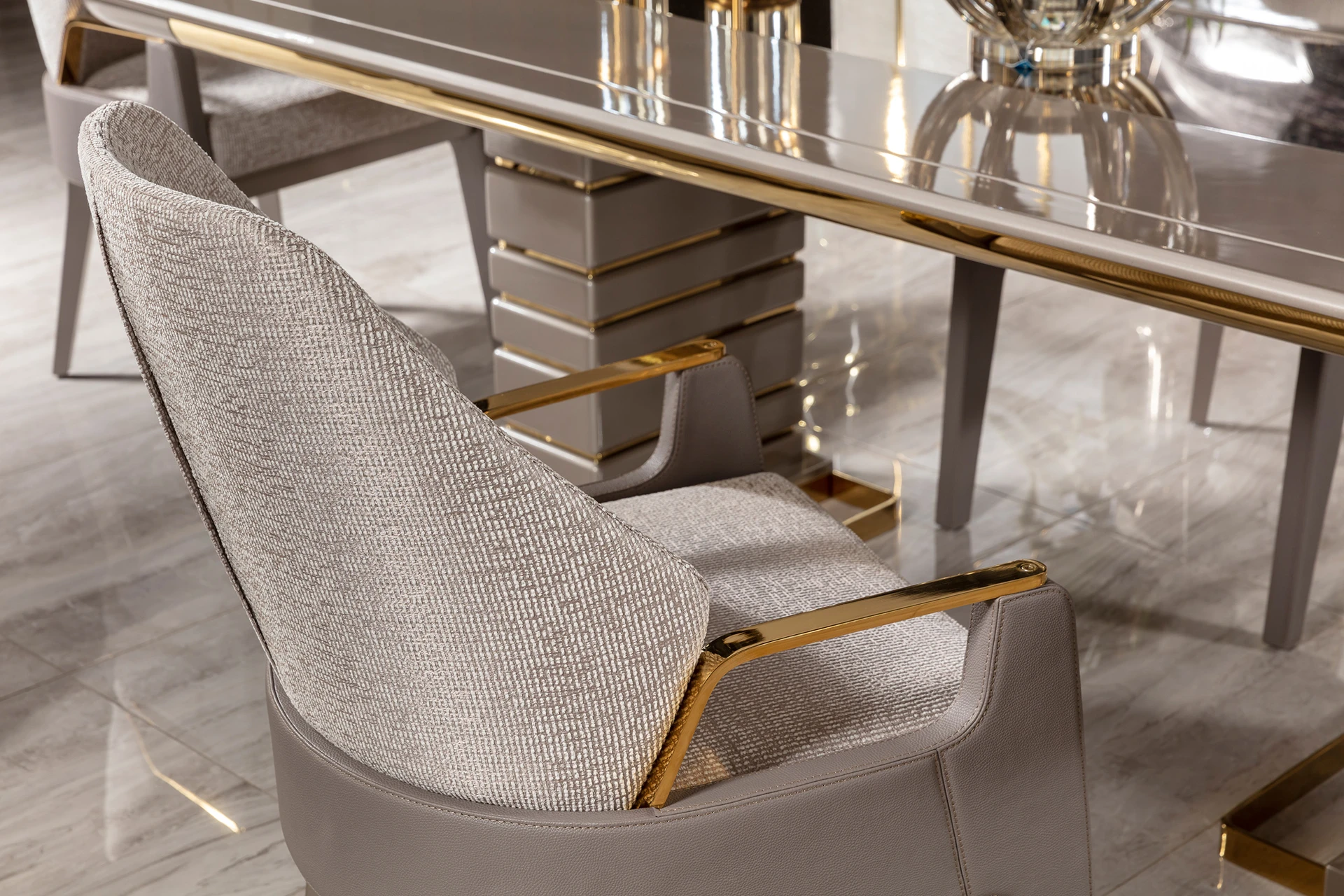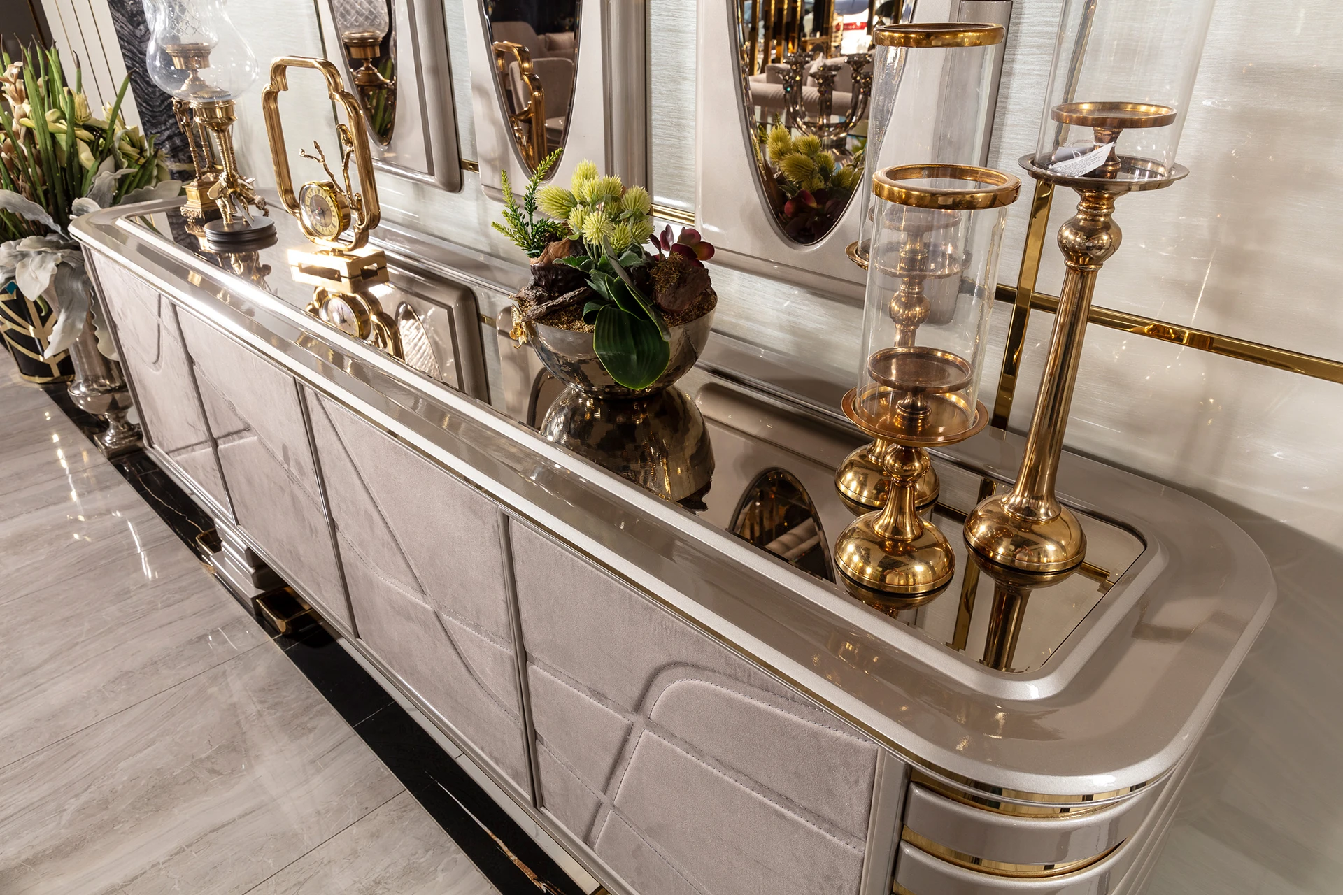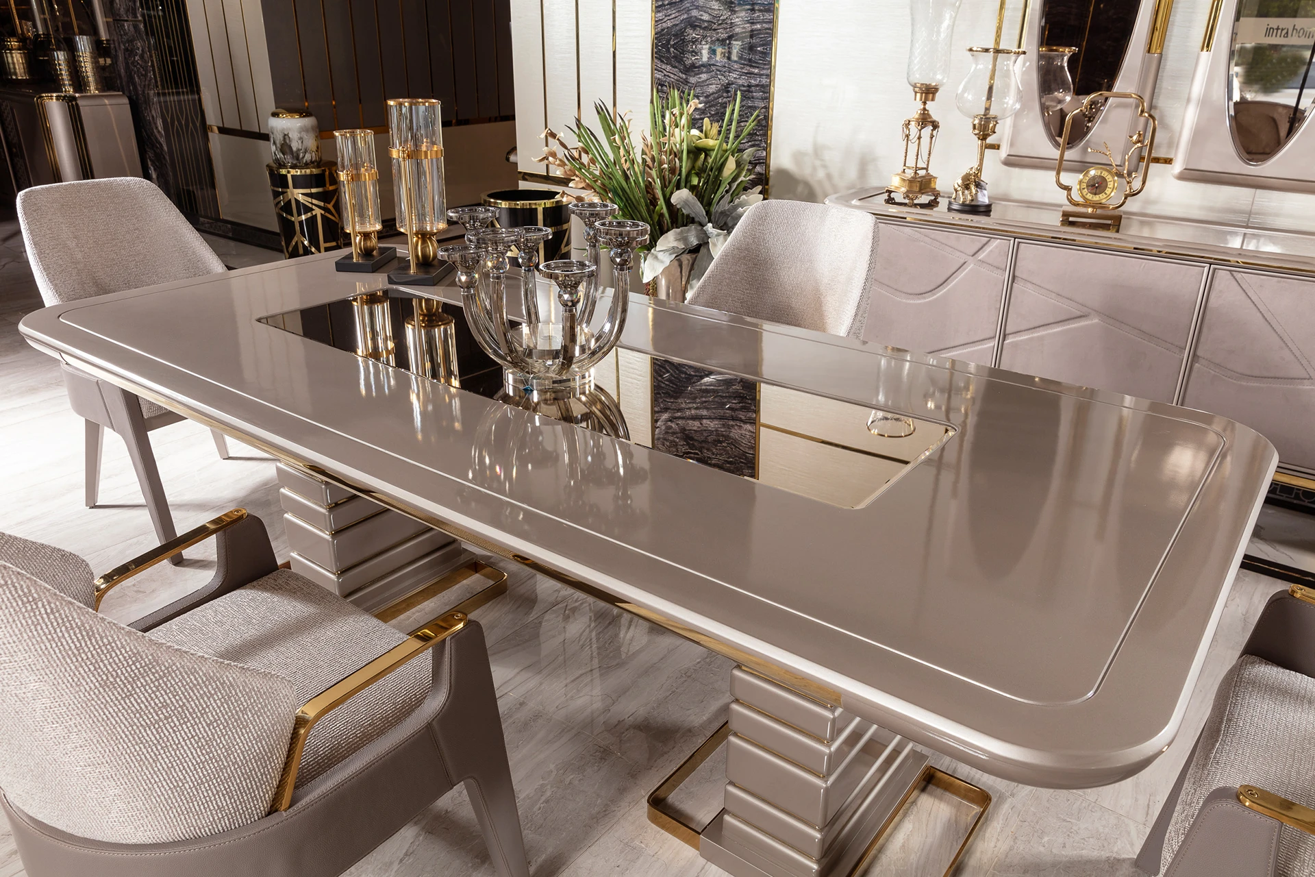 The Lapis dining room set embodies modern elegance with a touch of luxury, designed to elevate any dining experience. The sleek, reflective surfaces of the dining table, combined with the geometric base, create a sense of contemporary sophistication. The chairs, with their soft, neutral fabric and metallic accents, provide both comfort and style. The accompanying sideboard features chic detailing and polished mirrors, enhancing the overall aesthetic of the space. The Lapis Dining Room Set is the perfect choice for those who appreciate fine craftsmanship and wish to make a statement in their home with understated opulence.
