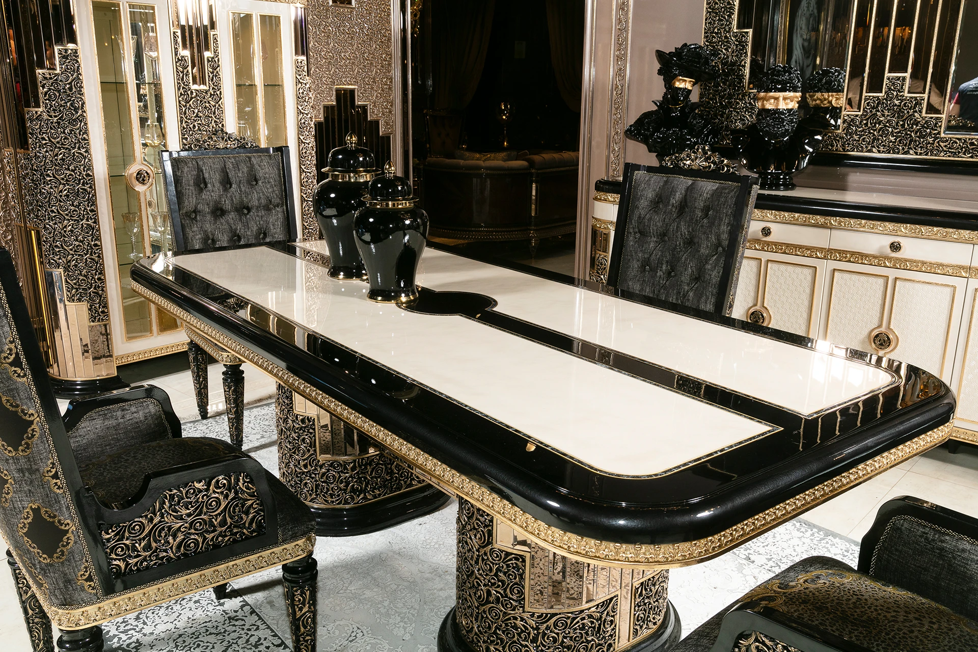 The Larissa dining room set brings a captivating fusion of elegance and opulence. With its striking black and gold accents, this set transforms any dining area into a sophisticated haven. The intricate carvings and detailed patterns on the chairs and table exude a sense of regal luxury, while the mirrored surfaces reflect the grandeur of the setting. The high-back chairs offer comfort without compromising on style, and the overall design is perfect for formal gatherings. Ideal for those seeking a bold statement piece, the Larissa dining room set adds a timeless charm to any classic interior.
