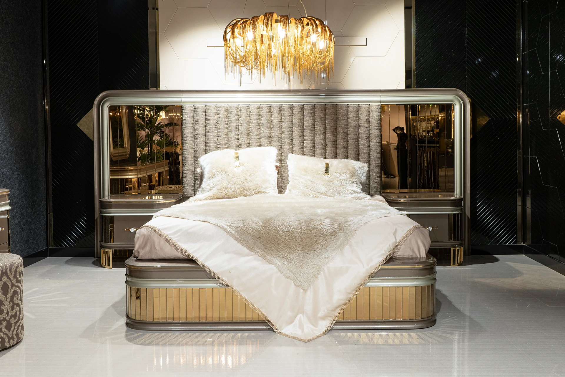 The Lima bedroom set is a stunning combination of modern luxury and comfort. This design showcases a sleek, metallic finish on both the bed and the accompanying furniture, such as the nightstands and vanity. The reflective surfaces, including the mirrored headboard and golden accents, give the room a sophisticated, opulent feel, while the soft, upholstered headboard adds a touch of coziness and warmth.