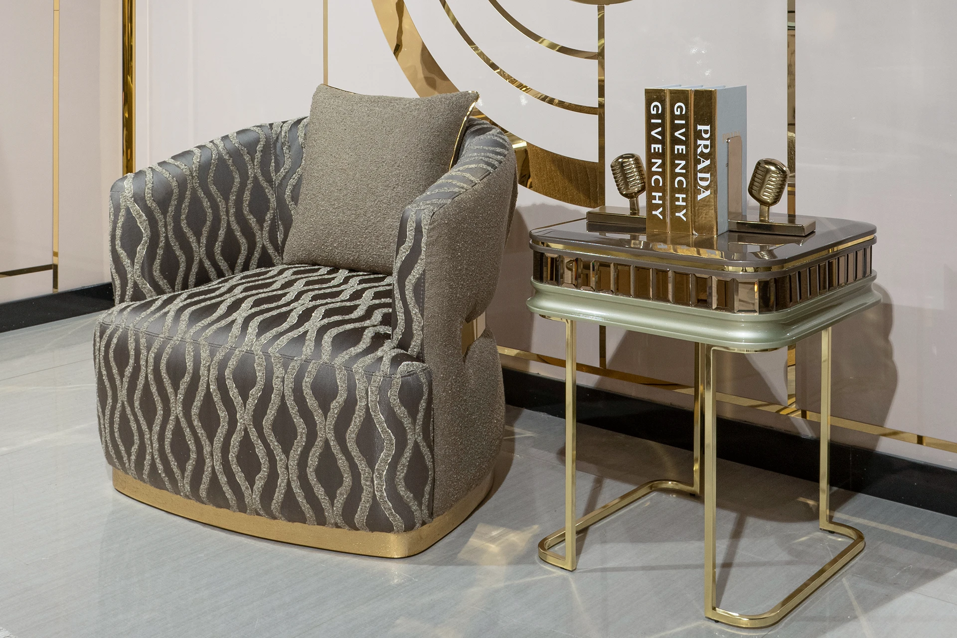 The Lima sofa set combines modern elegance with a warm, welcoming design. The soft, rounded curves of the chairs and sofa create a cozy, intimate seating arrangement, making it perfect for social gatherings or relaxation. The fabric has a subtle yet luxurious texture, while the gold accents around the base of the seating pieces add a touch of glamour and sophistication.