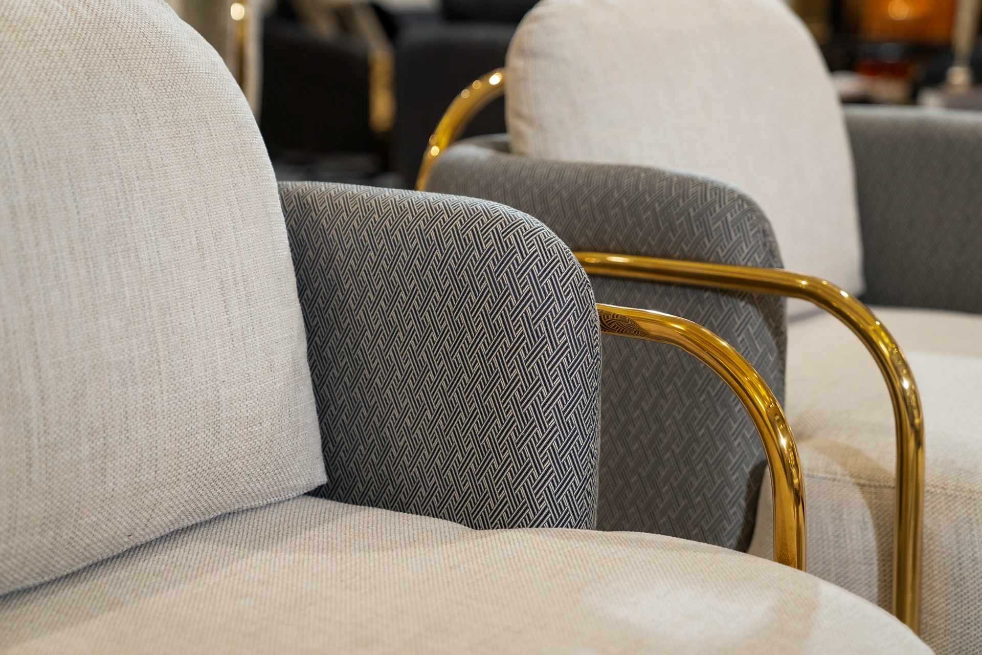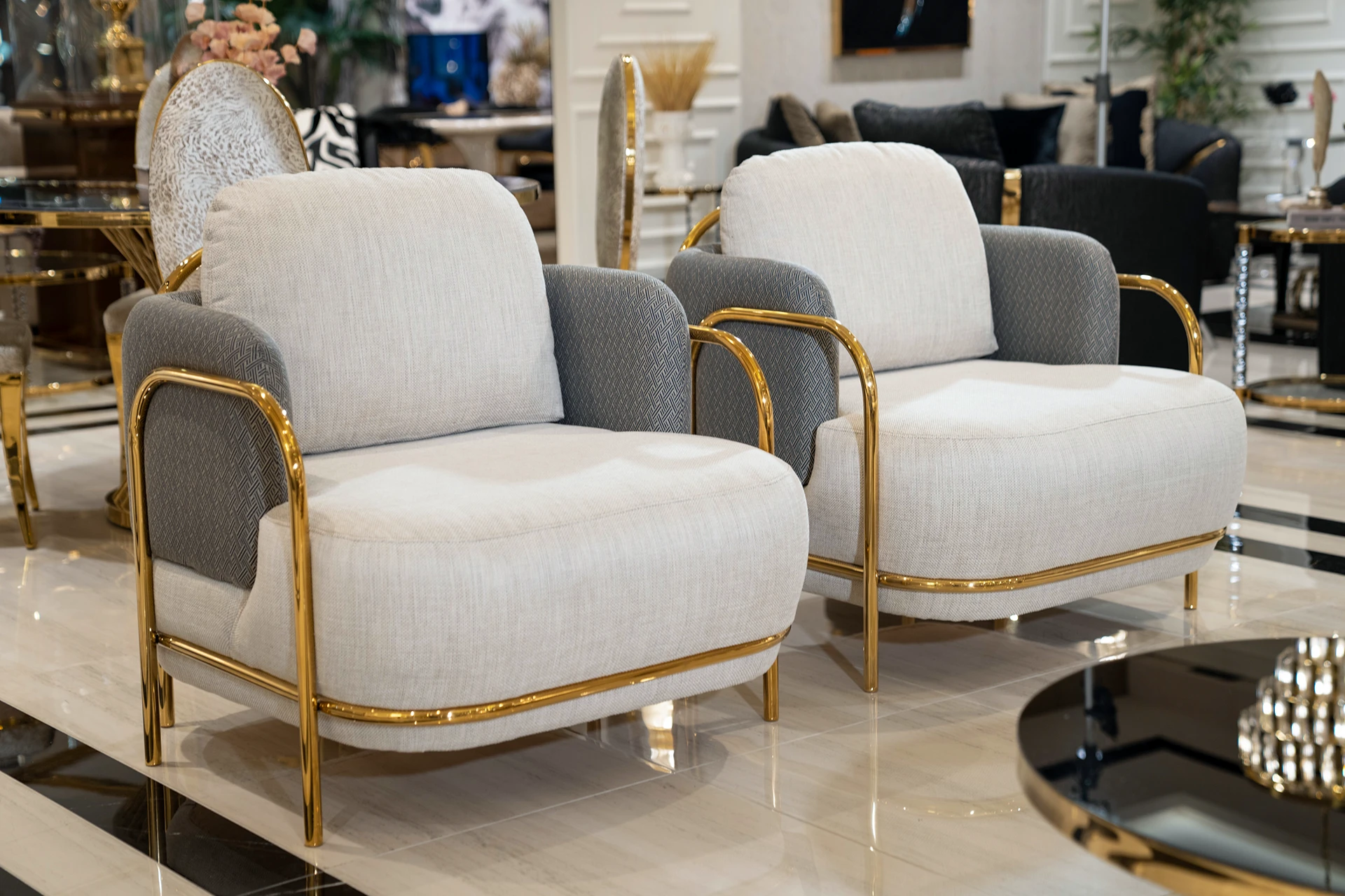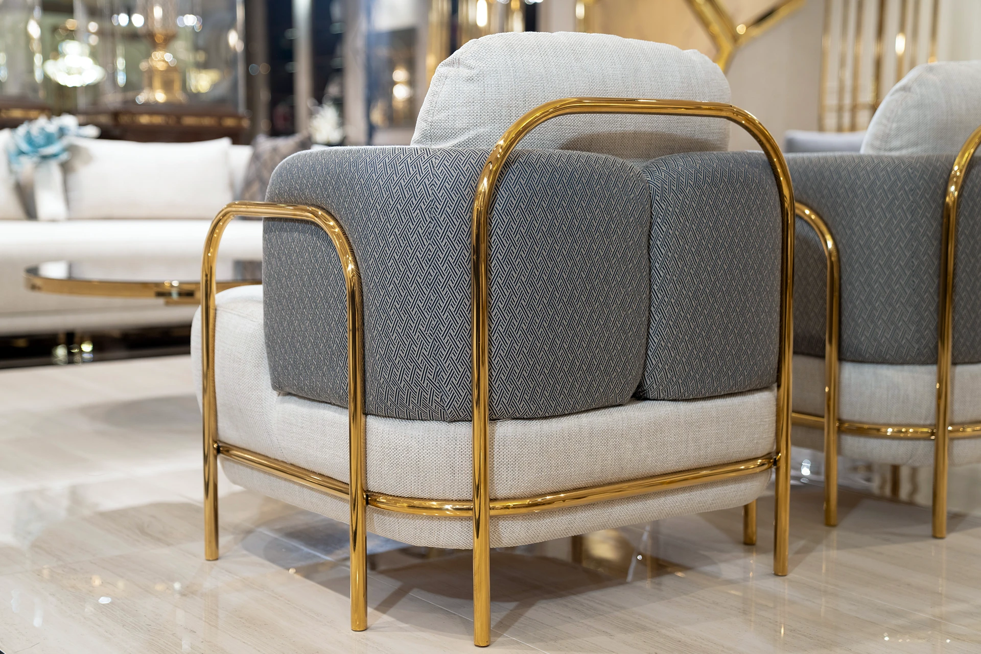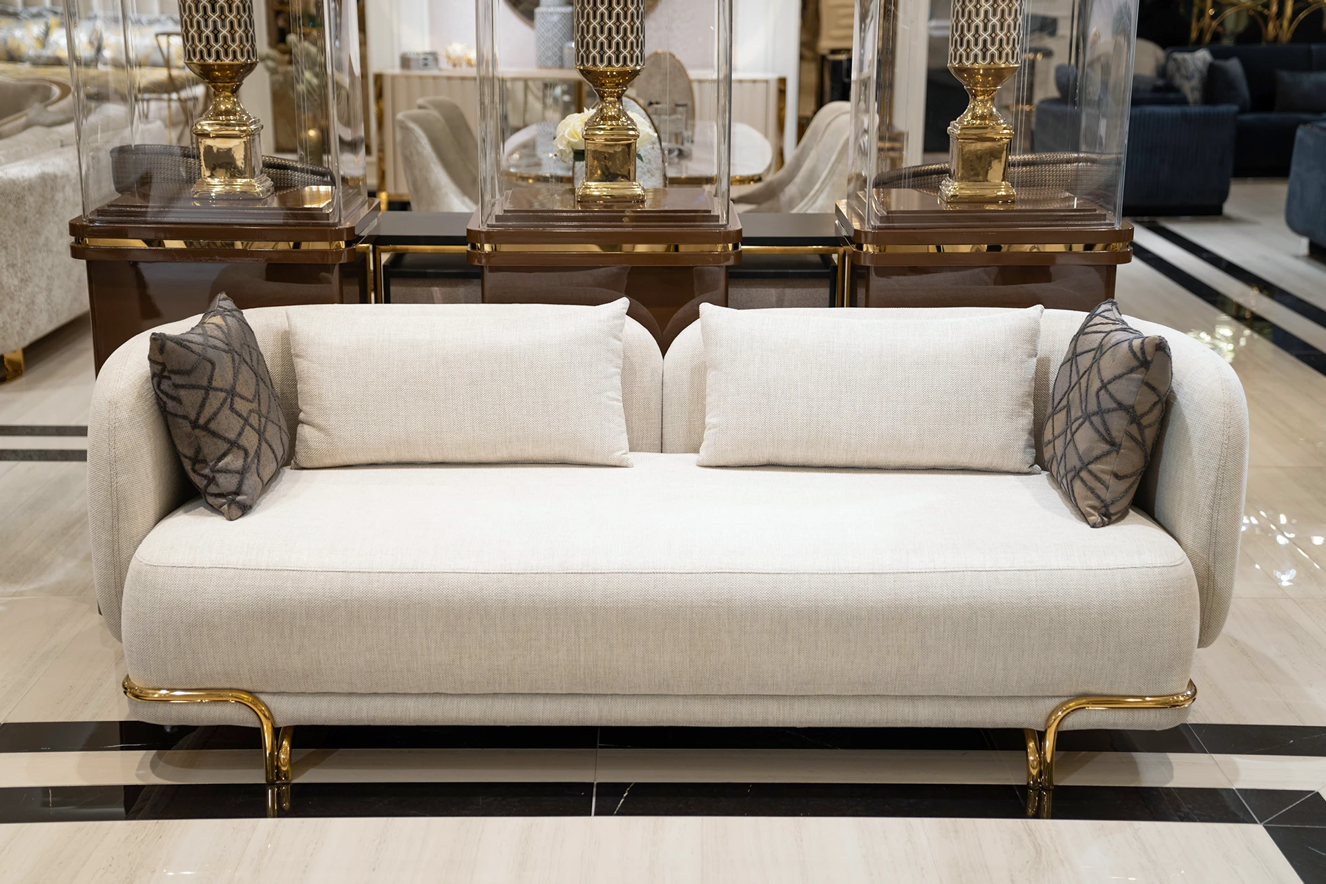 The Lizbon sofa set shown in the image exudes modern elegance with its clean lines, sleek design, and a balance of luxurious materials. The soft, neutral-colored upholstery contrasts beautifully with the gleaming gold accents in the frames, giving the room a sophisticated yet comfortable ambiance. The rounded edges of the sofas and armchairs enhance the contemporary look, while the reflective surfaces of the coffee table add a touch of glamour. The overall design, coupled with the minimalistic decor, makes this set a perfect choice for a high-end, stylish living room.