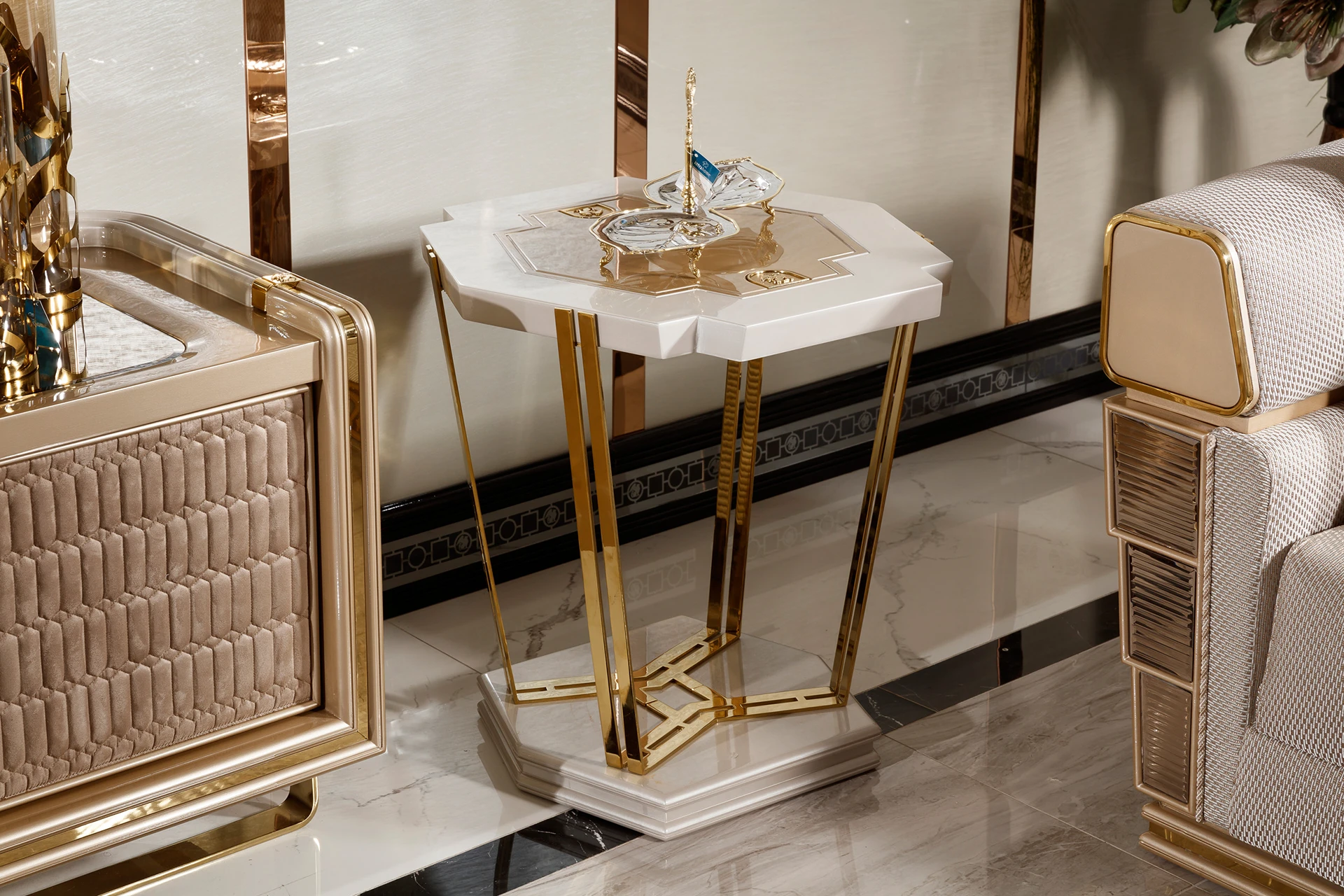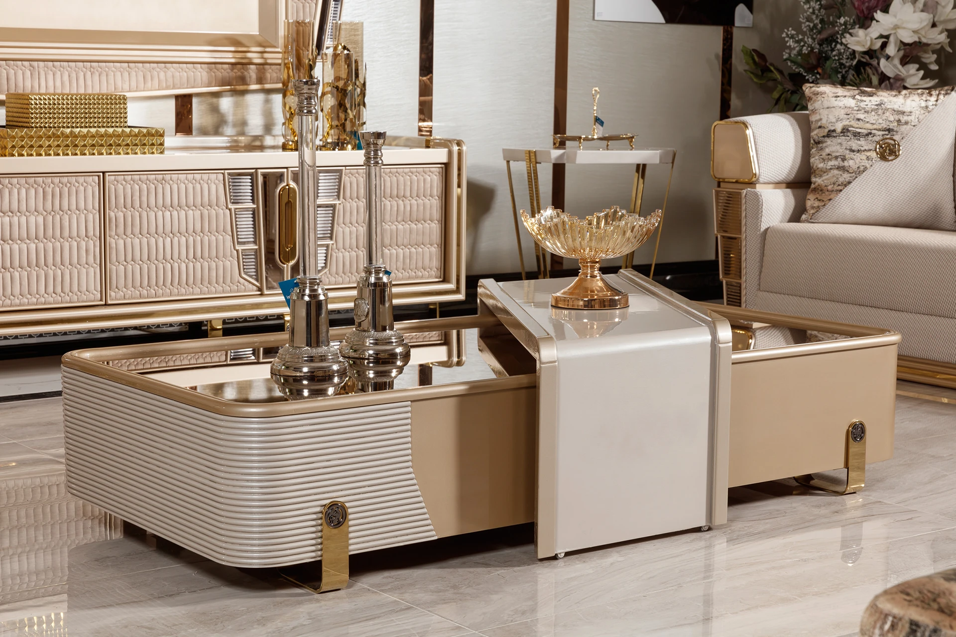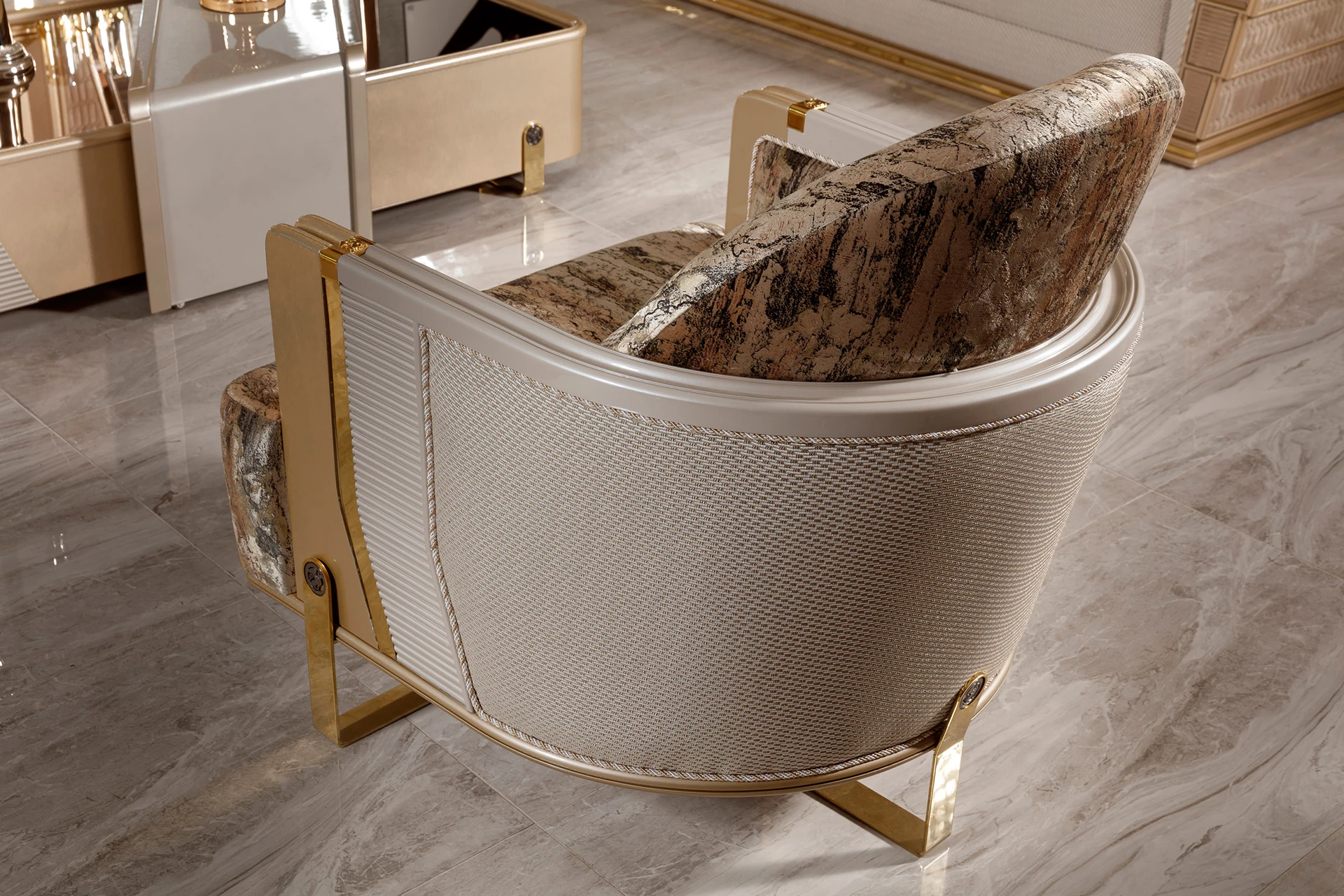 Redefine your living space with the Loft sofa set’s luxurious and contemporary design. Featuring clean lines and a neutral color palette, this set blends elegance with comfort. The spacious sofas offer ample seating, crafted with plush cushioning and sophisticated upholstery, making it perfect for both relaxation and stylish gatherings. The armchairs, adorned with a textured finish and modern accents, complement the set beautifully. The sleek coffee table, with its unique storage compartments, adds a touch of functionality to this chic ensemble. Create a refined ambiance with the loft sofa set, a true centerpiece for your home.