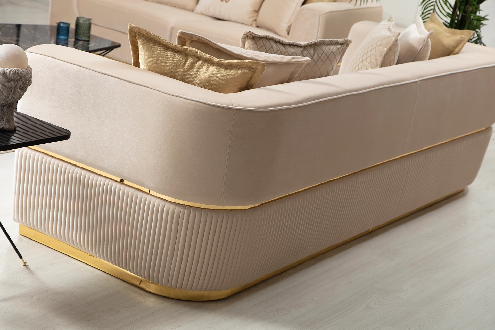 The Lorenzo sofa set offers a sophisticated blend of modern elegance and comfort. Its clean, straight lines are softened by the plush, cream-colored upholstery, creating a cozy yet upscale ambiance. The ribbed detailing at the base and the subtle gold accents give it a touch of luxury. Accompanied by a stylish coffee table featuring geometric patterns, this set seamlessly integrates into contemporary interiors, making it a versatile choice for both relaxation and refined gatherings.