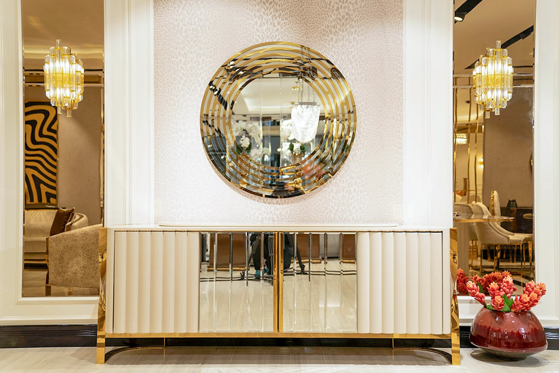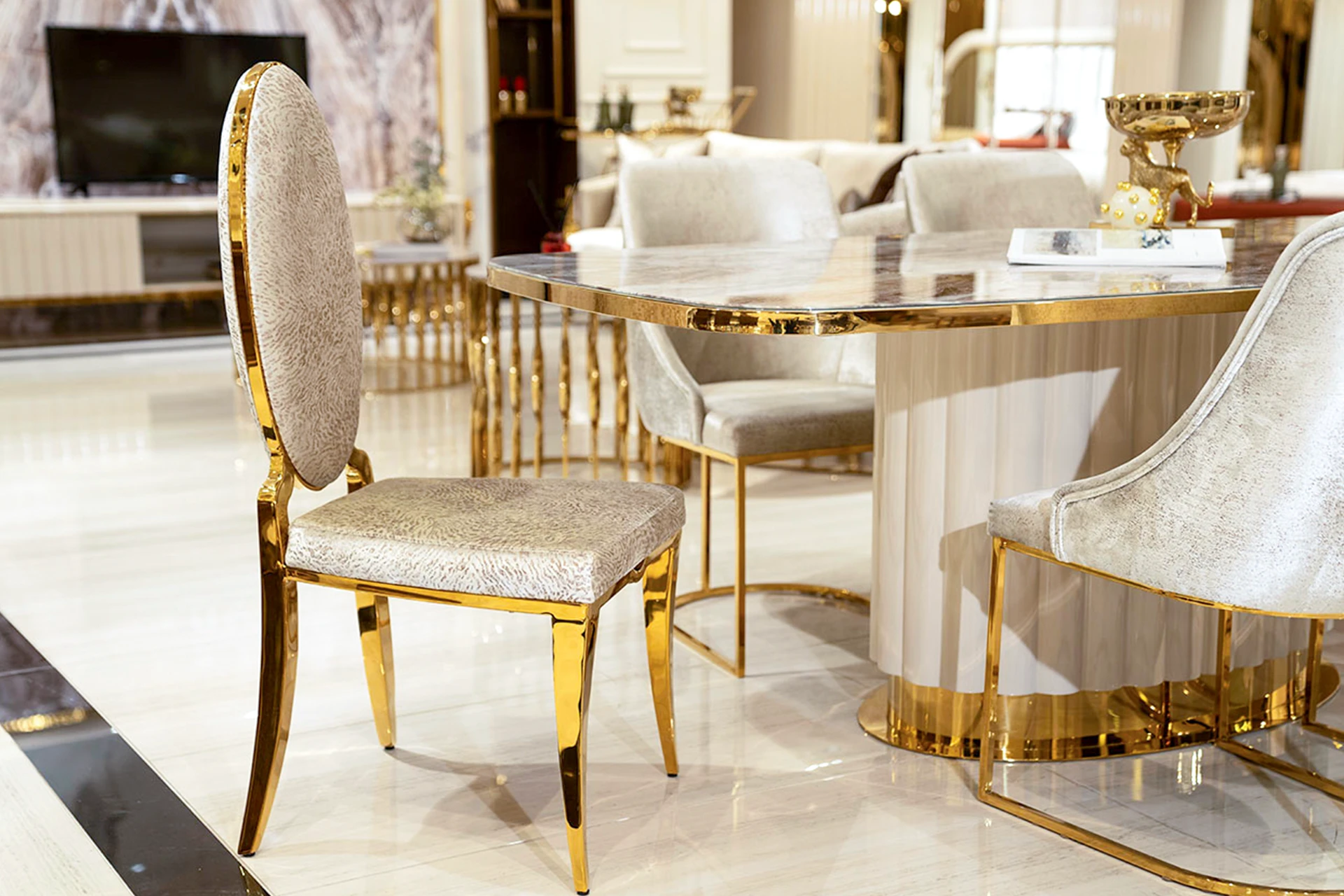 Step into a world of refined luxury with the Luna dining room set. Featuring a striking combination of soft ivory tones and bold gold accents, this set is designed to impress. The oval-back chairs provide a regal feel, enhanced by their plush upholstery and sleek golden frames. The centerpiece table is adorned with a glossy surface and sculpted base, seamlessly blending modern aesthetics with timeless elegance. A matching buffet with mirrored and gold accents adds storage and sophistication to the room. Perfect for those who seek grandeur and style, the luna dining room set brings a touch of modern opulence to any dining space, creating the perfect setting for unforgettable moments.