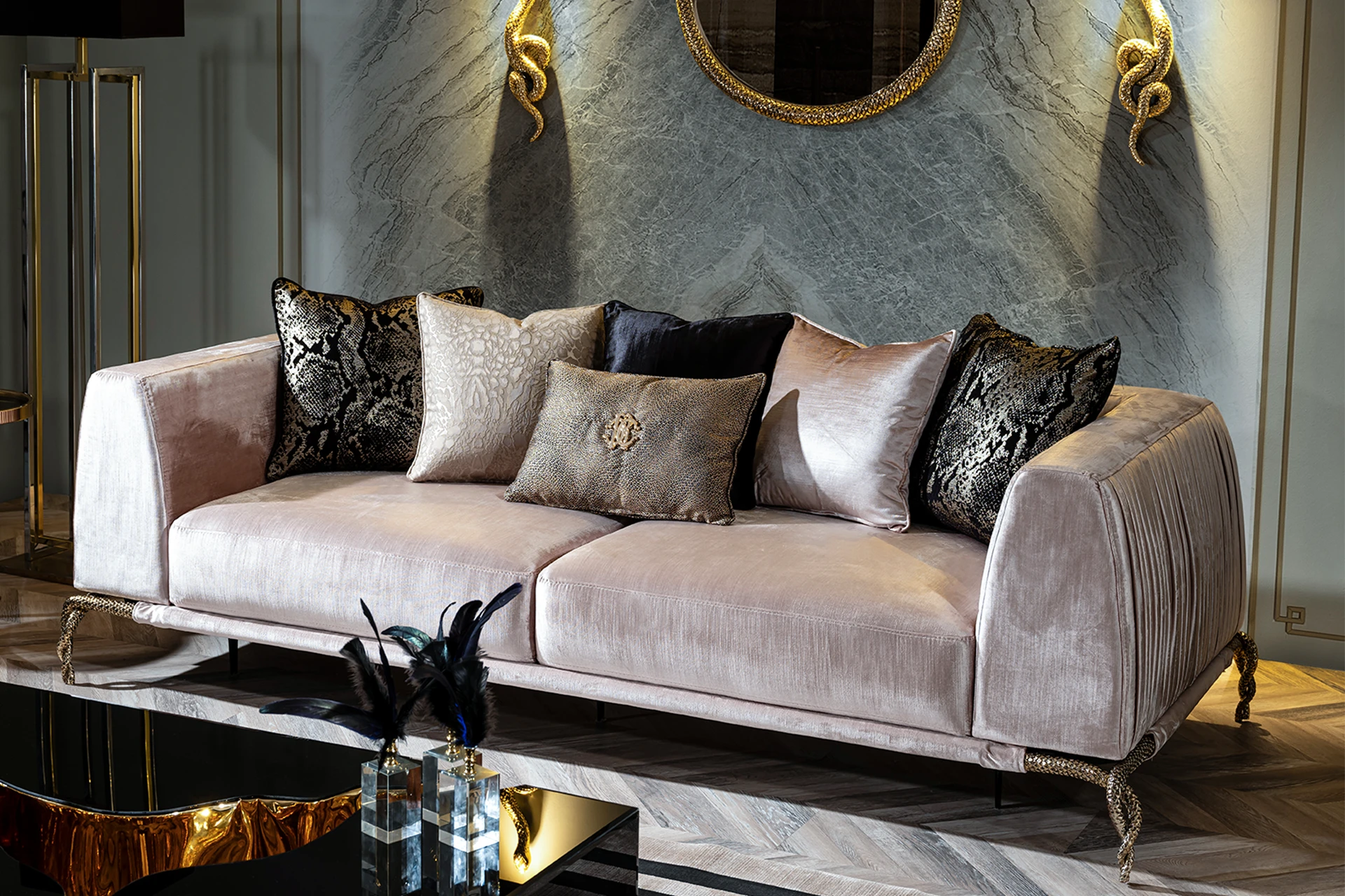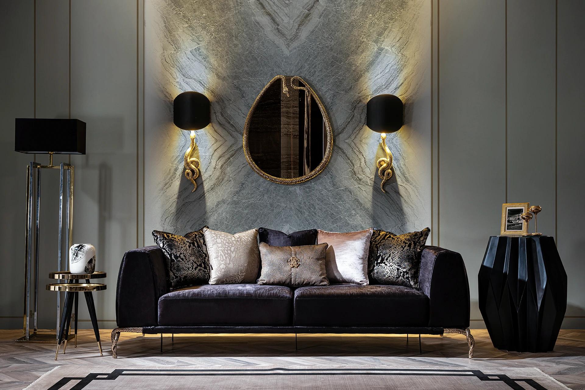 The Majesty sofa set exudes luxury and sophistication, with its regal color palette and rich textures. The plush velvet upholstery, accented with gold detailing, creates a striking contrast that adds an element of drama to the room. The sleek lines and refined silhouettes of the sofas, combined with the glamorous decor, make this set a statement of elegance. Paired with a contemporary coffee table and exquisite lighting, the Majesty sofa set transforms any living area into an opulent retreat.