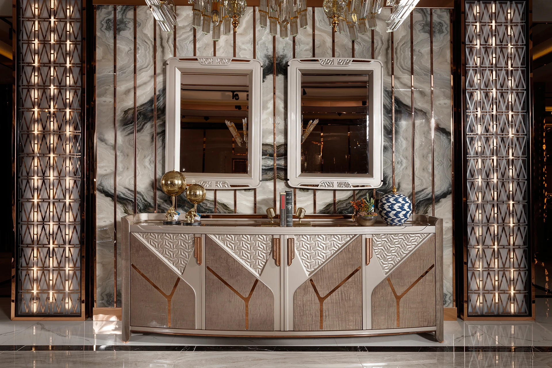 Make a statement with the Marvin dining room set, where elegance meets modern design. This exquisite set features a beautifully crafted table with intricate detailing, paired with luxurious chairs that boast a chic, upholstered finish. The blend of sleek lines and high-end materials creates an ambiance of sophistication, perfect for both formal dinners and casual gatherings. The set’s neutral tones and subtle metallic accents effortlessly enhance the décor of any dining space, making every meal a truly luxurious experience.