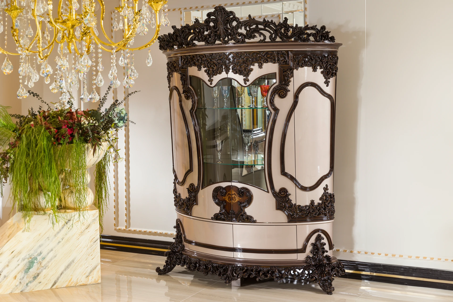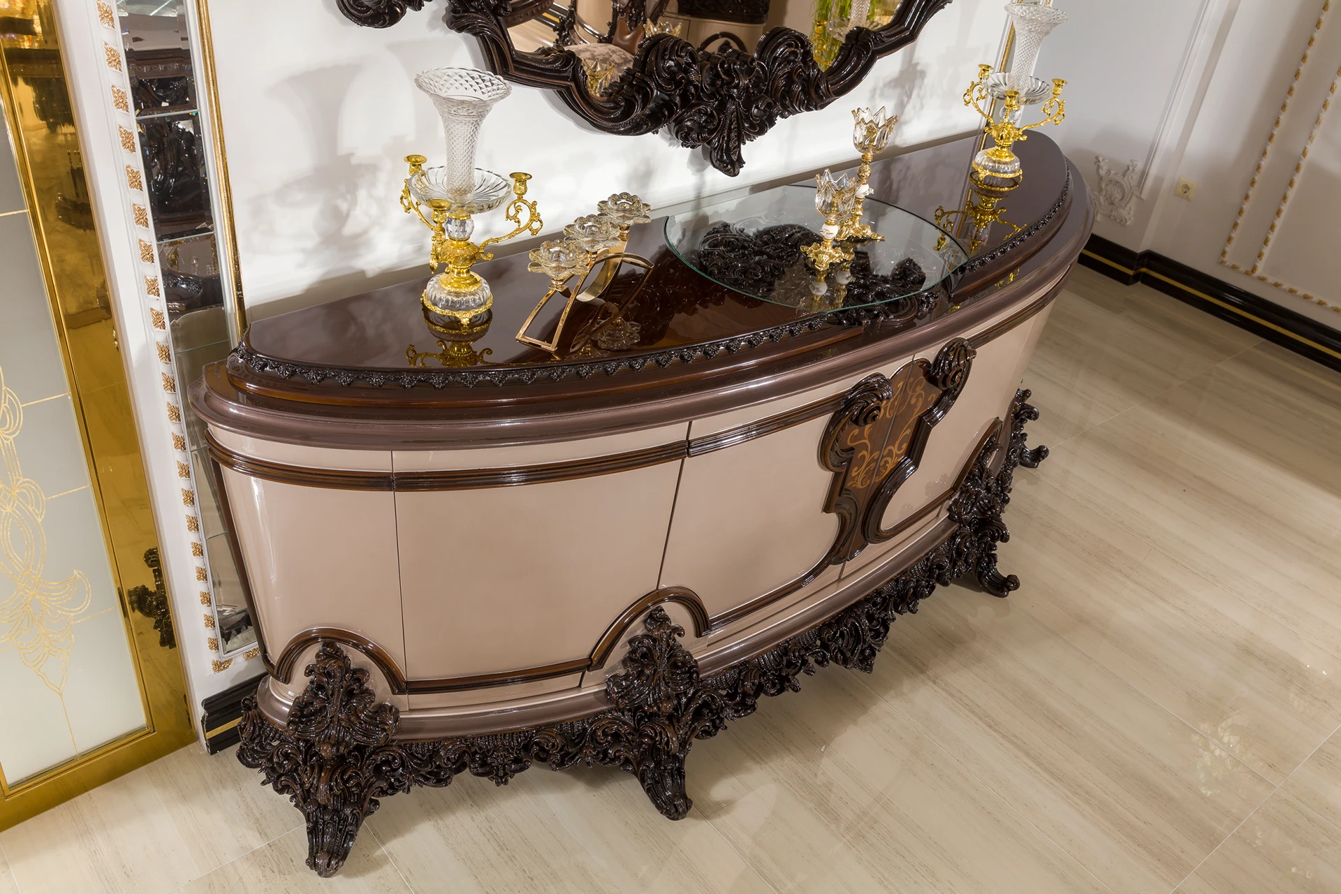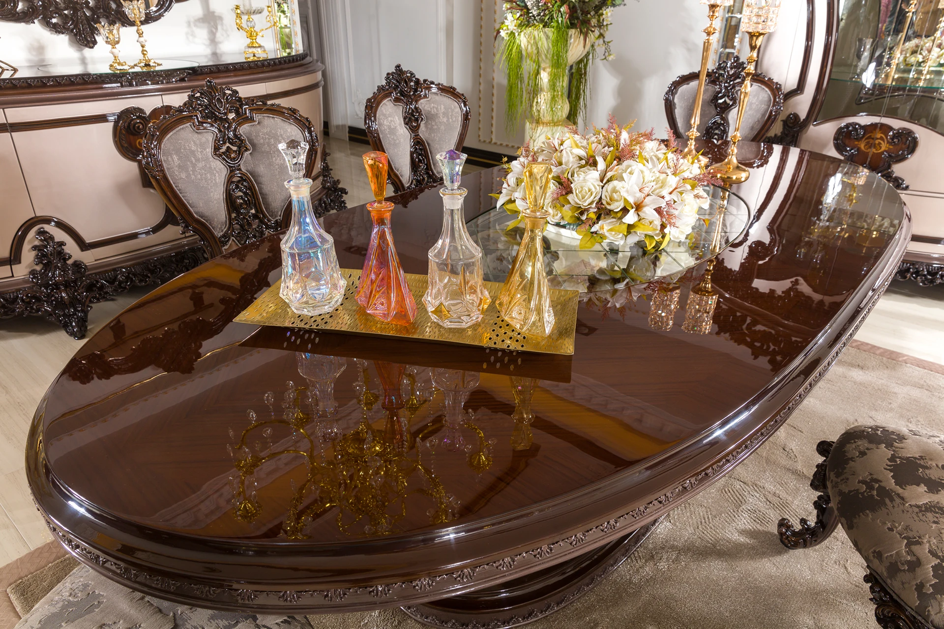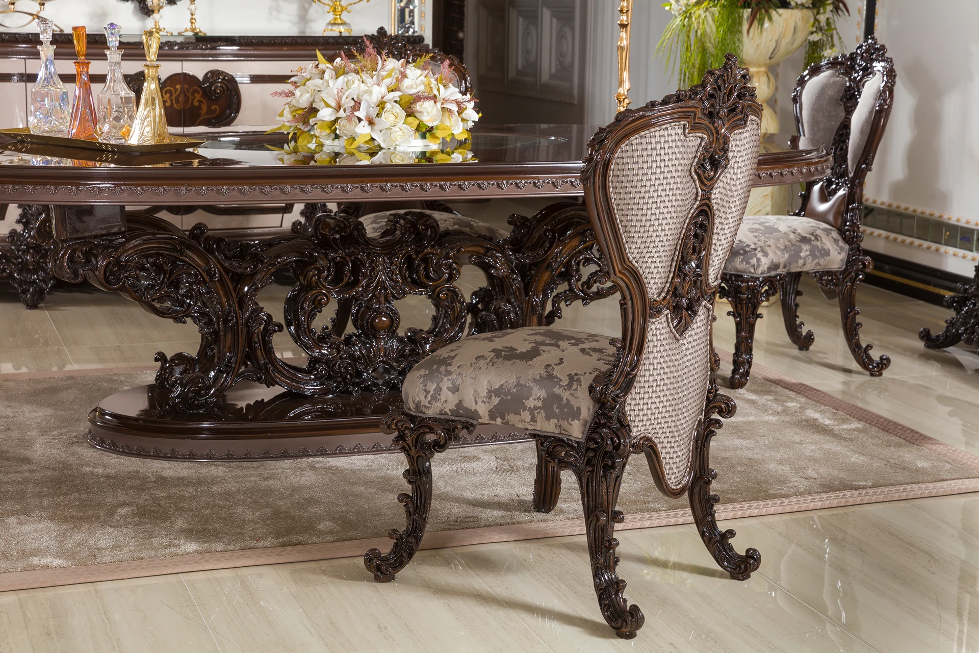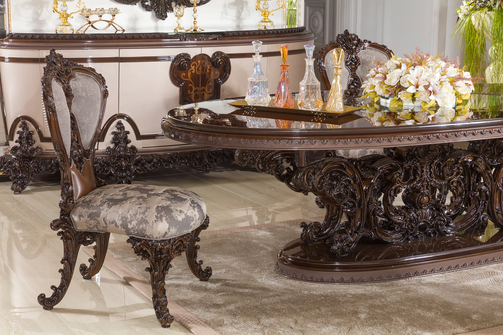 The Meda dining room set is a masterpiece of elegance and sophistication. Its grand, intricately carved table base showcases exquisite craftsmanship, perfectly complementing the glossy tabletop that adds a touch of modern luxury. The high-backed chairs, with their detailed woodwork and plush upholstery, provide both comfort and regal presence. The accompanying buffet and cabinet feature stunning curved accents and ornate details, offering ample storage while serving as statement pieces. This set transforms any dining space into an opulent setting, ideal for those who appreciate classic luxury with a contemporary flair.