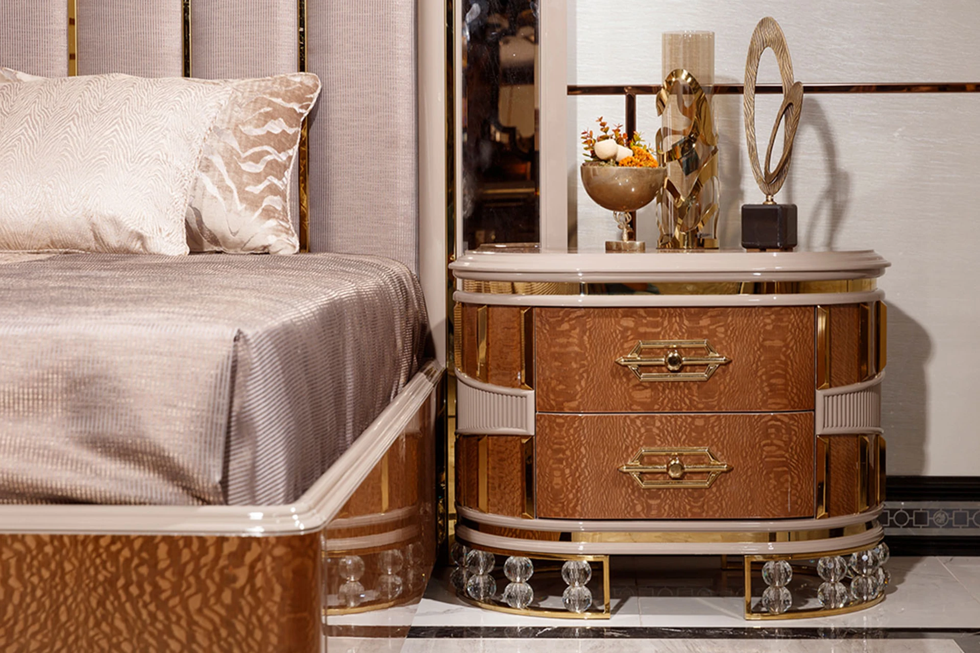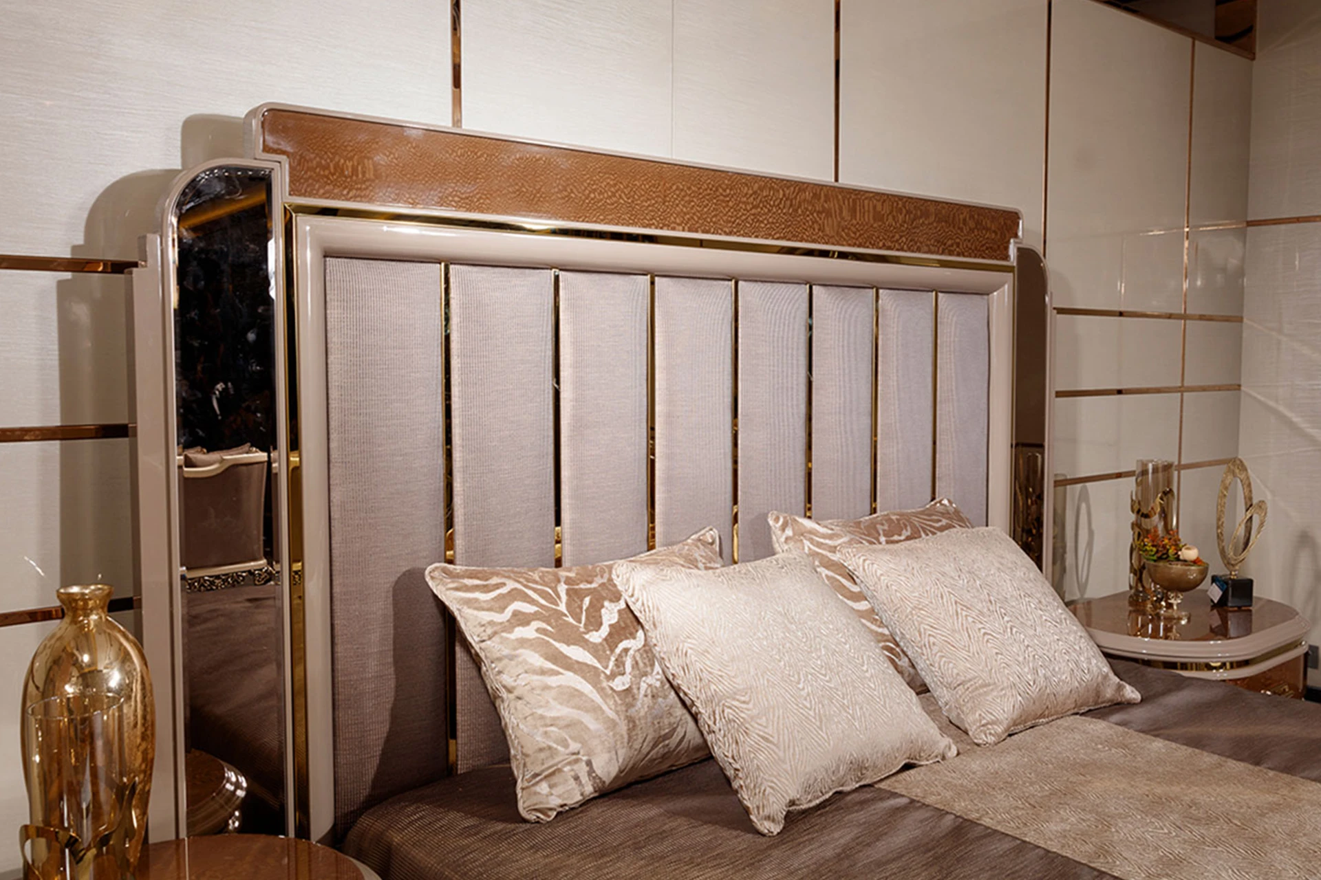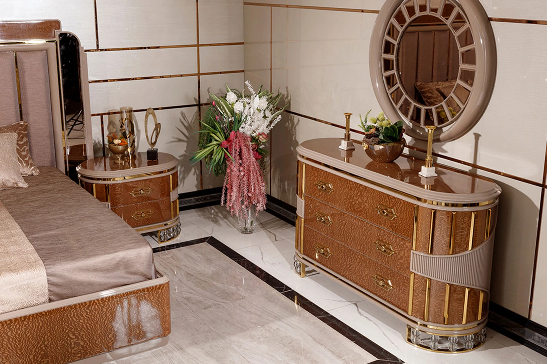 The Messina bedroom set from the classic collection offers a perfect fusion of luxury and modern flair. Its statement bed features a tall, upholstered headboard with sleek vertical lines, creating a sophisticated focal point. The rich wood tones and polished surfaces reflect a timeless elegance, while the matching nightstands and dresser provide both style and functionality. Accentuated with gold finishes and exquisite detailing, the Messina set transforms any bedroom into a luxurious sanctuary. Ideal for those who seek a harmonious blend of contemporary design and classic luxury, this set redefines opulent relaxation.