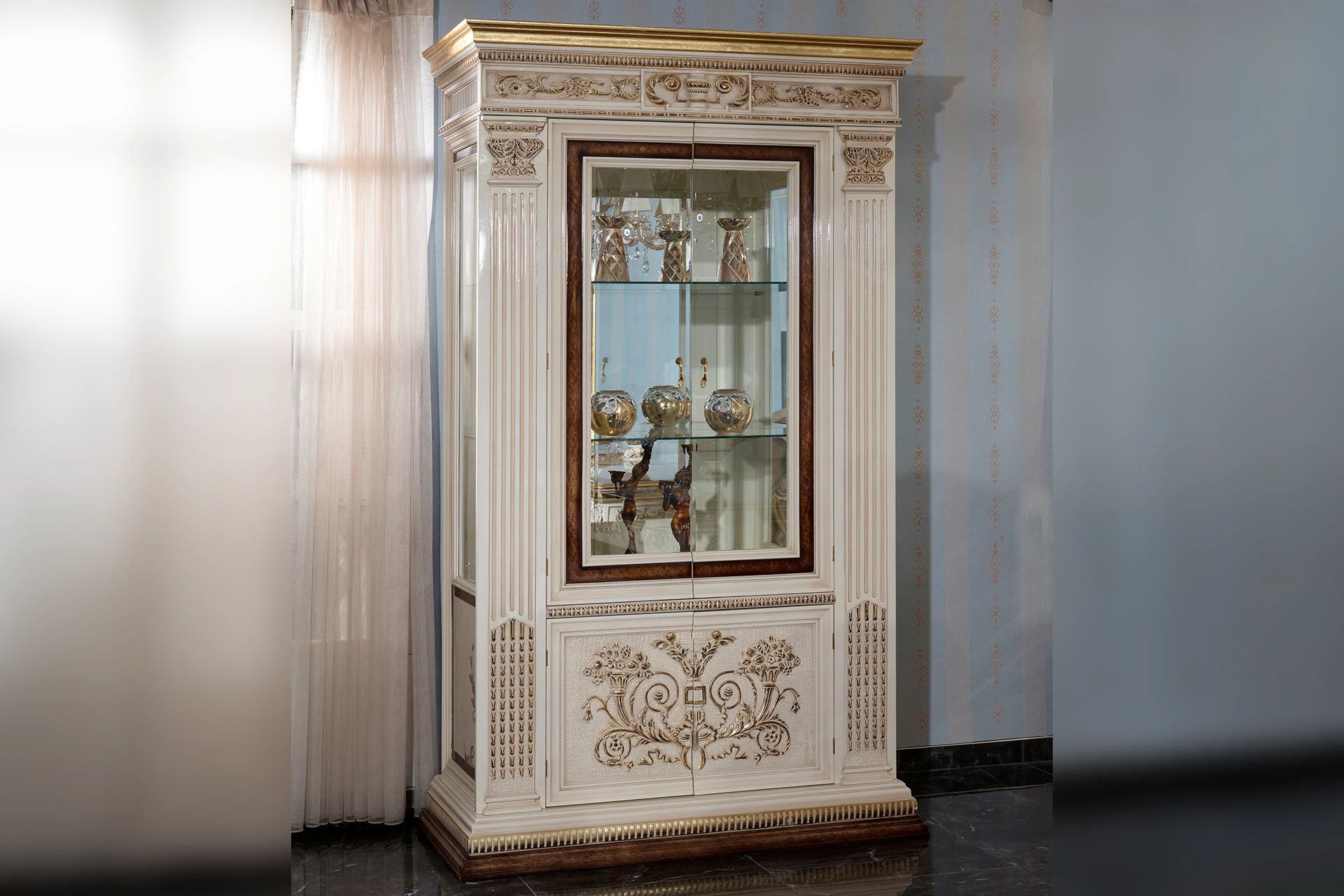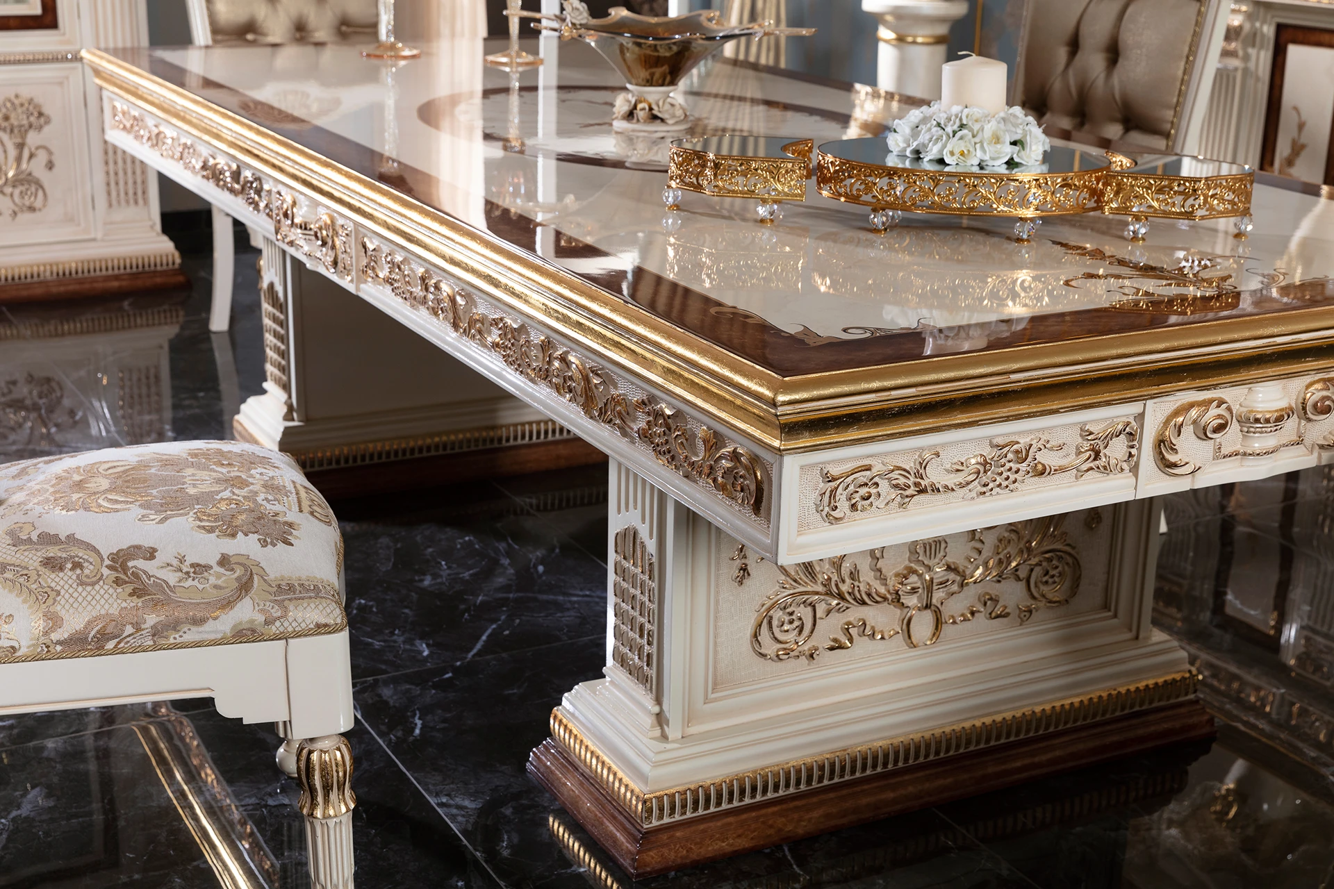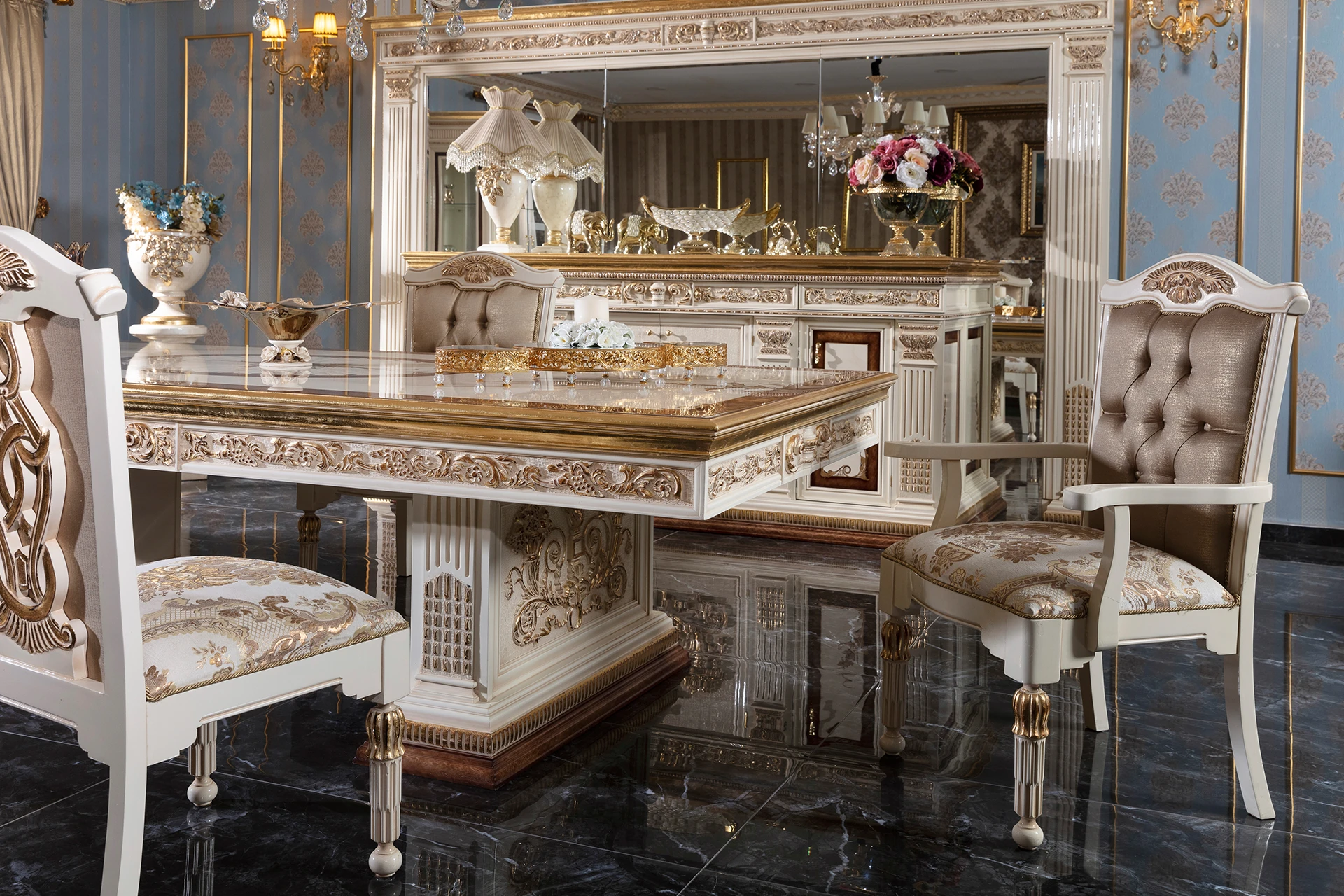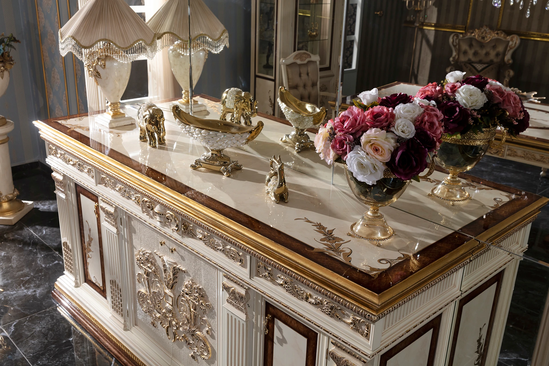 The Milano dining room set showcases a luxurious and sophisticated design, featuring intricate carvings and a timeless elegance. The table, adorned with ornate accents and a glossy finish, is complemented by chairs with upholstered backs, offering both comfort and style. The spacious buffet and display cabinet provide ample storage while adding a grandiose touch to the room. This set embodies a classic charm, perfect for formal dining experiences, and creates a regal atmosphere in any dining space.