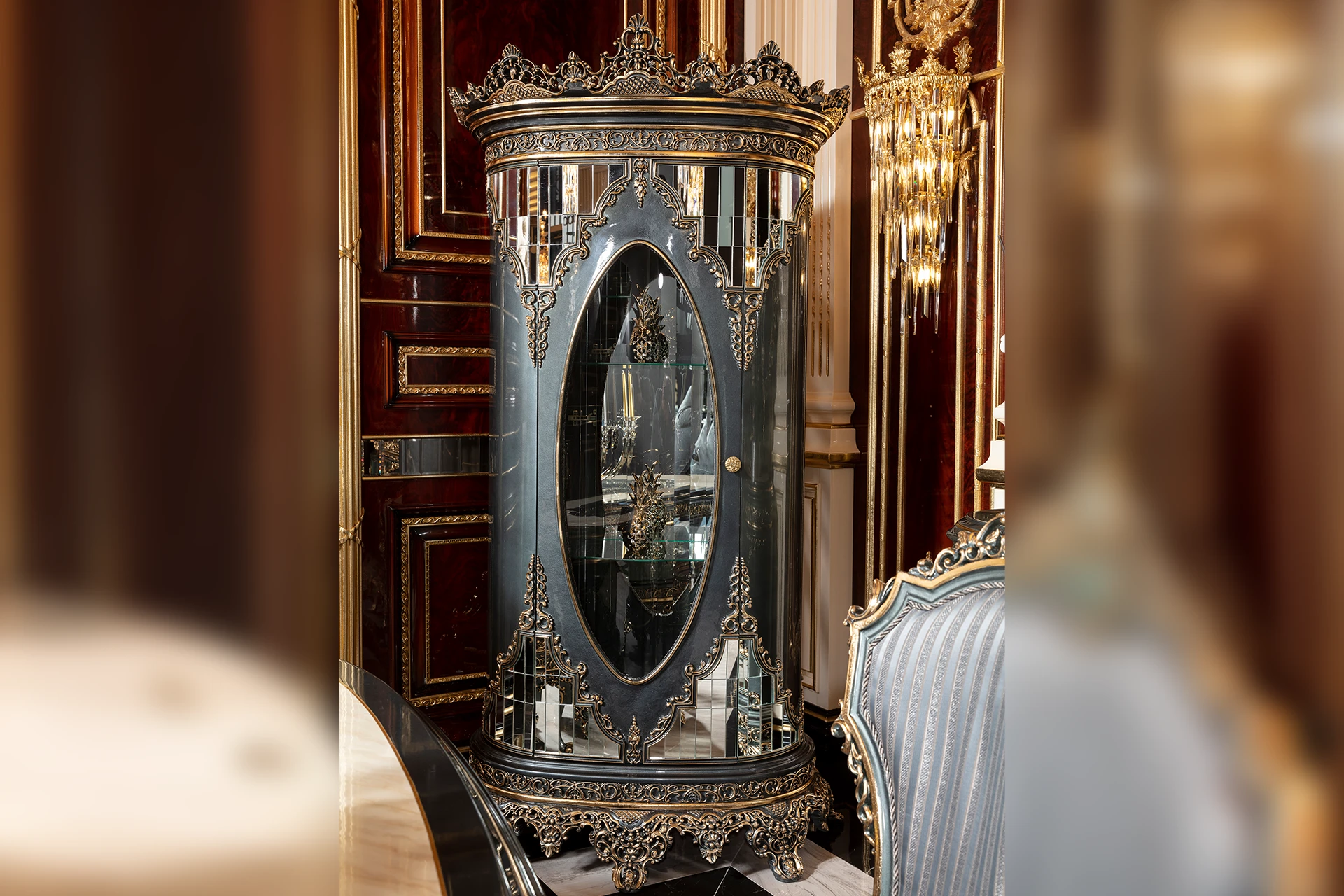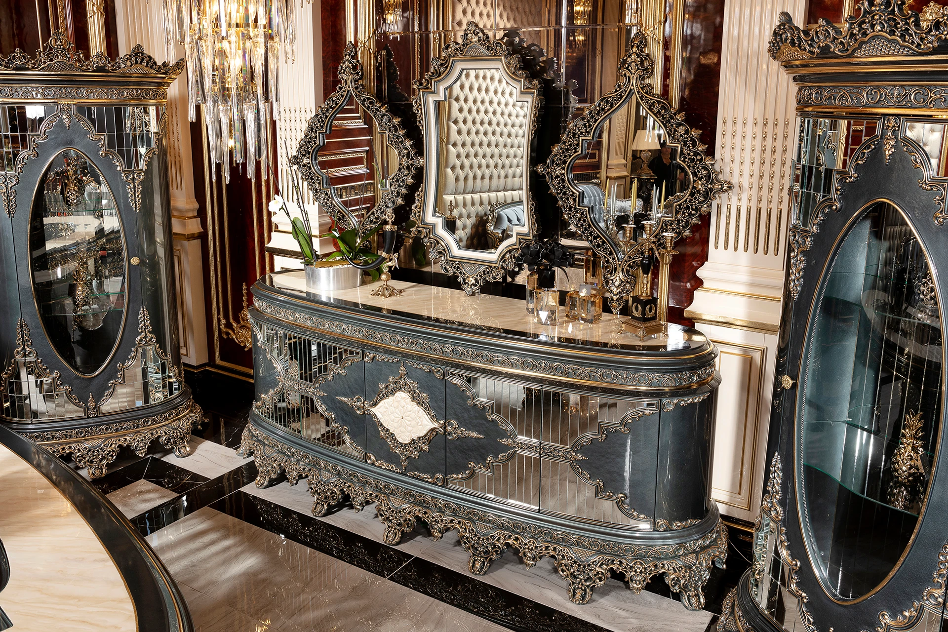 The Milas dining room set showcases unmatched opulence, combining refined craftsmanship with intricate detailing. Each piece is adorned with luxurious carvings that highlight the classic sophistication of the design. The elegant table, with its polished surface and ornate legs, becomes the perfect centerpiece for grand dining occasions. The matching chairs are richly upholstered, offering both comfort and a regal flair, while the side cabinets and display units exude grandeur with mirrored accents and intricate gold or silver embellishments. This set transforms any dining space into a palatial setting, ideal for those with a taste for timeless luxury.