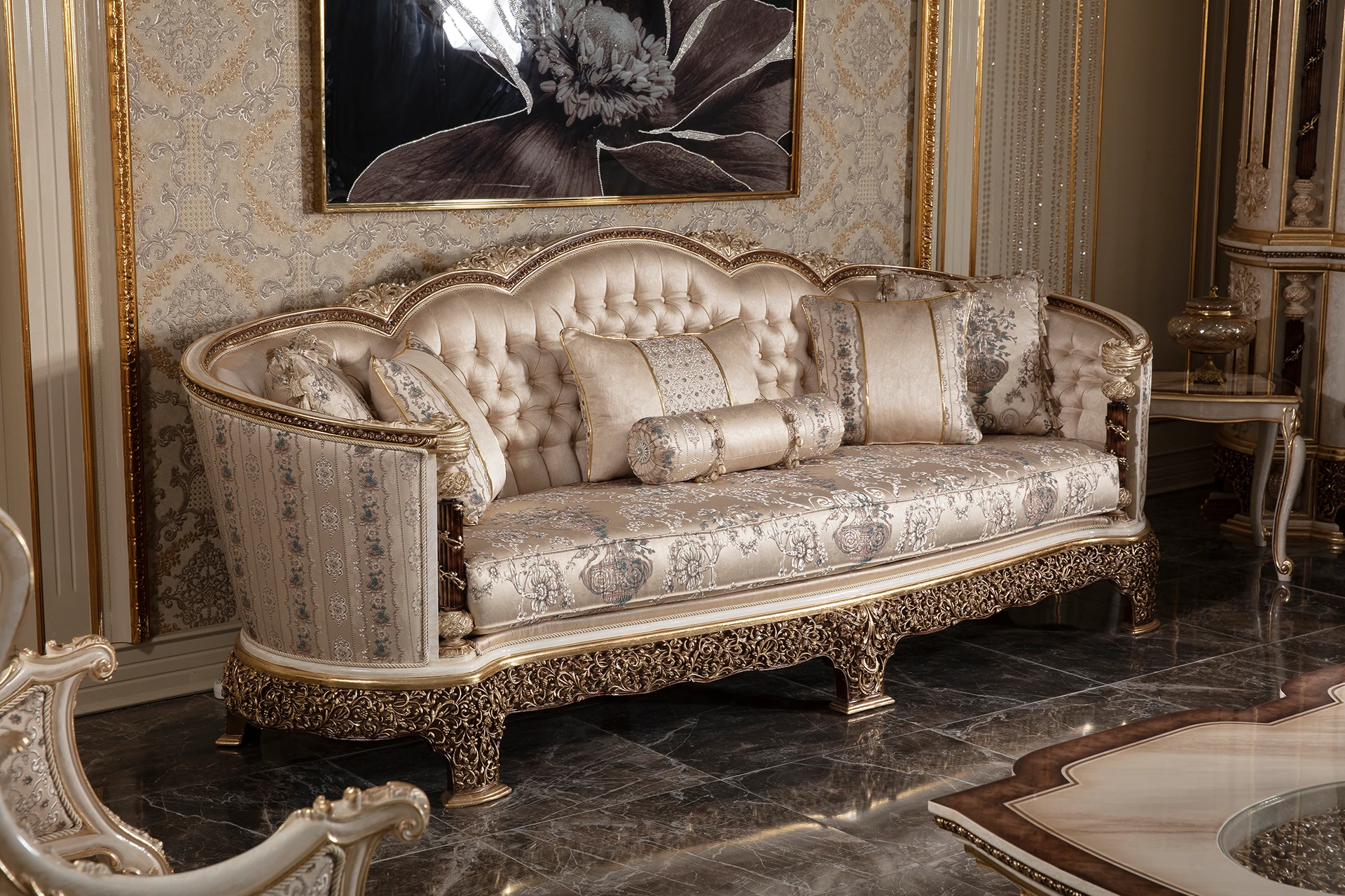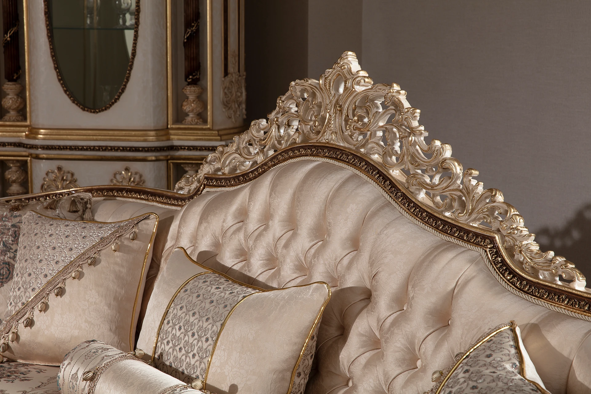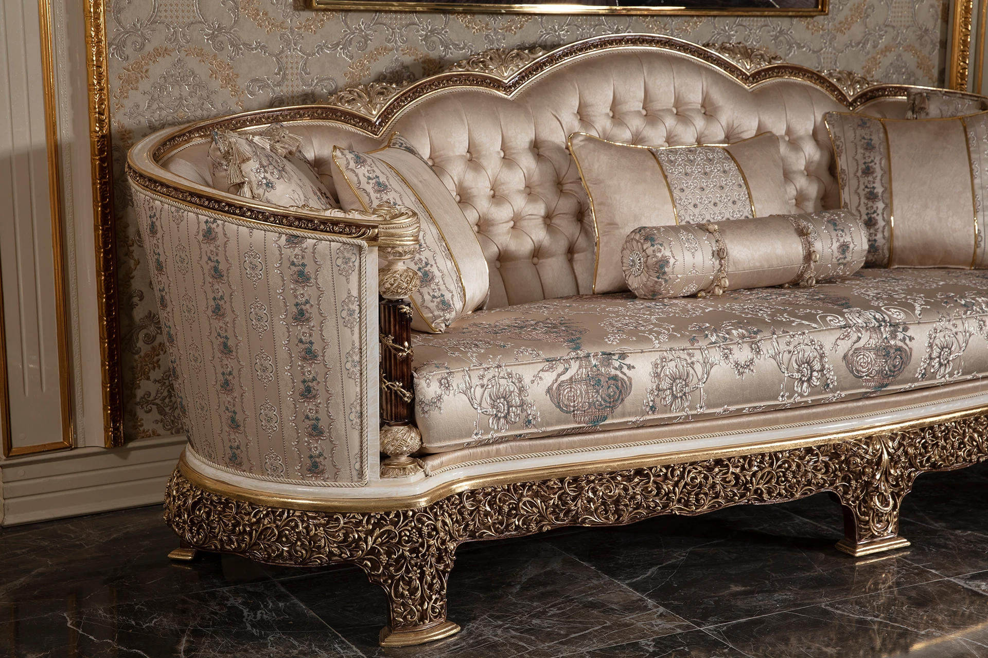 The Monaco sofa set exudes timeless elegance and sophistication. Crafted with luxurious upholstery and intricate detailing, this set transforms any living space into a royal retreat. The sofas feature a classic curved design, adorned with ornate carvings that showcase fine craftsmanship. Plush cushions and tufted backrests offer supreme comfort, while the rich fabric patterns and soft hues add a touch of refined luxury. Complemented by an opulent coffee table with detailed carvings and glass inserts, this sofa set is perfect for creating a grand and inviting atmosphere in the living room.