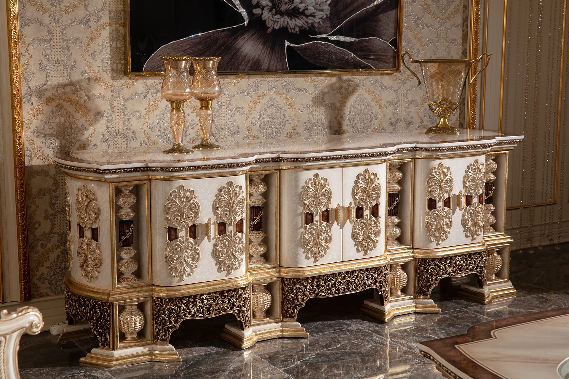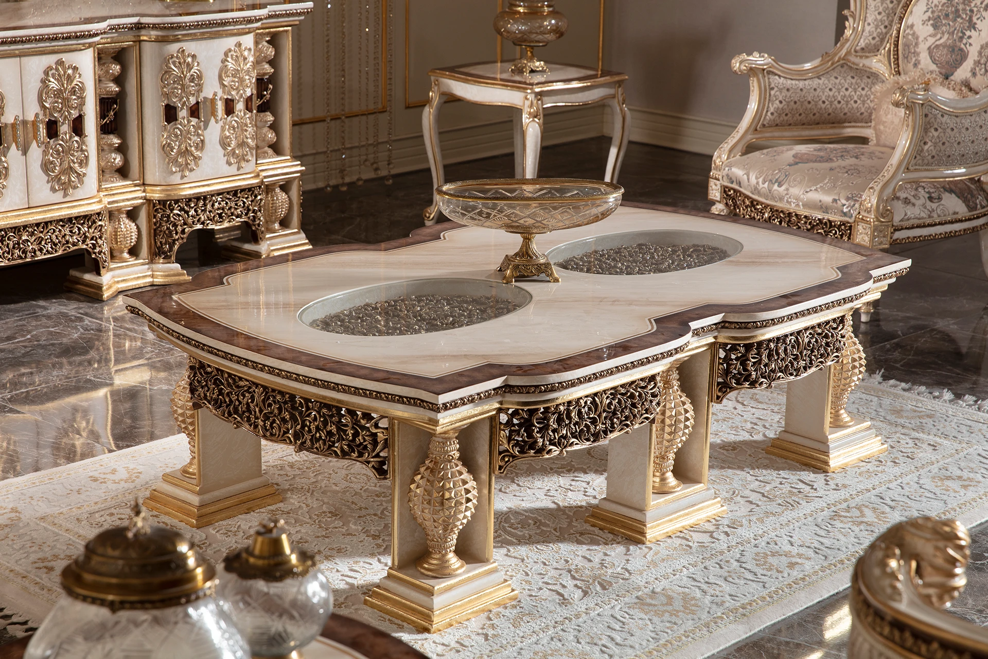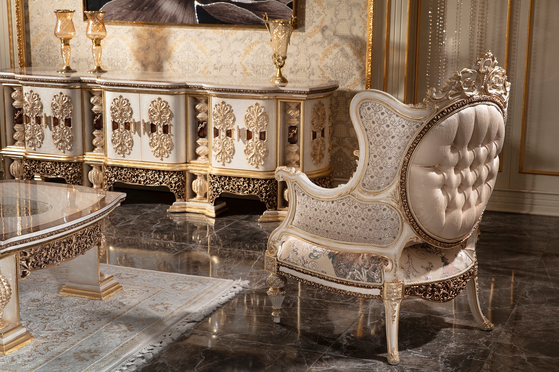 The Monaco sofa set exudes timeless elegance and sophistication. Crafted with luxurious upholstery and intricate detailing, this set transforms any living space into a royal retreat. The sofas feature a classic curved design, adorned with ornate carvings that showcase fine craftsmanship. Plush cushions and tufted backrests offer supreme comfort, while the rich fabric patterns and soft hues add a touch of refined luxury. Complemented by an opulent coffee table with detailed carvings and glass inserts, this sofa set is perfect for creating a grand and inviting atmosphere in the living room.