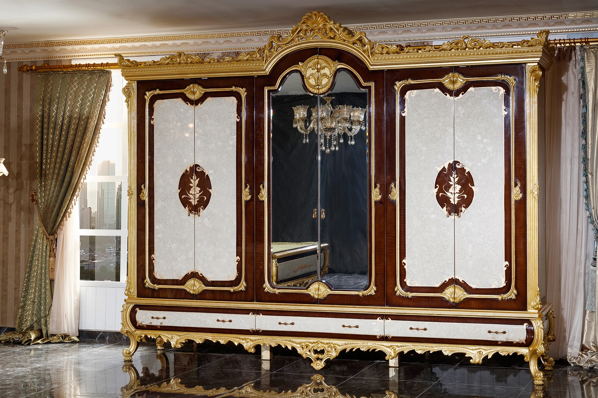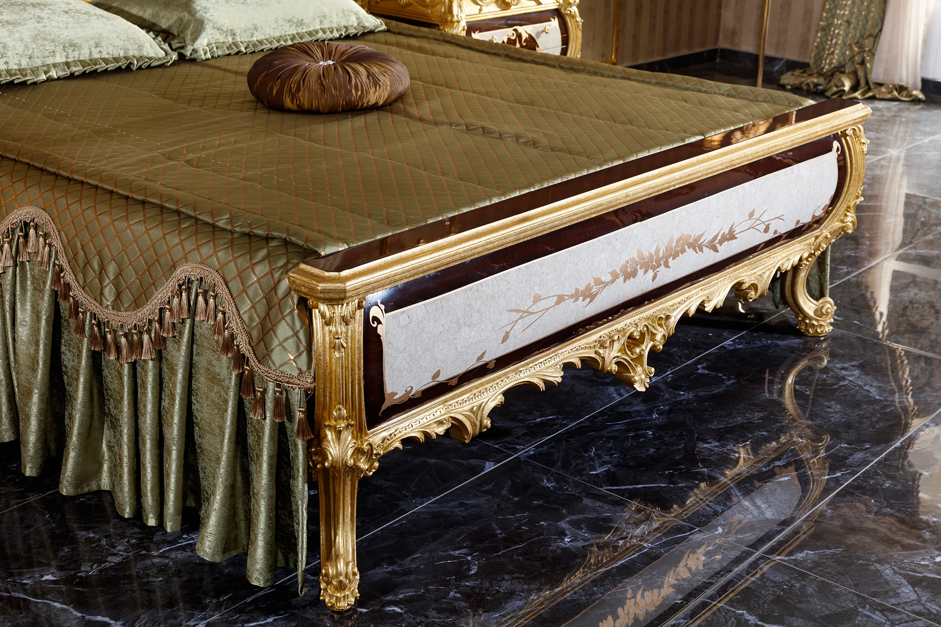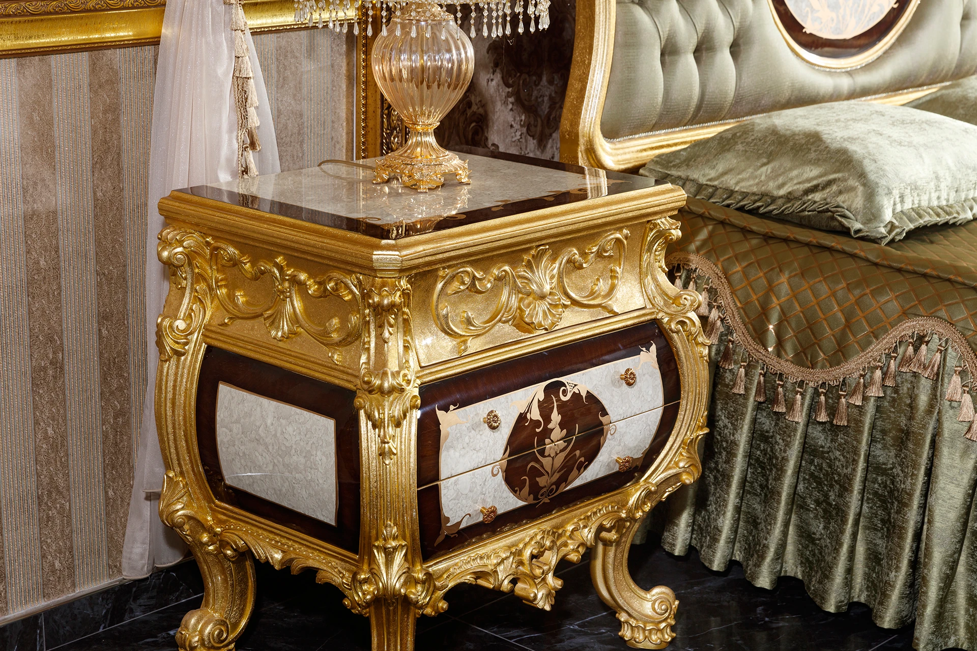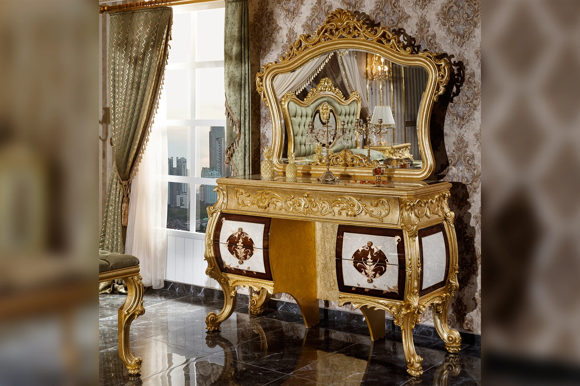 The Monica bedroom set brings a regal charm to any space, featuring intricate carvings and lavish gold accents. The bed, adorned with a tufted headboard and elegant drapery, serves as the centerpiece of the room, exuding opulence. Matching nightstands and a grand dresser with a beautifully framed mirror enhance the luxurious feel. Detailed artistry and ornate patterns showcase classic sophistication, making this set perfect for those who appreciate timeless, majestic decor.