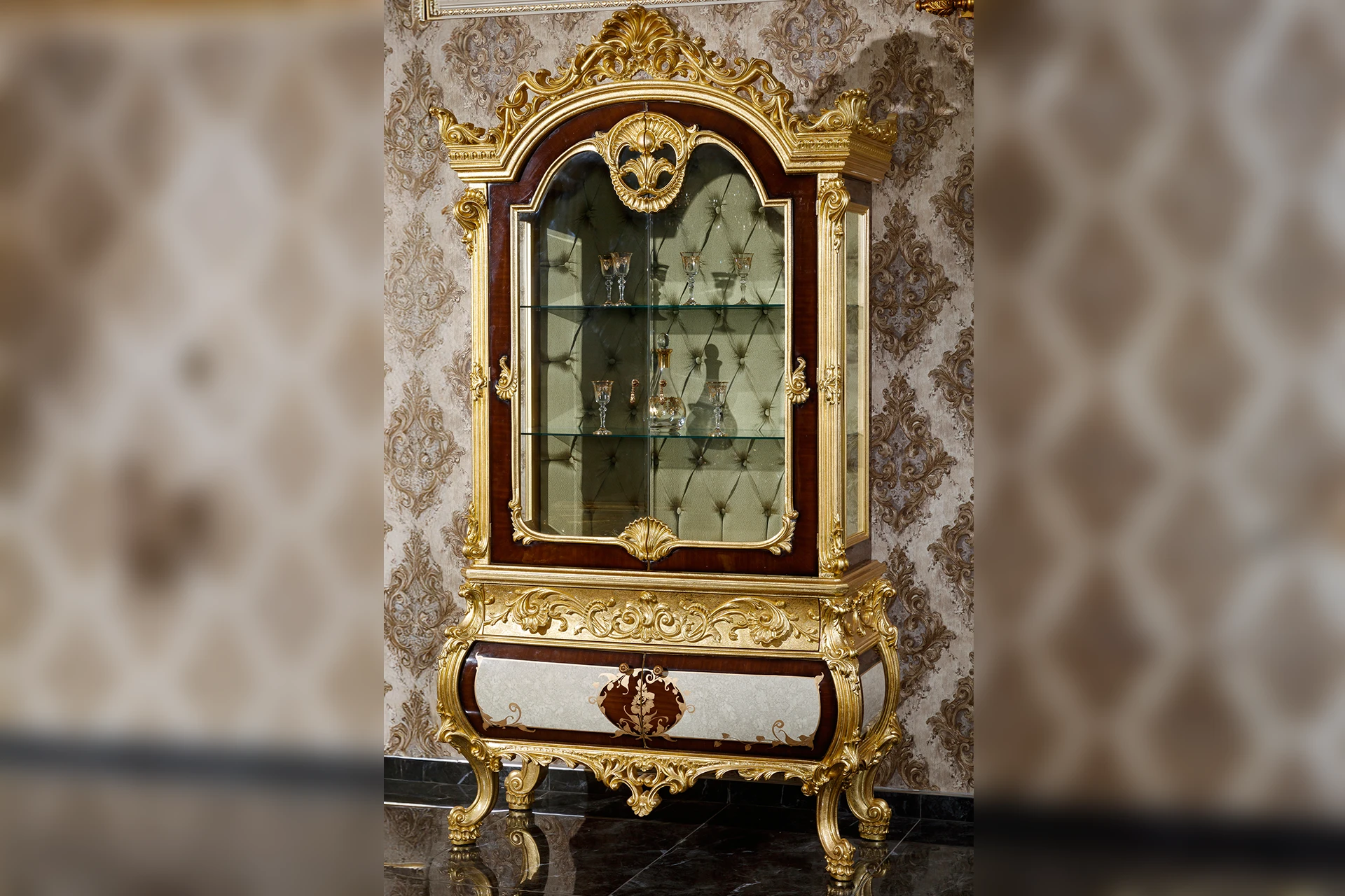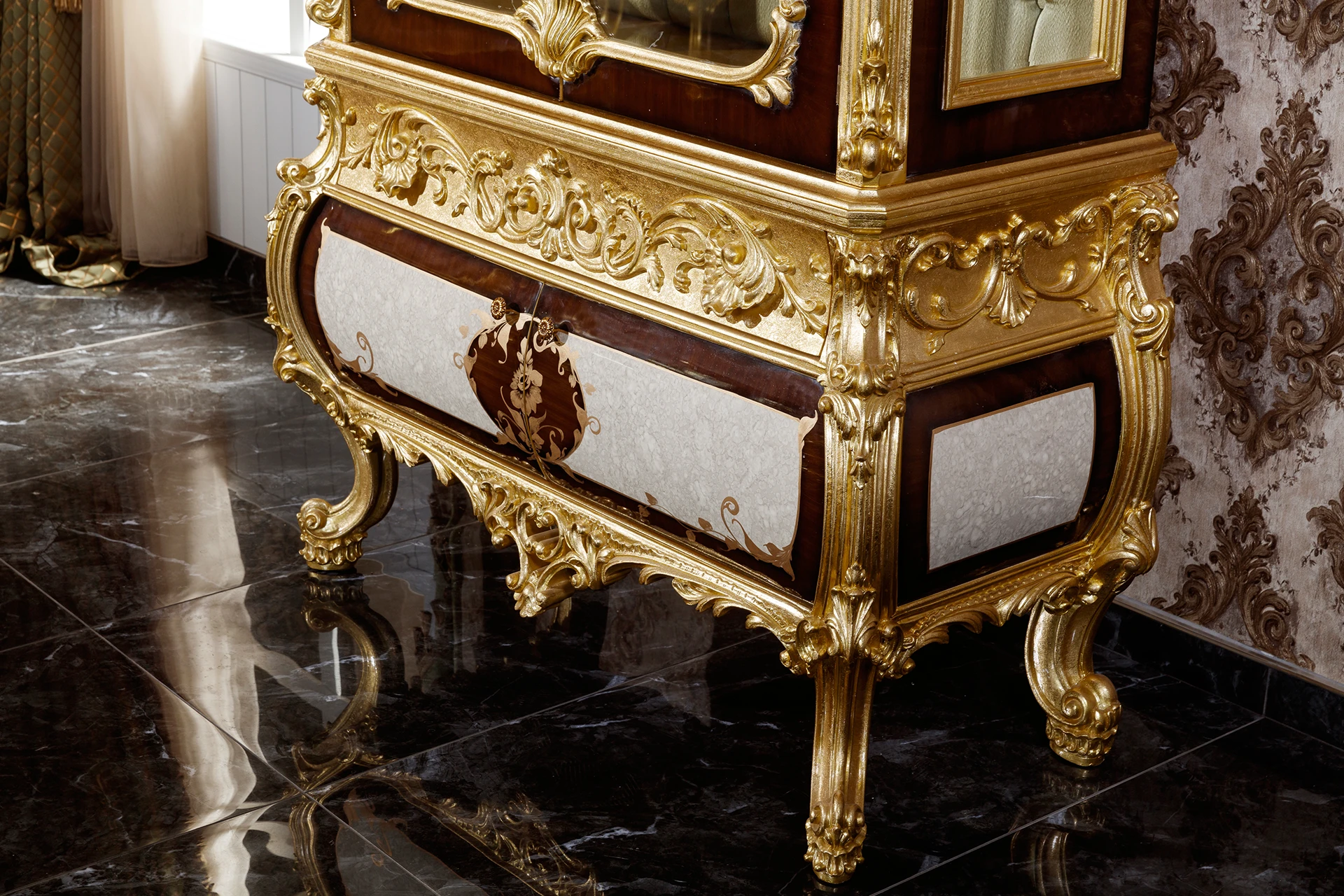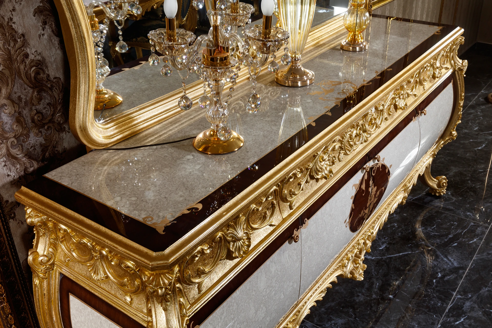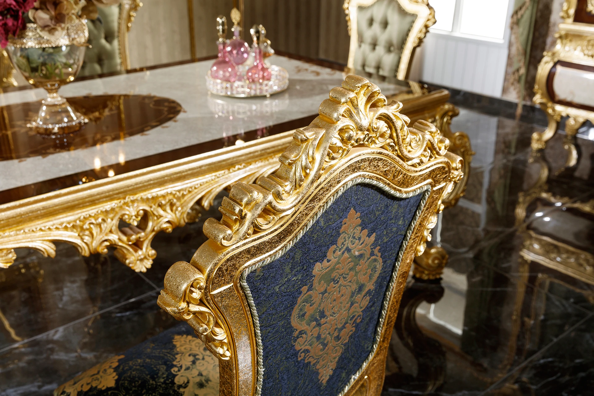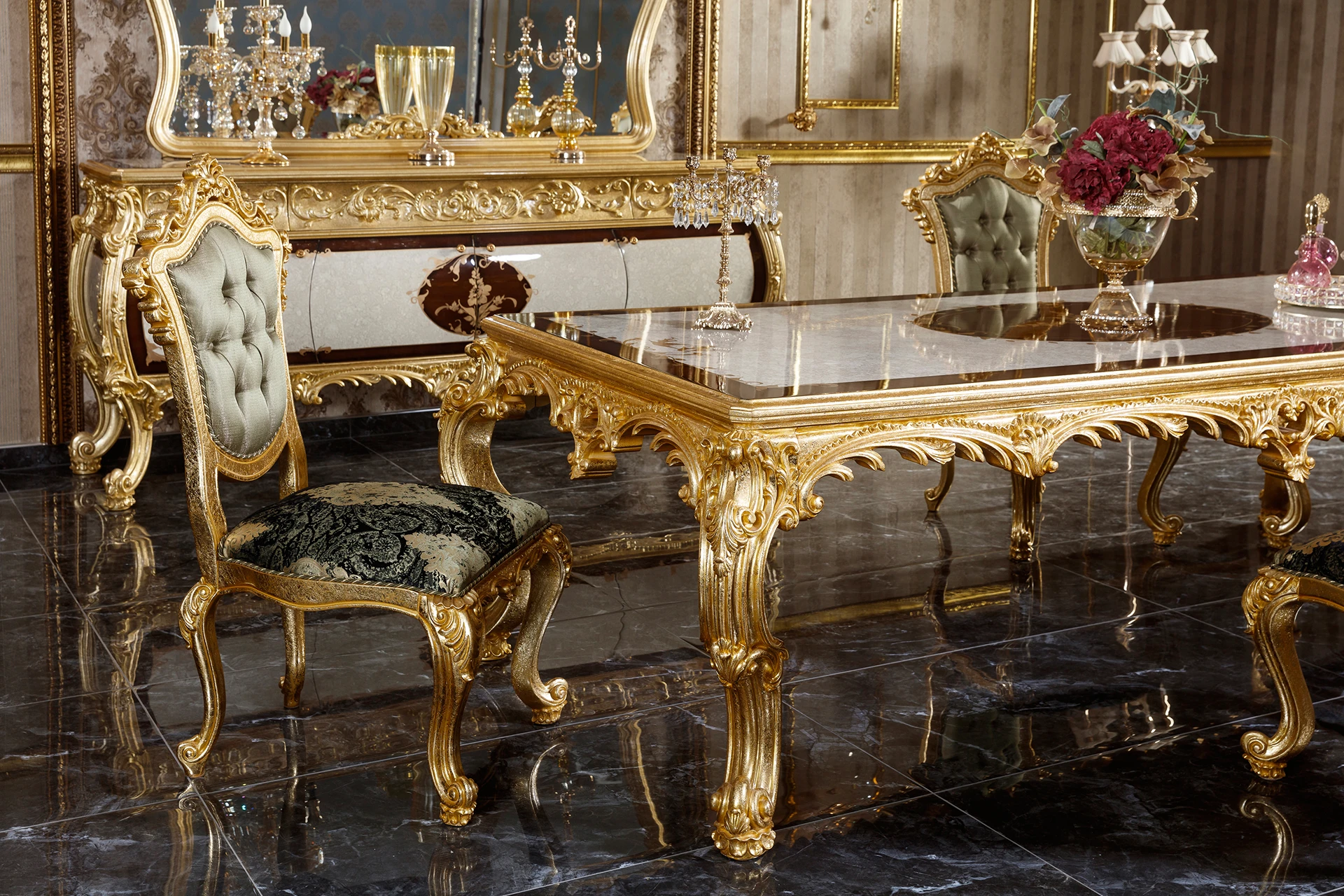 The Monica dining room set exudes grandeur with its intricate carvings and lavish gold finish. The table, with its ornate legs and richly detailed surface, becomes the focal point of the room. Matching chairs feature luxurious upholstery and elegant design, offering both comfort and style. The buffet and display cabinet, adorned with classical motifs, provide ample storage and display options. This set captures the essence of regal dining, perfect for those who appreciate classic elegance and a sophisticated ambiance.