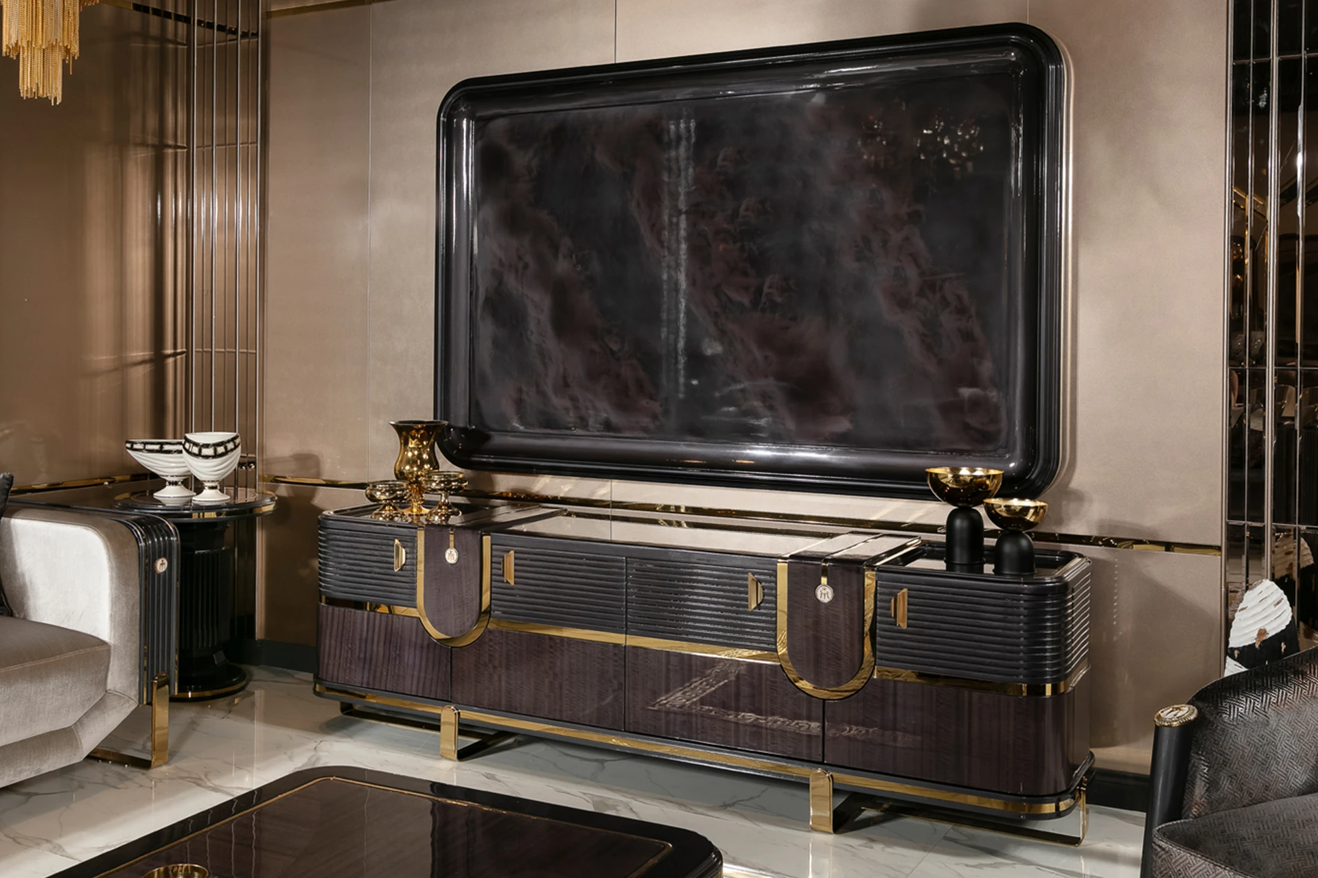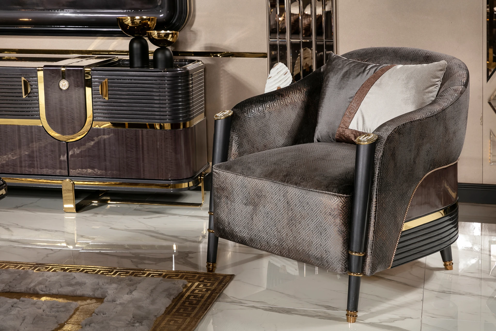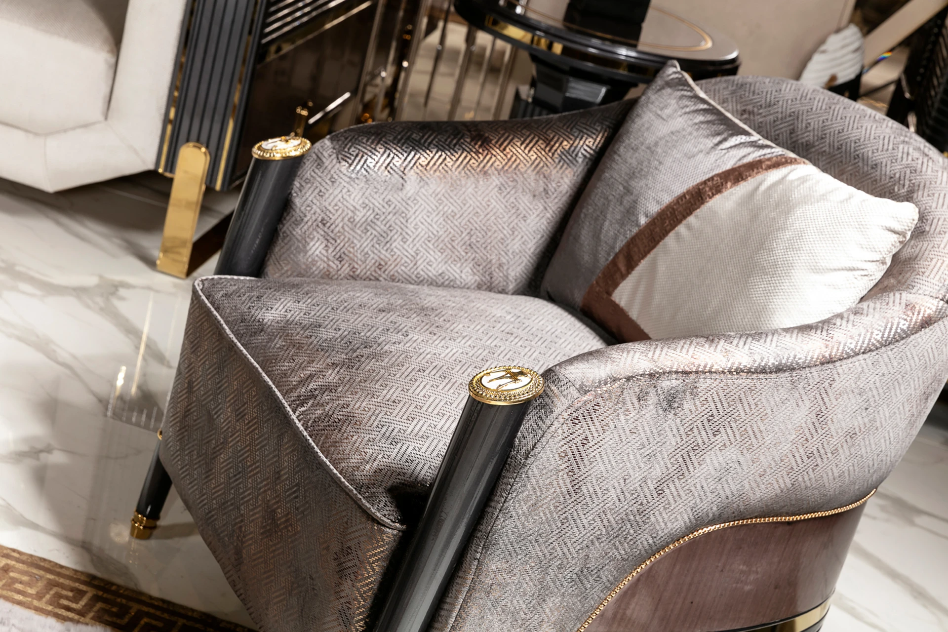 The Monna sofa set offers a bold fusion of modern design and luxurious materials, perfect for elevating any living space. Featuring sleek lines, the set is wrapped in premium fabrics that exude comfort and sophistication. The gold accents and unique geometric details on the armrests and base add a touch of opulence. The plush cushions complement the sturdy frame, ensuring both style and durability. Whether for formal settings or cozy evenings, the Monna sofa set stands as a statement piece, seamlessly blending contemporary aesthetics with timeless elegance.