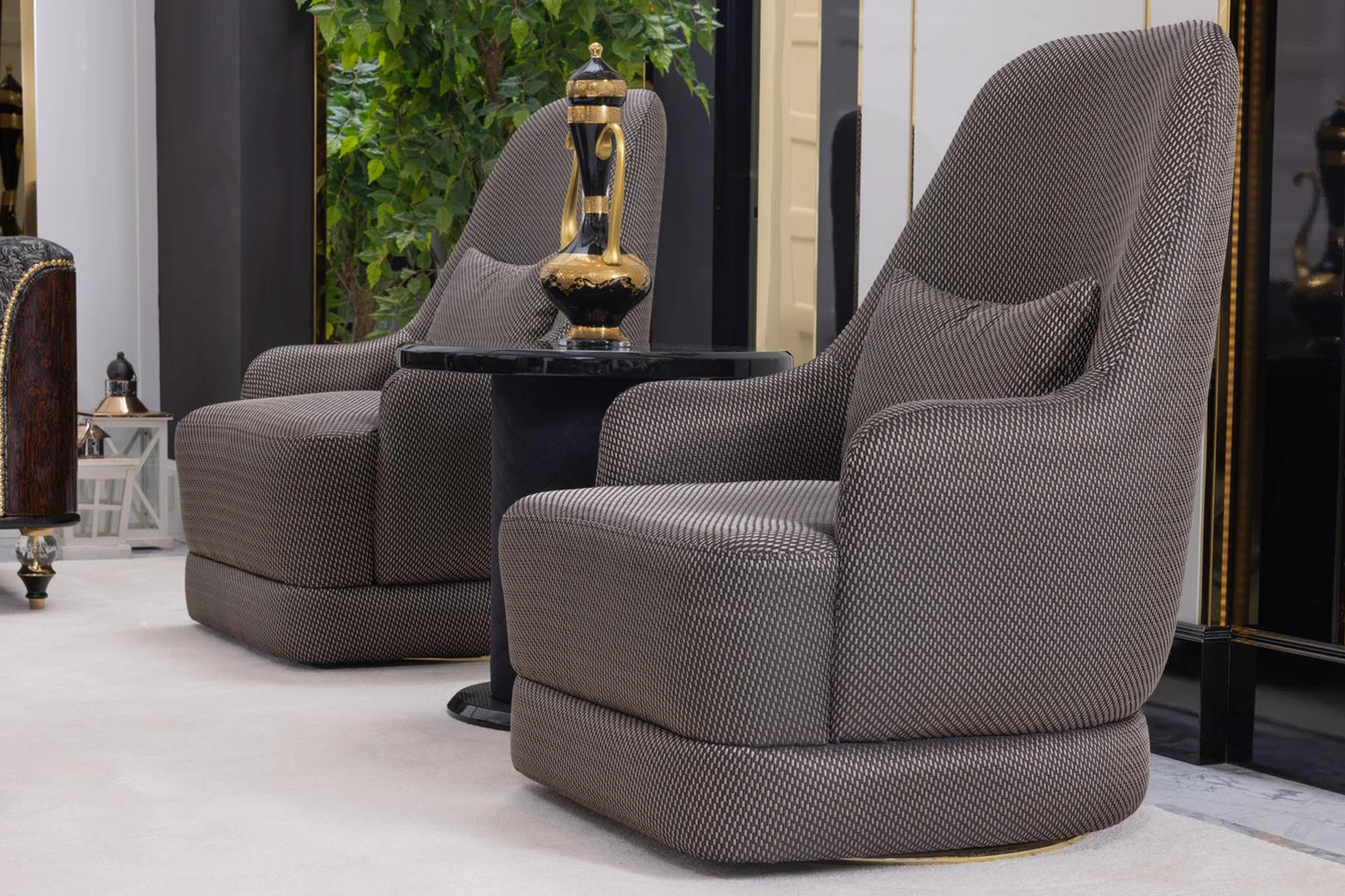 The Mora sofa set brings an aura of elegance and luxury into any living room. This set features a sophisticated blend of rich upholstery and a glossy wood finish that highlights its refined design. The sofa’s tufted backrest and cushioned arms offer both comfort and style, while the intricate detailing along the edges adds a touch of classic grandeur. Accompanied by sleek accent chairs with a modern silhouette, this set makes a bold statement. Its neutral color palette ensures versatility, easily complementing various decor styles for a truly upscale living space.