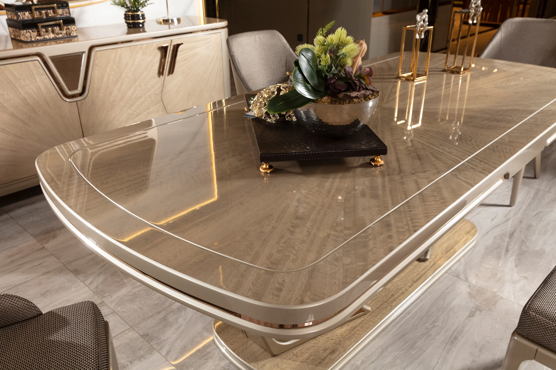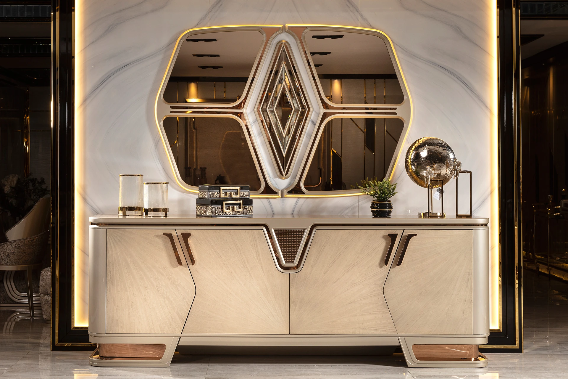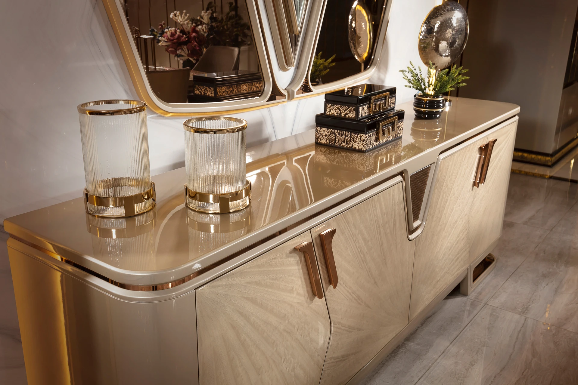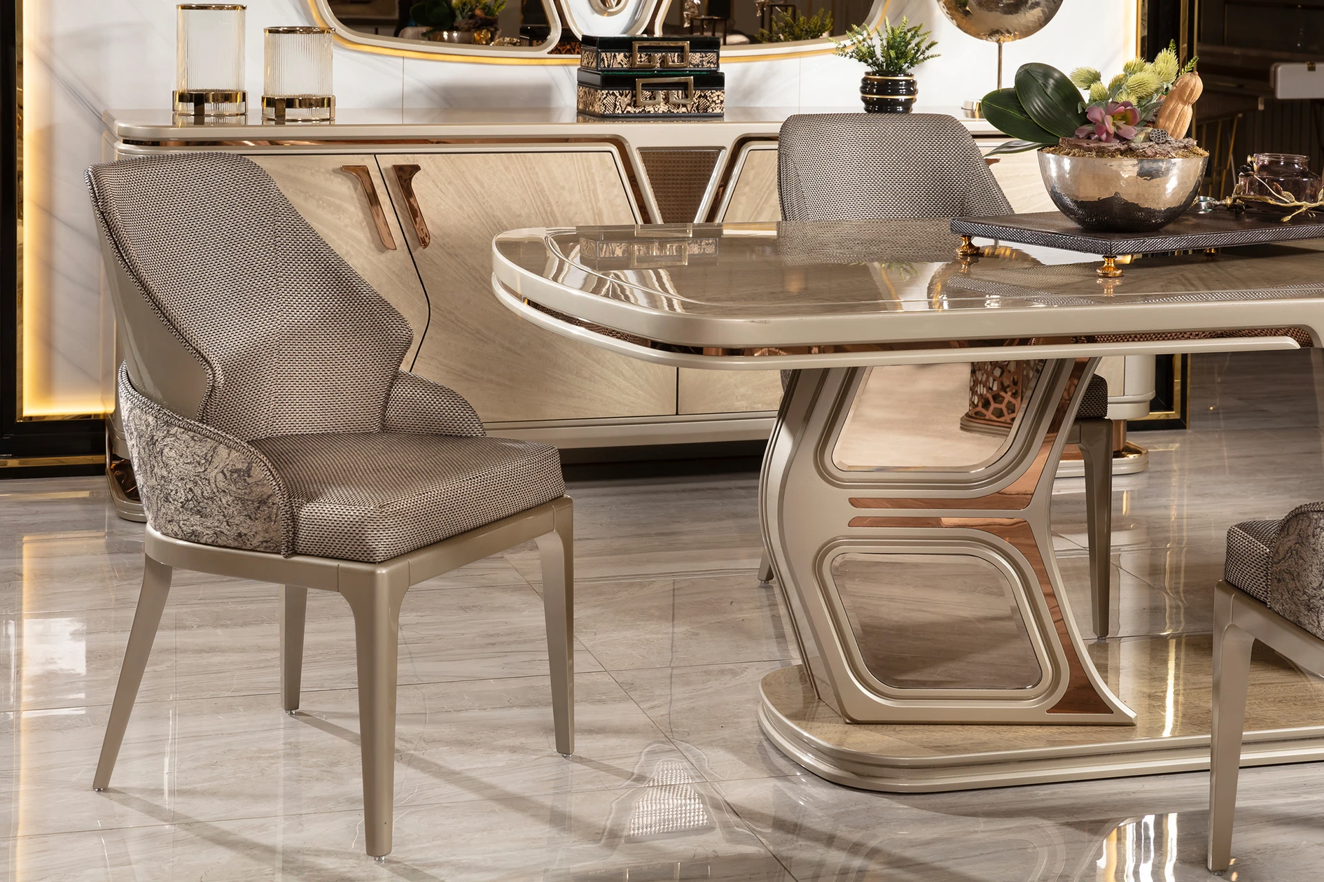 Redefine elegance in your dining space with the Motto dining room set. Featuring a stunning combination of luxurious materials and exquisite craftsmanship, this set embodies modern sophistication. The sleek dining table with its glossy finish is complemented by intricately designed chairs, upholstered for maximum comfort. The accompanying sideboard, with its elegant mirror and ample storage, adds a touch of glamor to your dining experience. Perfect for both everyday dining and special occasions, the motto dining room set brings style and grace to any home.