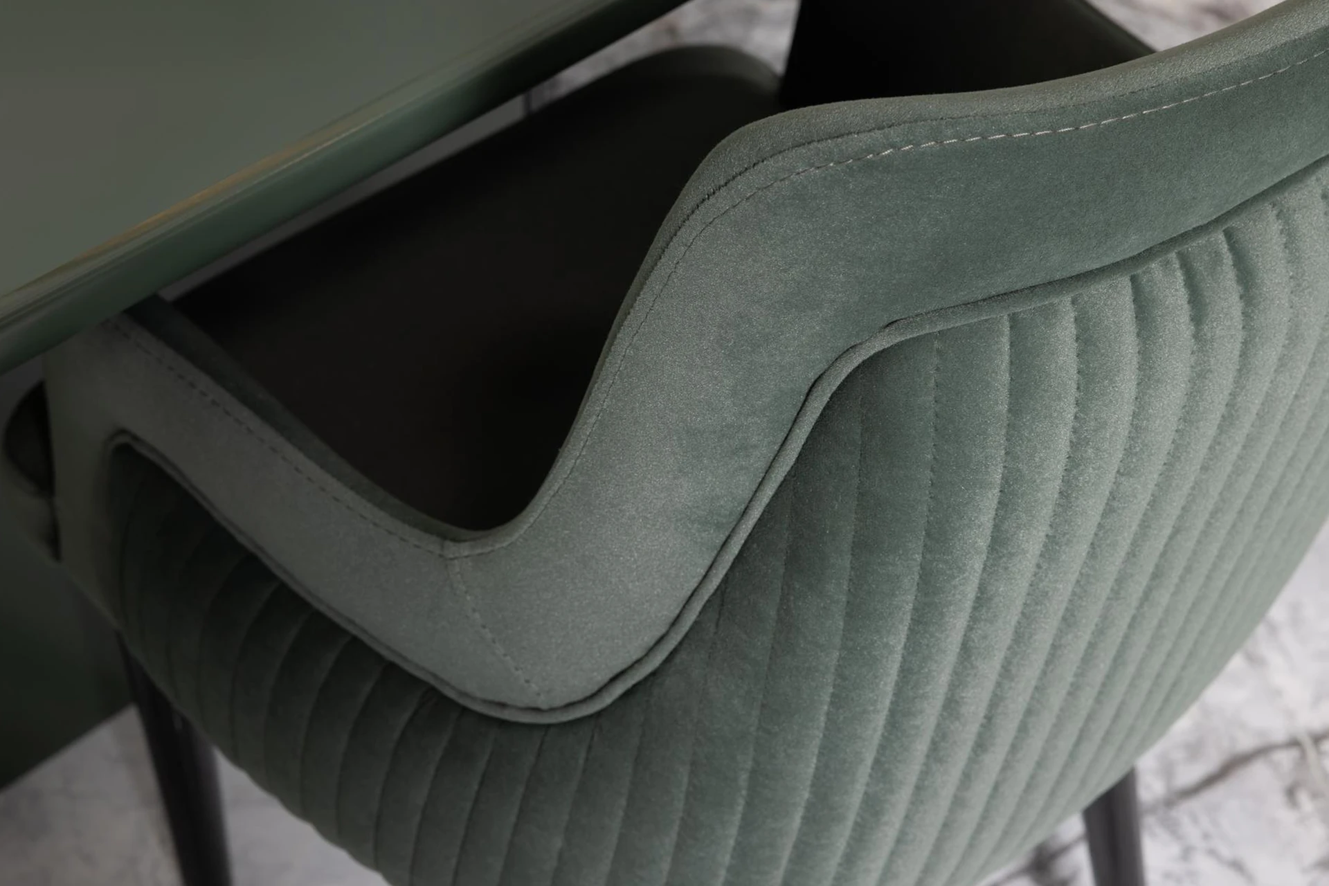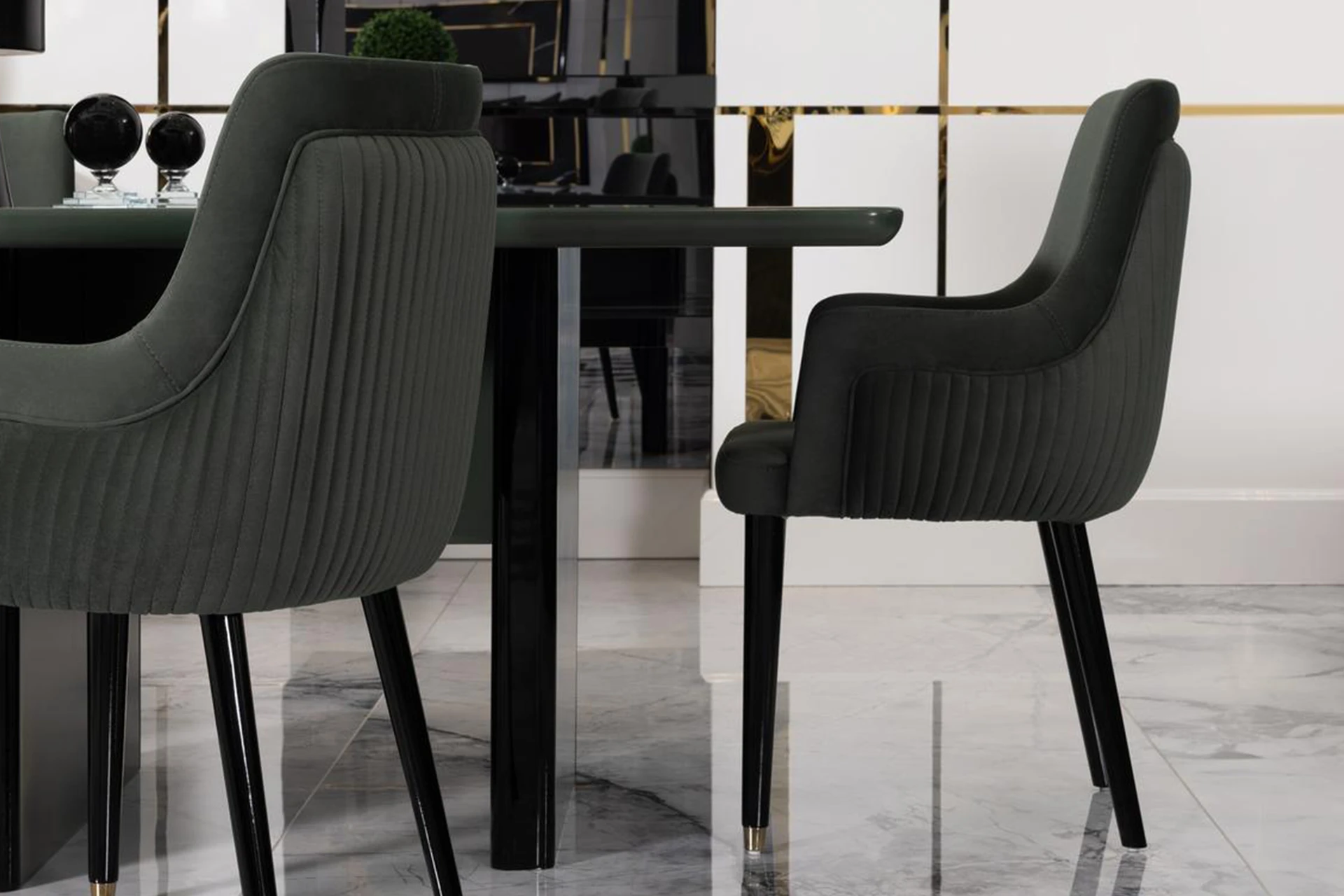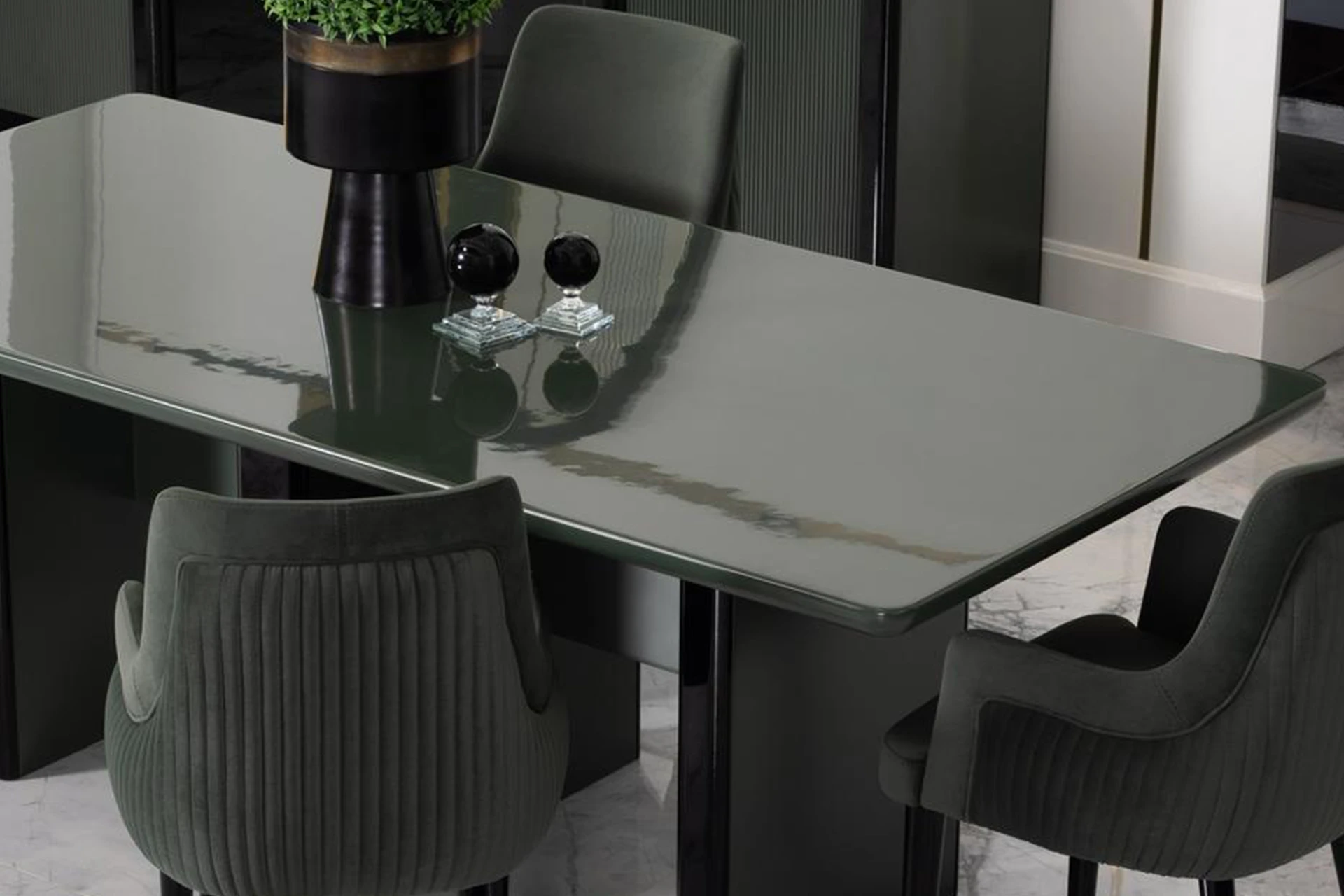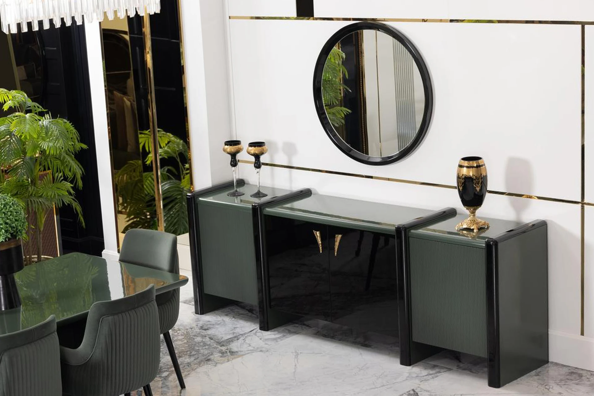 The Mugla dining room set blends modern elegance with a bold, deep green color palette. The sleek dining table, featuring a solid, glossy surface, is complemented by plush chairs with ribbed detailing that exude comfort and sophistication. The set is further enhanced by a matching buffet, adorned with gold accents and a large circular mirror, adding a touch of luxury and depth to the space. This combination of dark hues, luxurious textures, and minimalist lines creates a refined atmosphere perfect for formal dining experiences.
