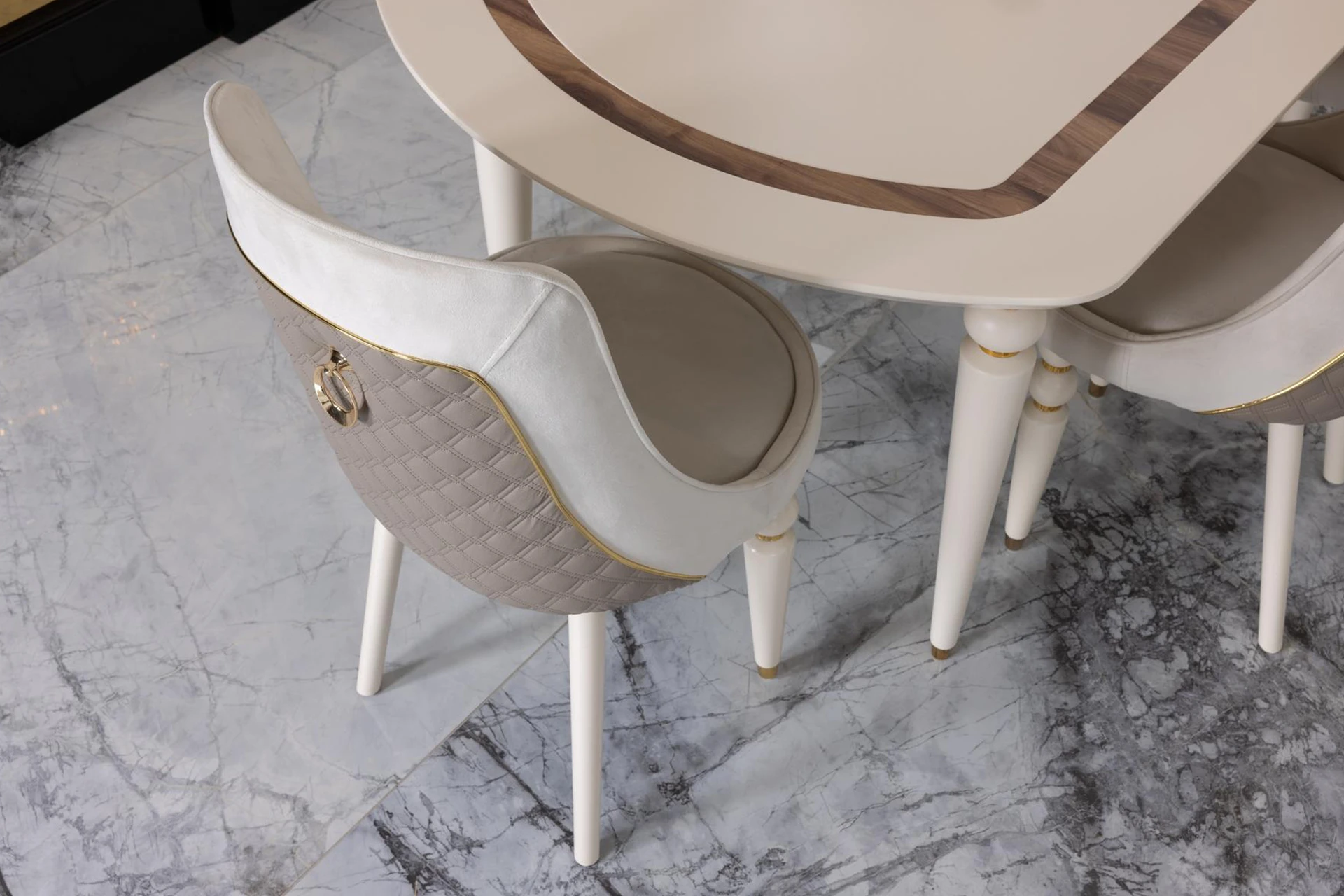 The Nisa dining room set radiates timeless elegance with its light-toned design. The oval dining table, supported by gracefully curved legs, creates a welcoming atmosphere. Upholstered chairs with quilted backs and gold ring accents add a modern touch, while maintaining comfort. The matching buffet, adorned with a round mirror and subtle gold details, offers both style and functionality. This set brings an air of sophistication to any dining space, perfect for both casual and formal gatherings.