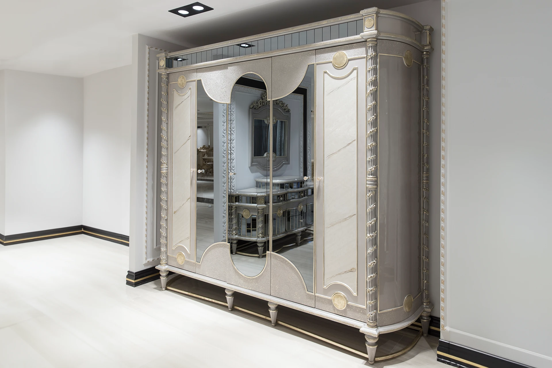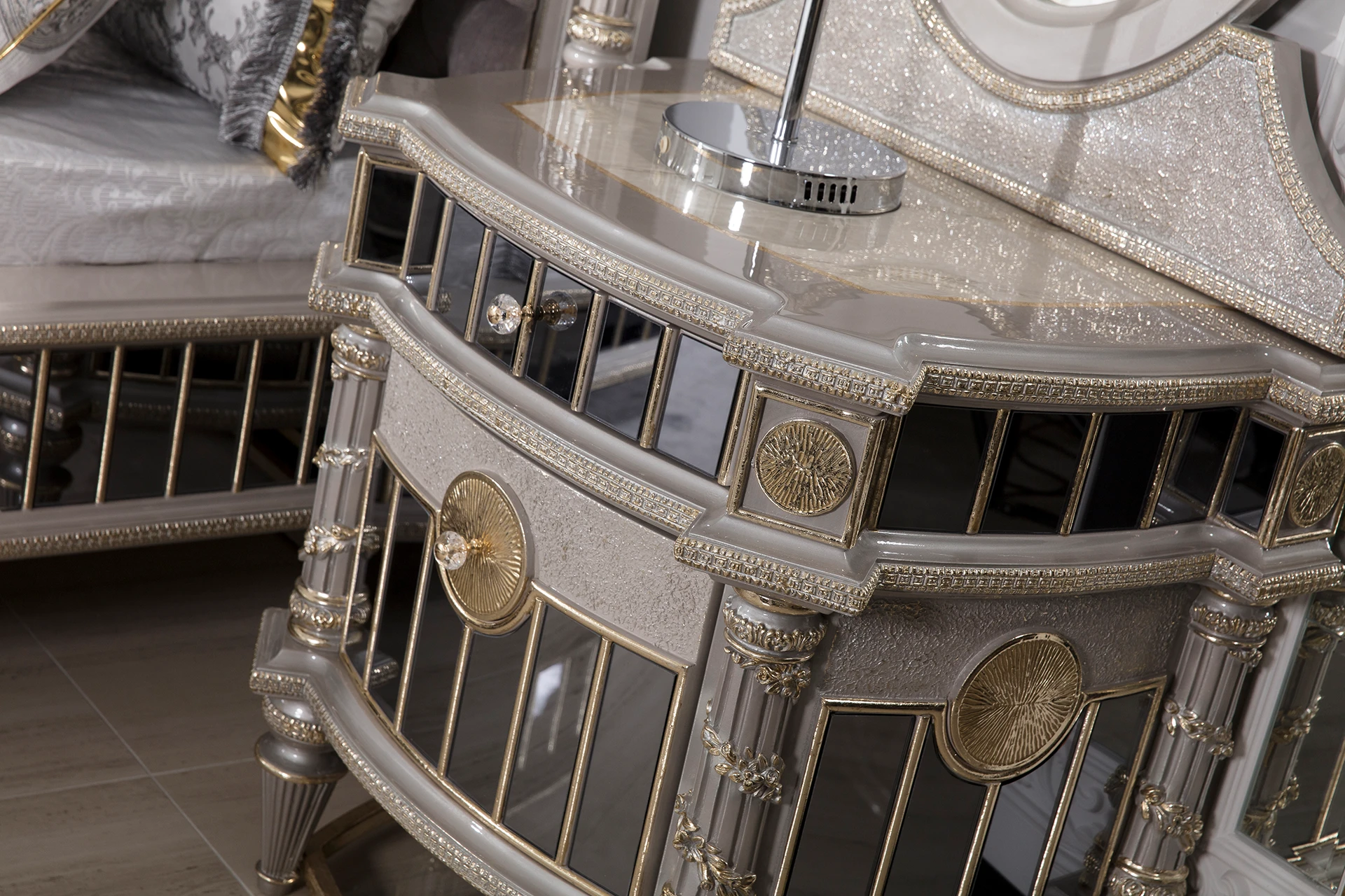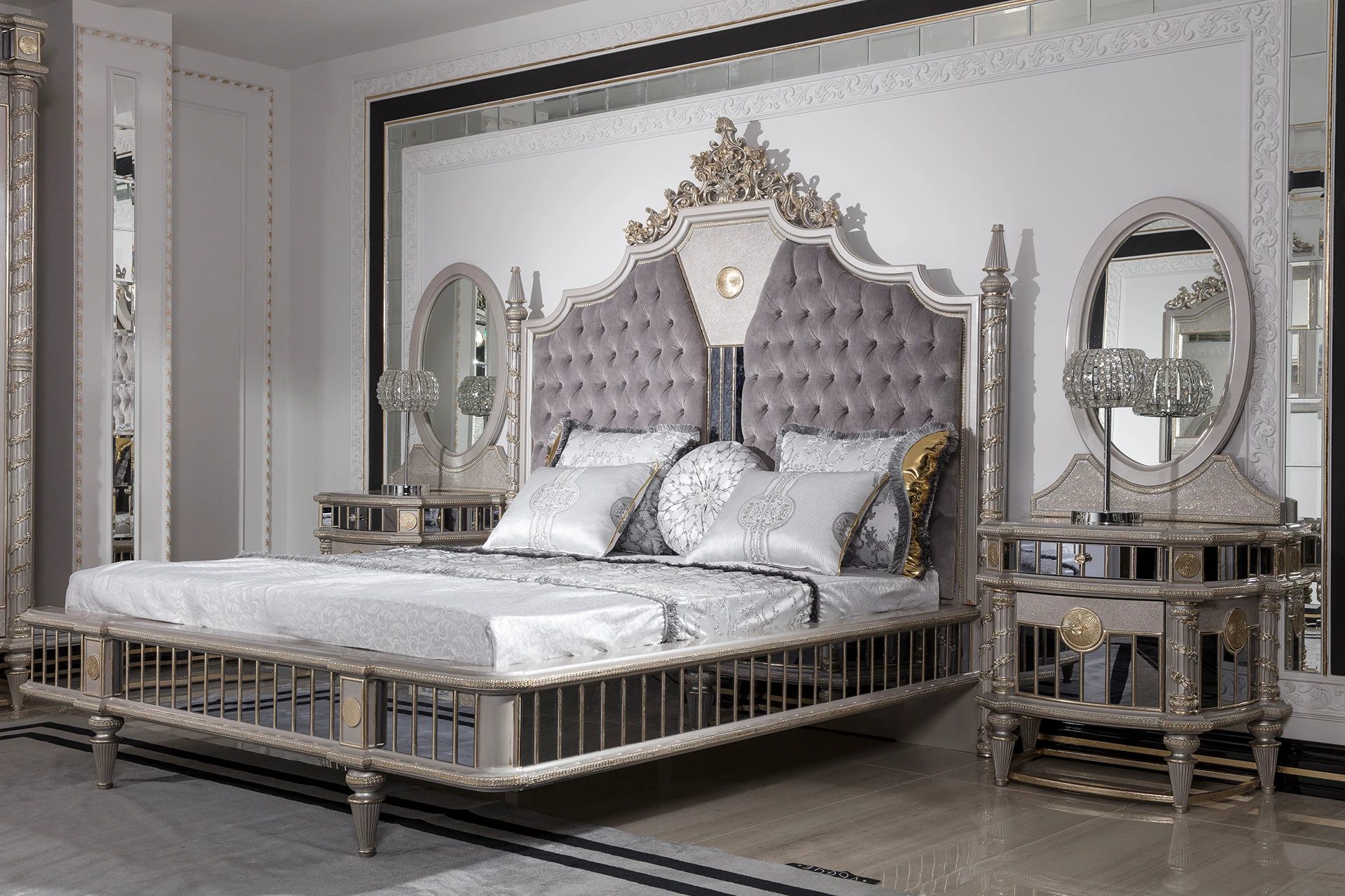 The Nora bedroom set exudes modern elegance with its sleek design and luxurious finishes. The bed features a high, tufted headboard adorned with intricate detailing, adding a regal touch to the overall aesthetic. The accompanying wardrobe boasts a sophisticated mirrored facade, enhancing the sense of space and light in the room. Complementing the set are the nightstands, designed with reflective surfaces and rounded edges, providing a seamless blend of form and function. The neutral color palette and subtle gold accents make this set perfect for those who desire a contemporary yet classic look in their bedroom sanctuary.