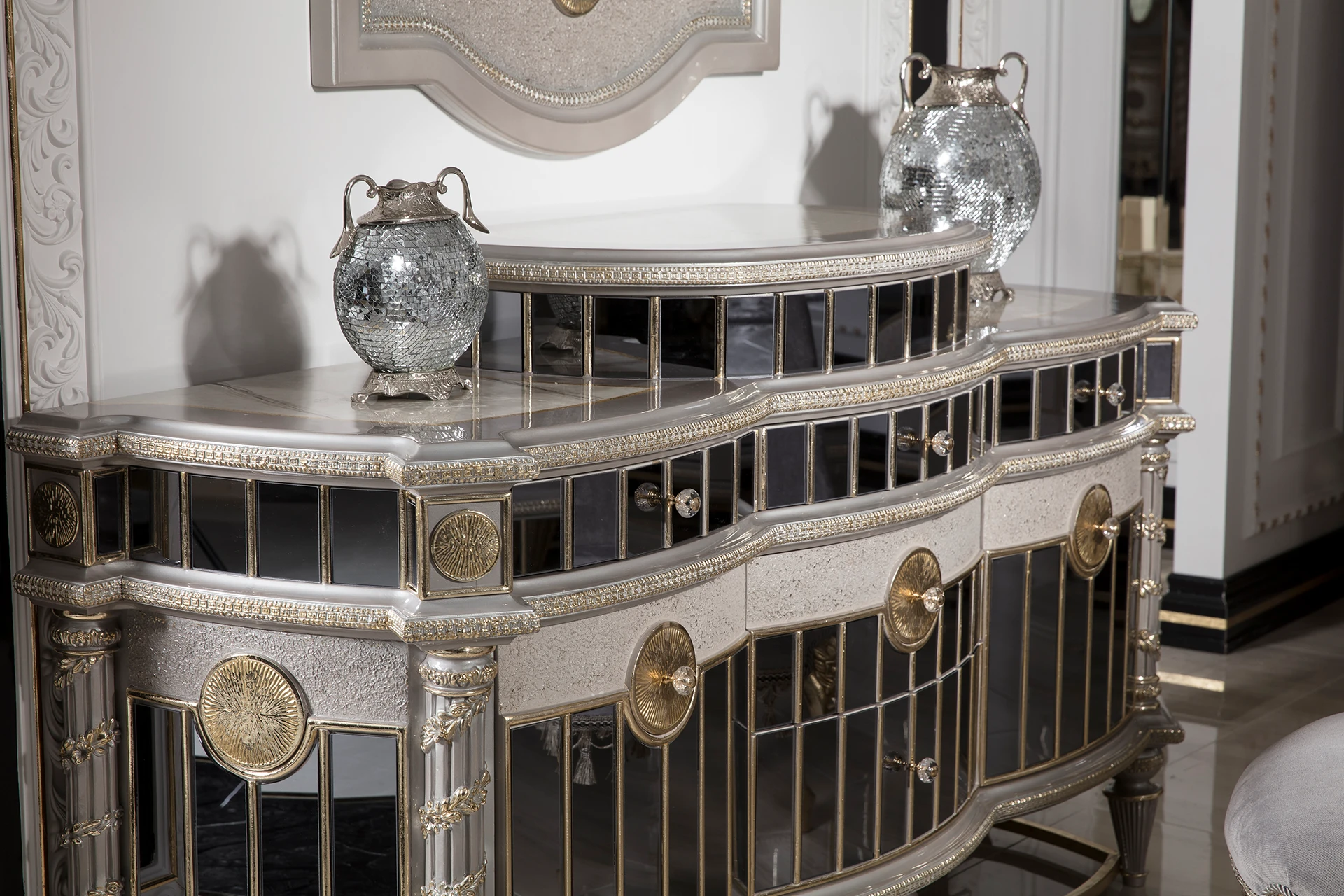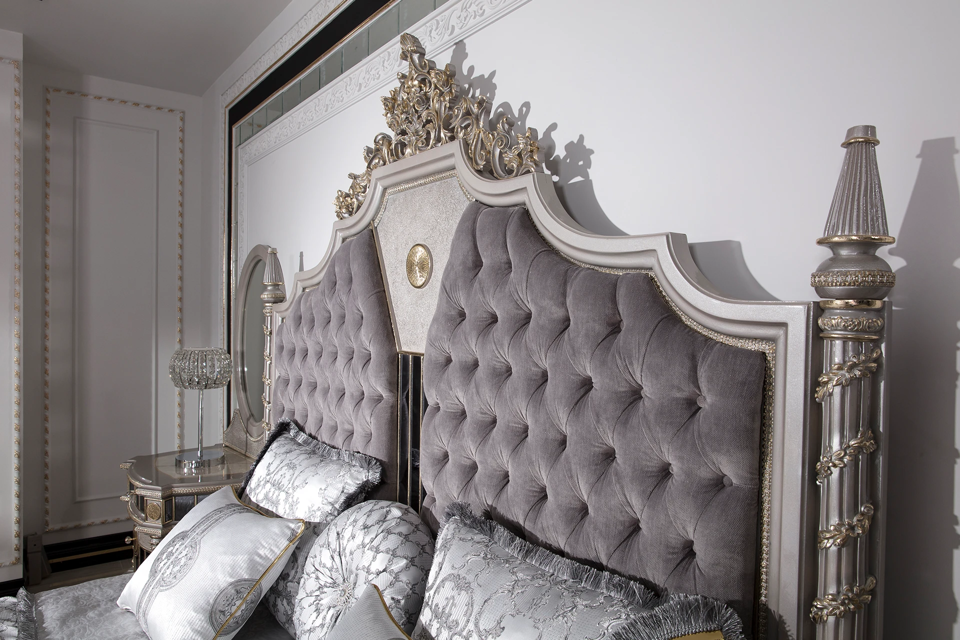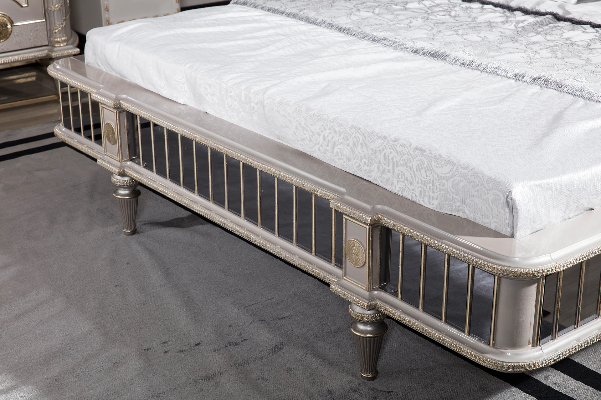 The Nora bedroom set exudes modern elegance with its sleek design and luxurious finishes. The bed features a high, tufted headboard adorned with intricate detailing, adding a regal touch to the overall aesthetic. The accompanying wardrobe boasts a sophisticated mirrored facade, enhancing the sense of space and light in the room. Complementing the set are the nightstands, designed with reflective surfaces and rounded edges, providing a seamless blend of form and function. The neutral color palette and subtle gold accents make this set perfect for those who desire a contemporary yet classic look in their bedroom sanctuary.
