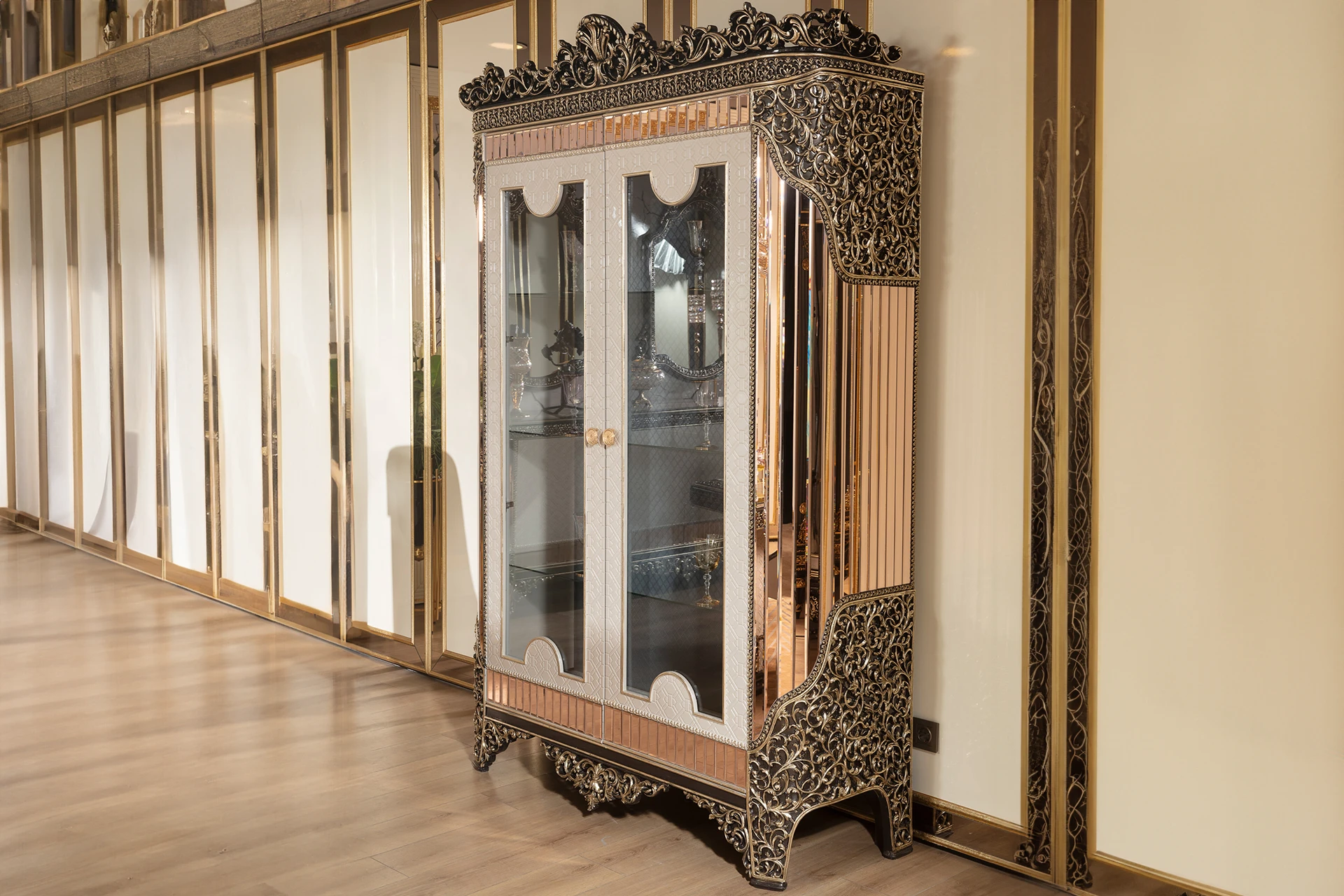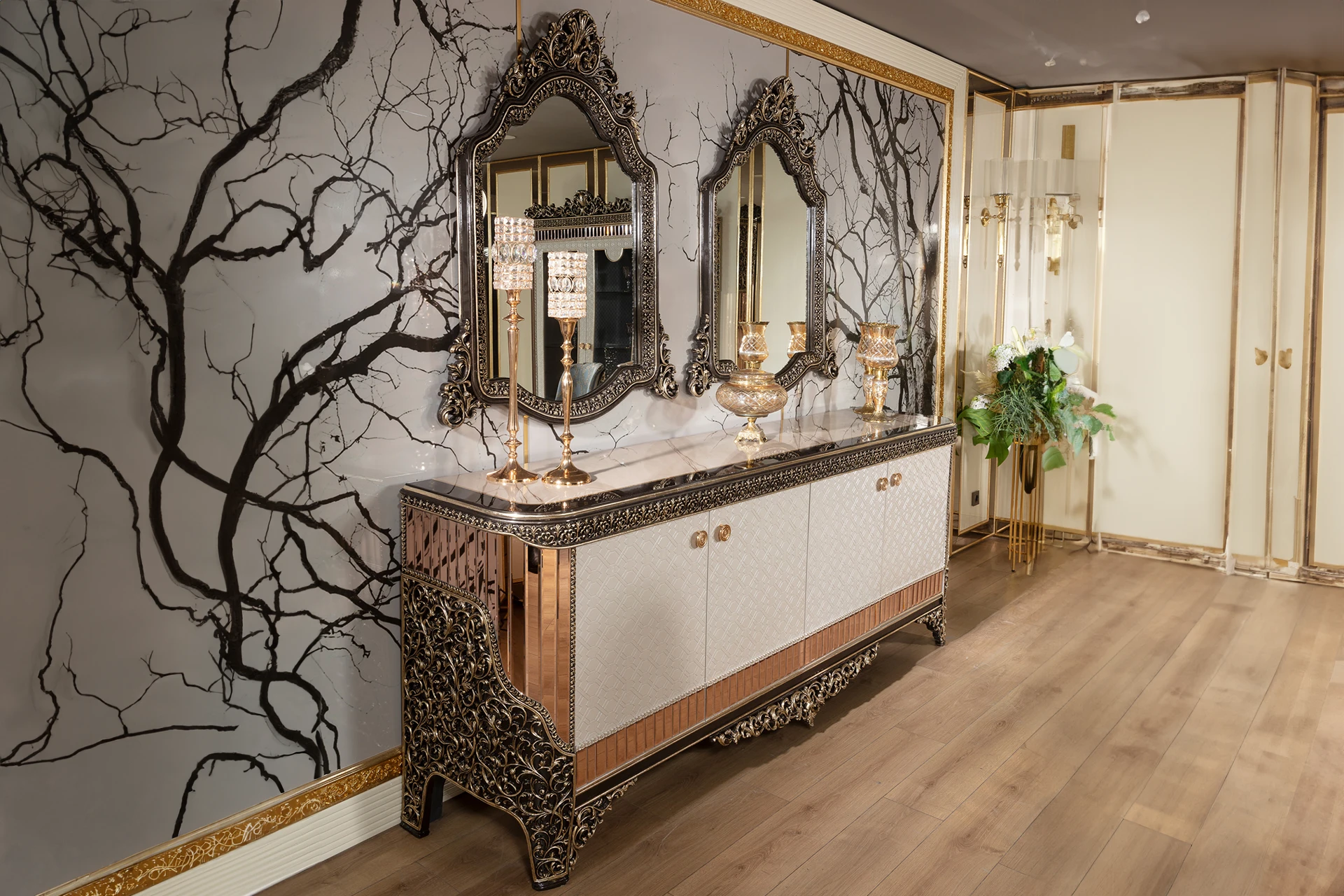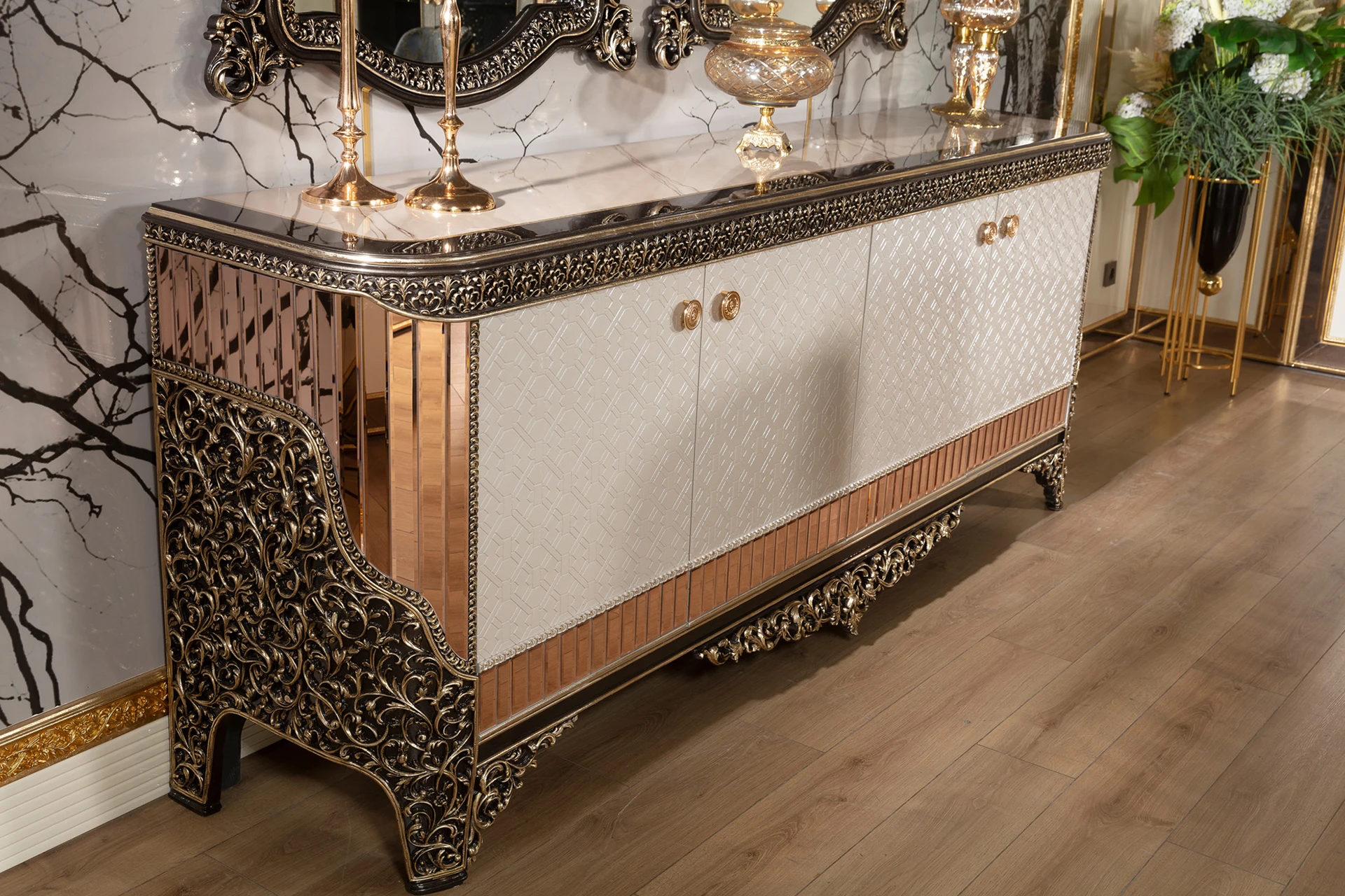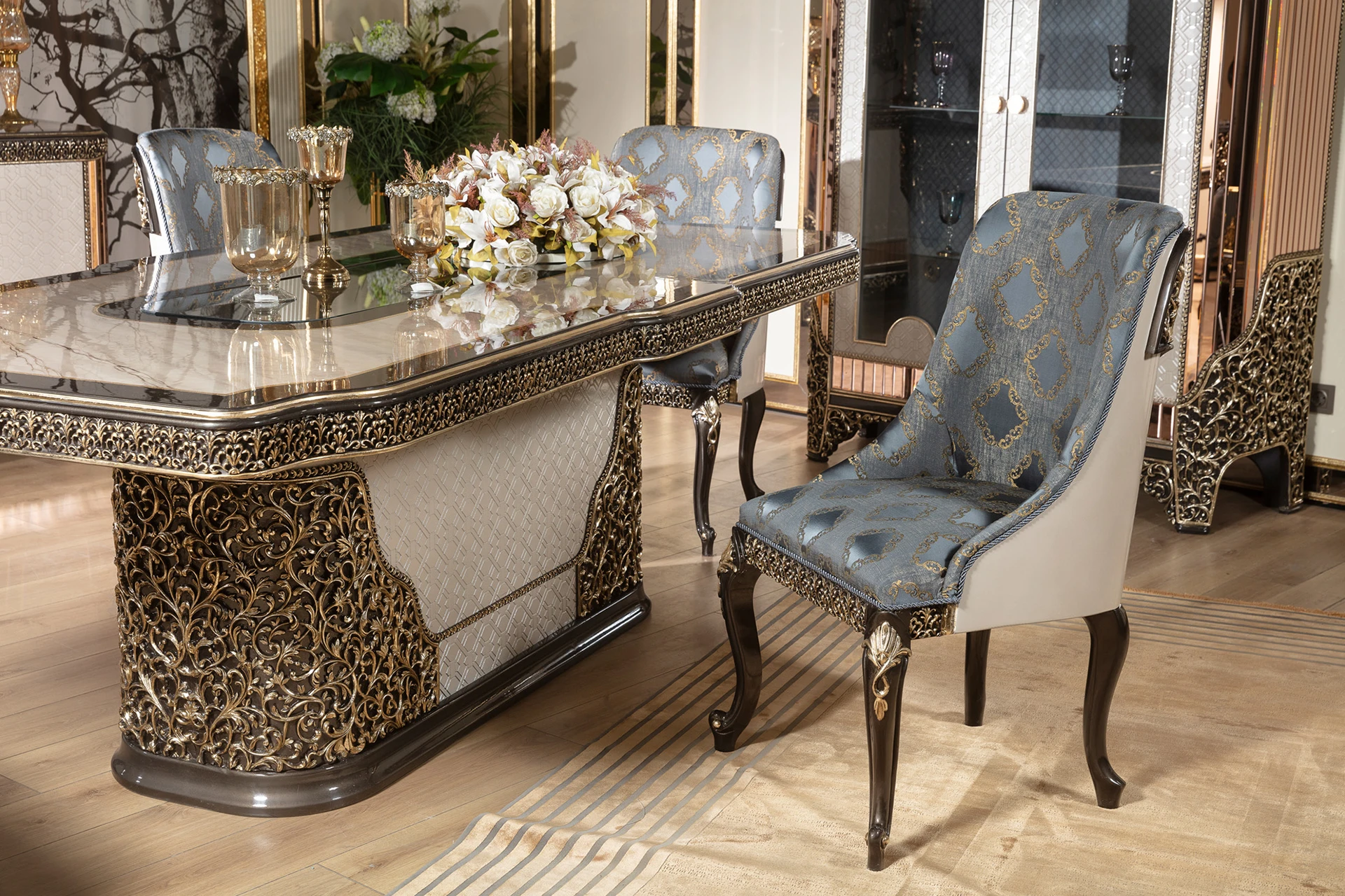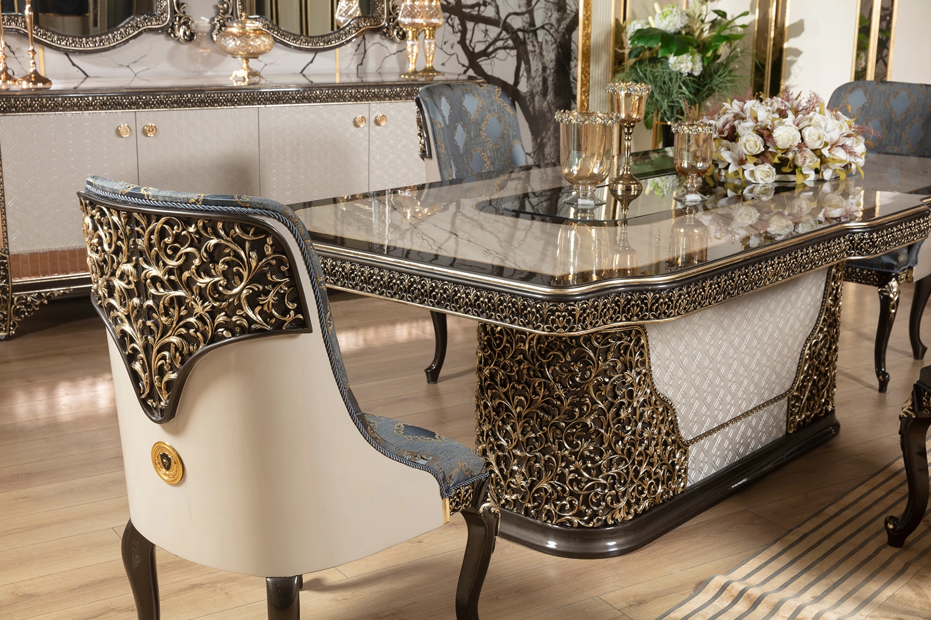 The Norza dining room set captures a sophisticated elegance with its ornate details and luxurious design. The dining table features intricate carvings along the base and edge, highlighting a blend of classic artistry and modern flair. Its glossy surface adds a touch of refinement, perfect for upscale dining experiences. The matching chairs combine comfort with style, showcasing gracefully curved legs and rich upholstery that complements the set’s overall aesthetic. The mirrored cabinetry and detailed frames of the buffet and display cabinet create a sense of spaciousness while exuding grandeur. This set is a testament to timeless elegance for an opulent dining ambiance.