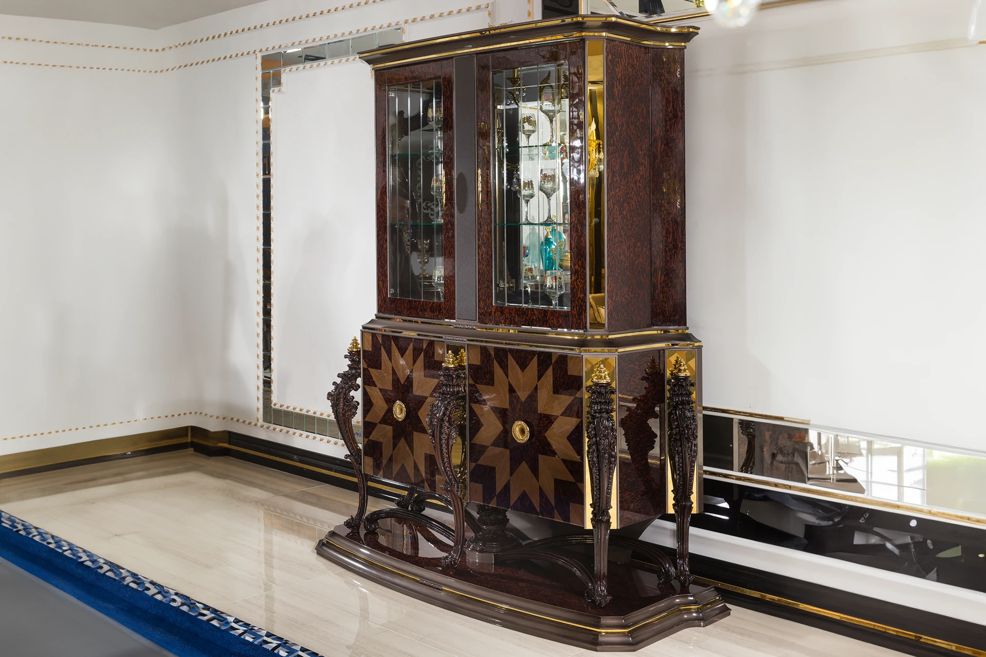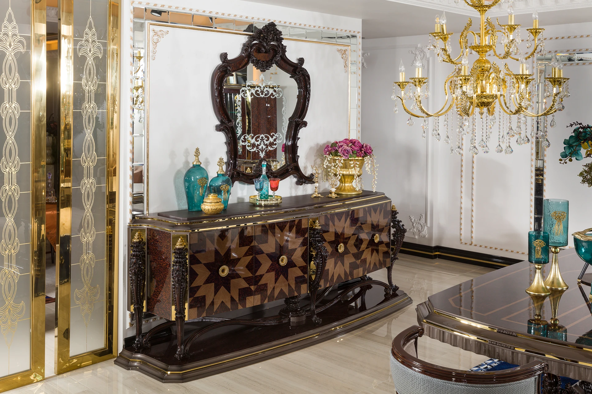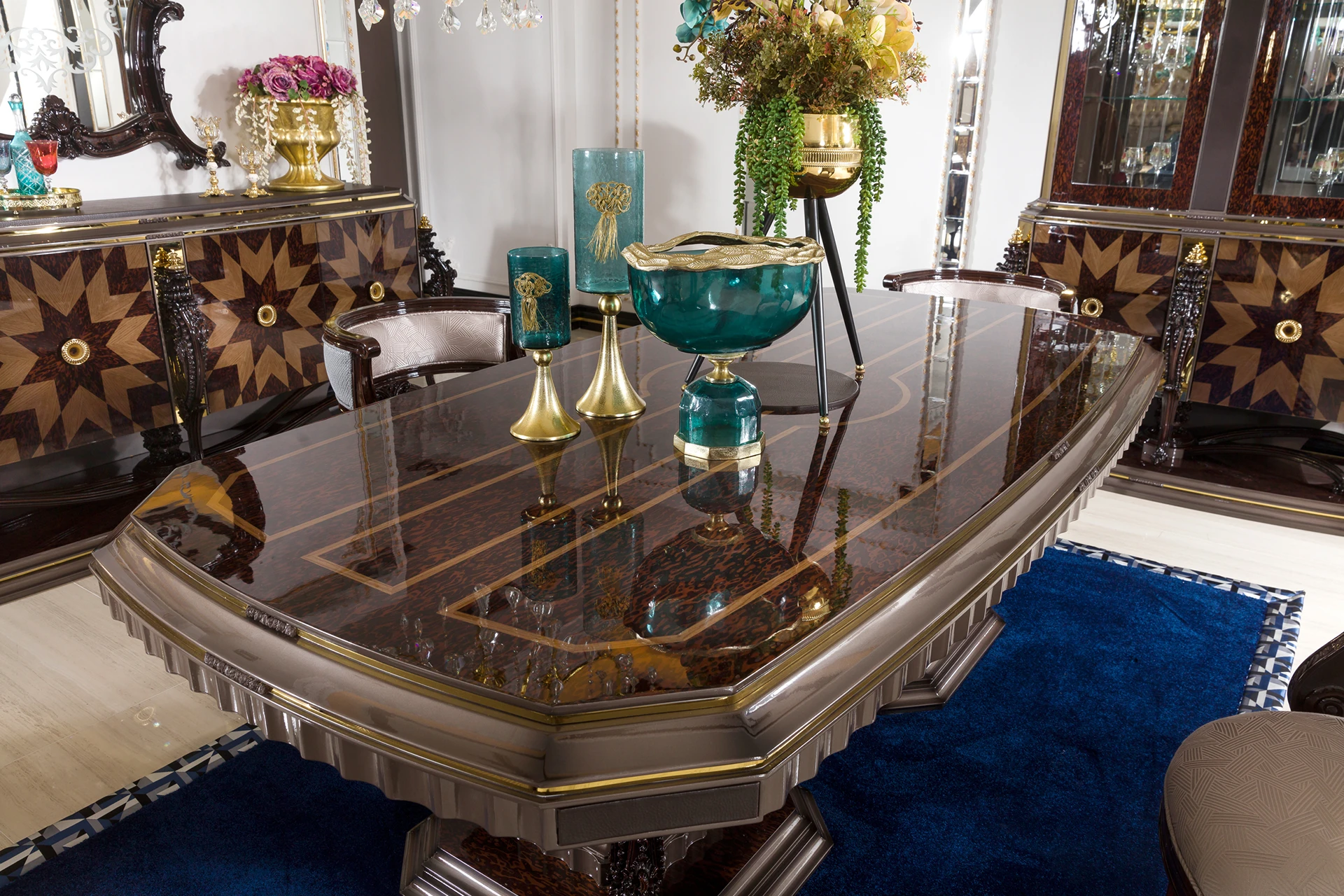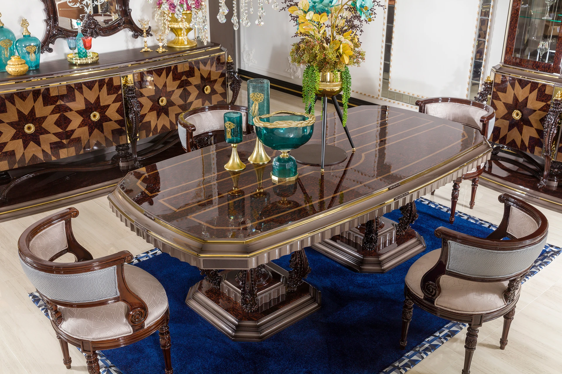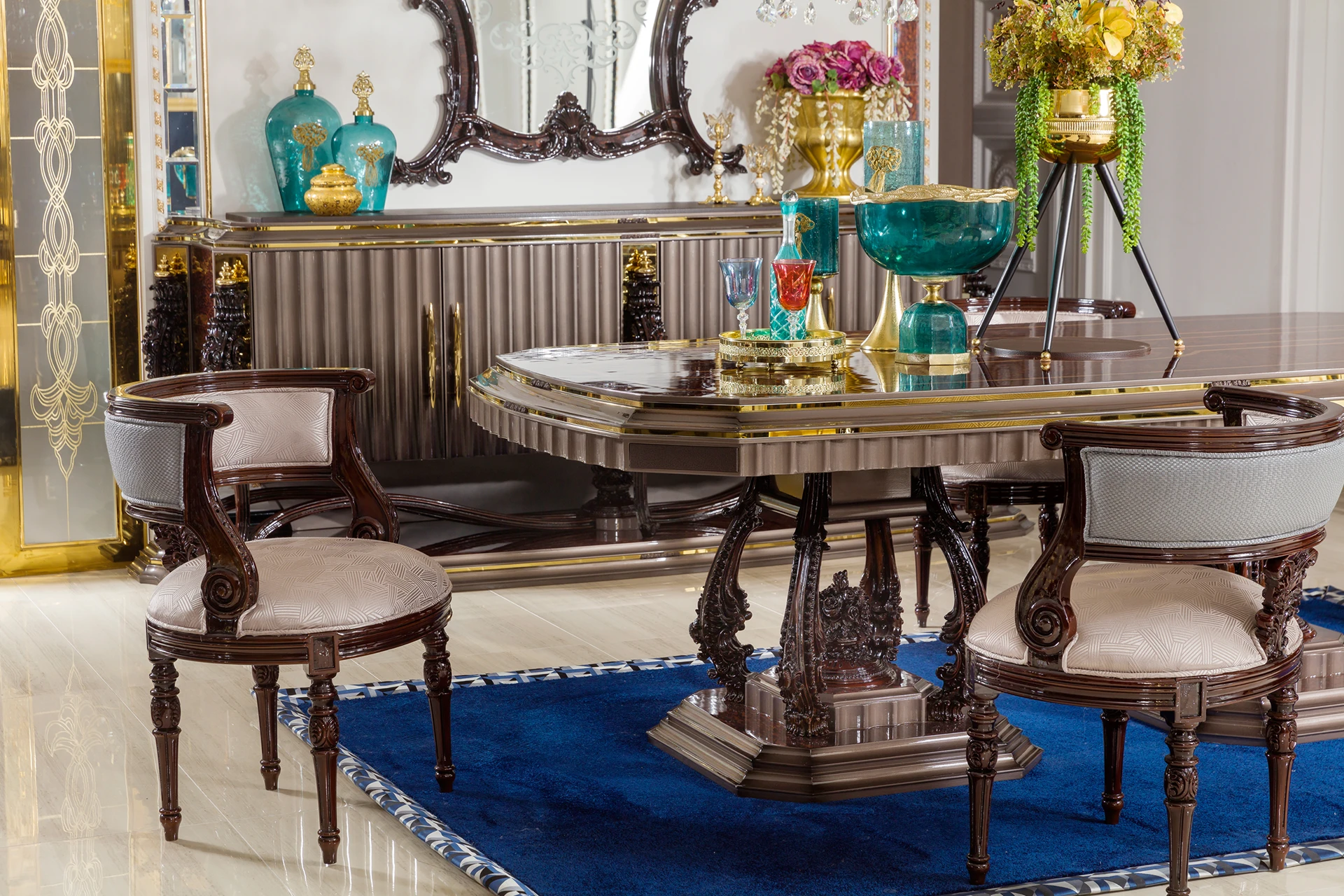 The Palermo dining room set offers a stunning blend of classic luxury and modern design. Its grand dining table, featuring a rich, polished wood finish, is supported by intricately carved bases, creating a majestic centerpiece. The chairs, with their elegantly curved armrests and plush upholstery, provide both style and comfort. A matching buffet with detailed carvings and a stately glass cabinet elevate the room’s sophistication, while the ornate chandelier above adds a touch of brilliance. This set perfectly balances opulence and functionality, transforming any dining area into a lavish space for entertaining.