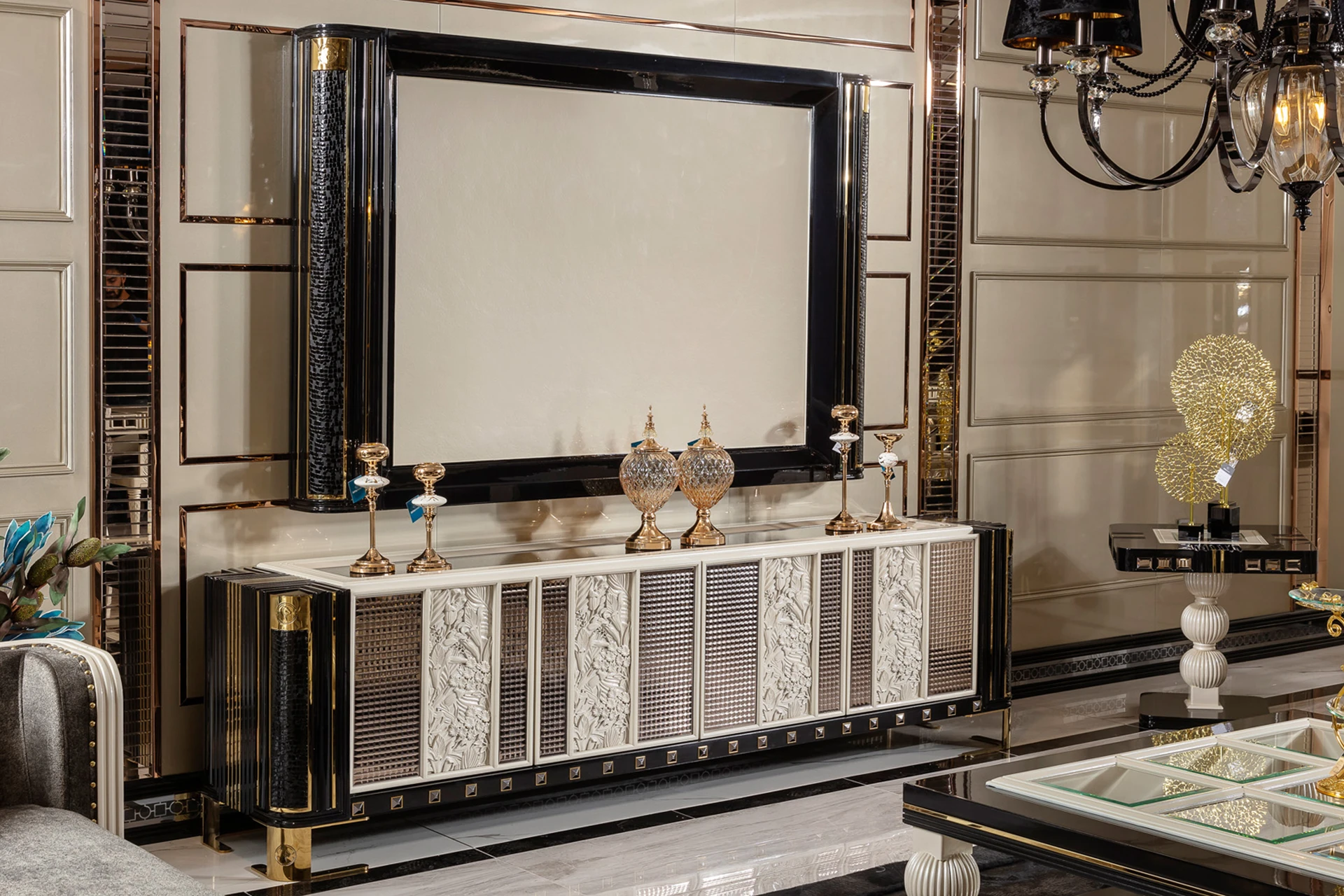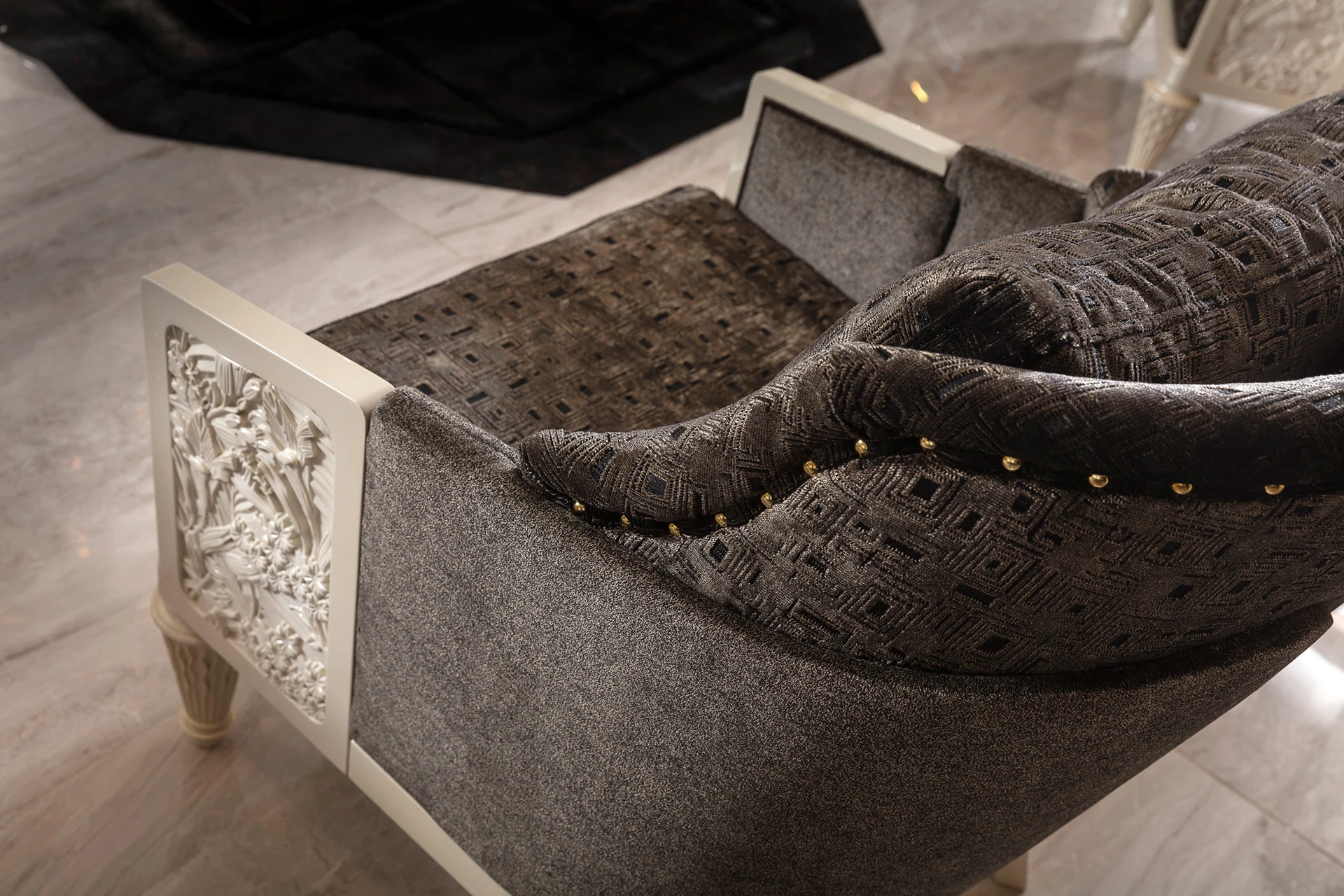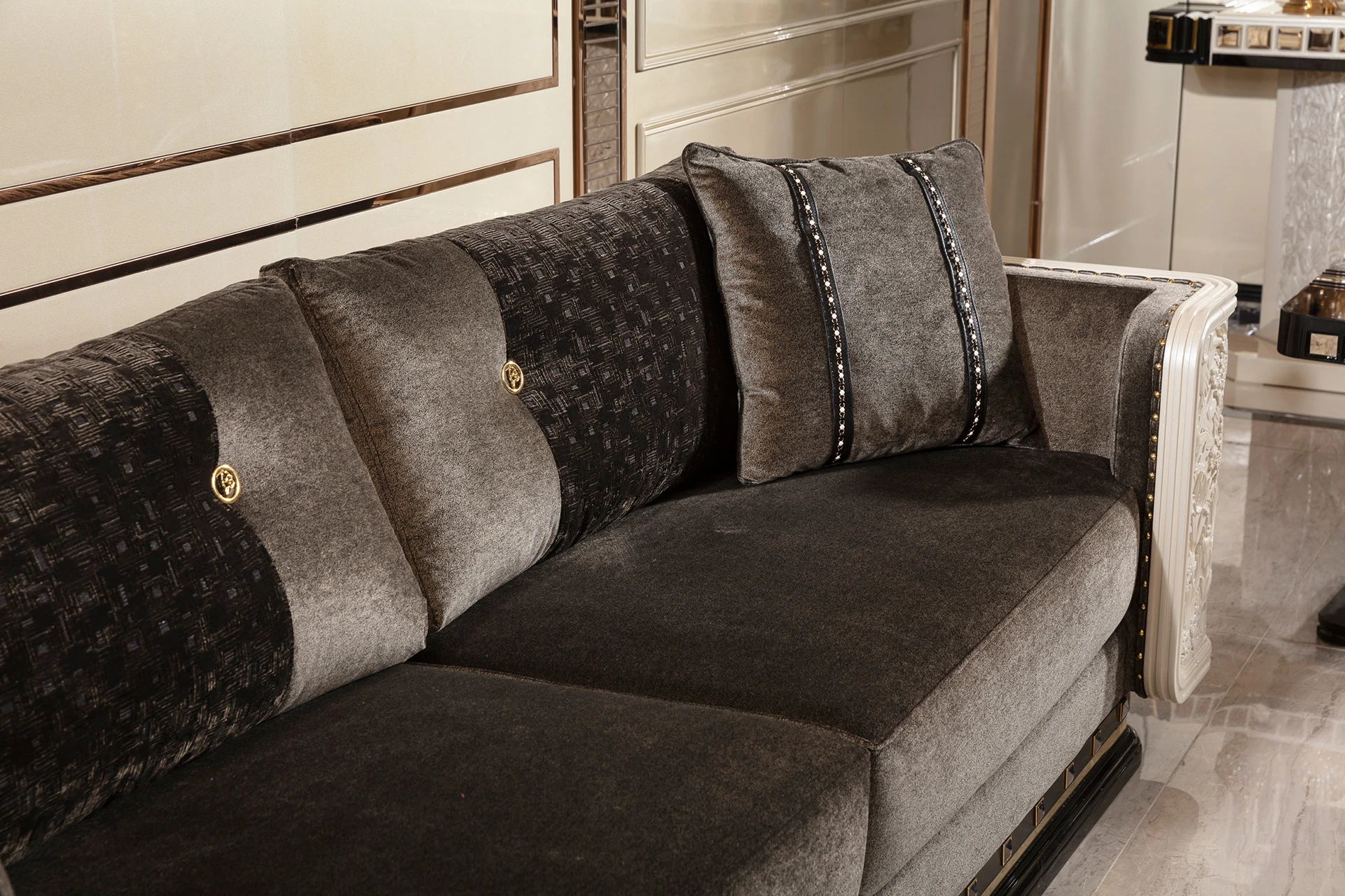 The Renova sofa set from the classic collection is a perfect blend of modern elegance and timeless luxury. Featuring deep, plush cushions and elegantly curved armrests, this set offers supreme comfort and sophistication. The intricately carved details on the armrests and legs add a touch of classic opulence, while the rich fabric upholstery exudes warmth and style. The contrasting color palette and the unique design elements make the Renova sofa set an eye-catching centerpiece for any living room. Ideal for both formal gatherings and relaxed lounging, this set transforms your space into a refined haven of comfort and elegance.