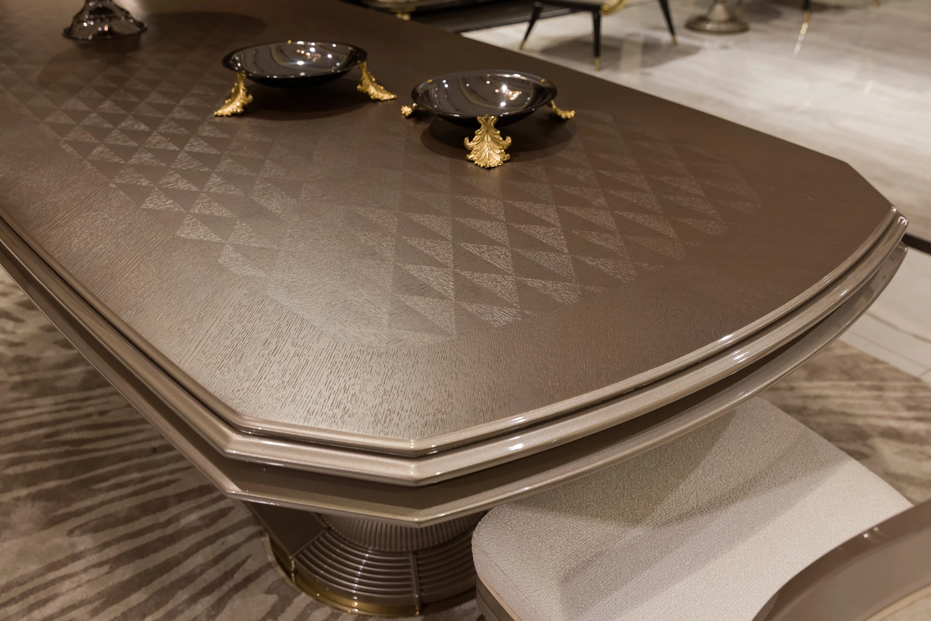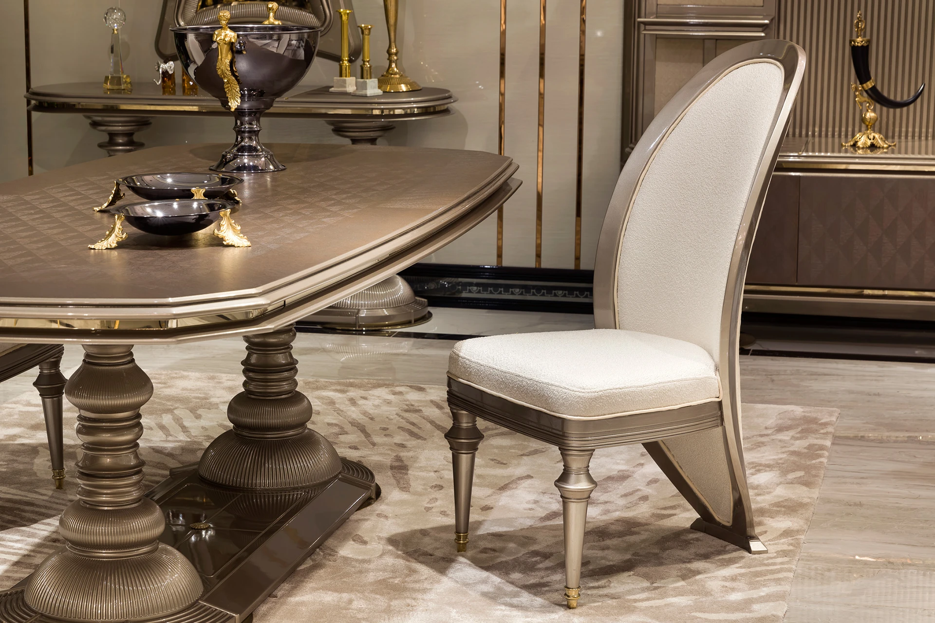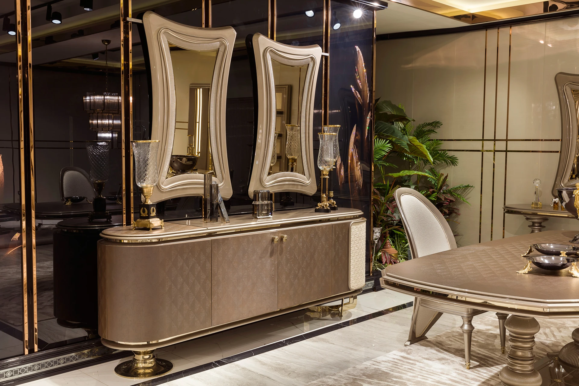 The Resital dining room set from the classic collection embodies elegance and sophistication. The dining table’s gracefully curved legs and polished surface create an exquisite focal point for the room, while its robust design ensures durability and lasting style. Accompanying the table are beautifully upholstered chairs with high backs that offer both comfort and a refined look. The set is completed by a sleek sideboard, adorned with elegant mirrors and intricate accents, adding a touch of opulence and functionality. Ideal for both everyday dining and formal occasions, the Resital dining room set transforms your space into a haven of classic luxury.