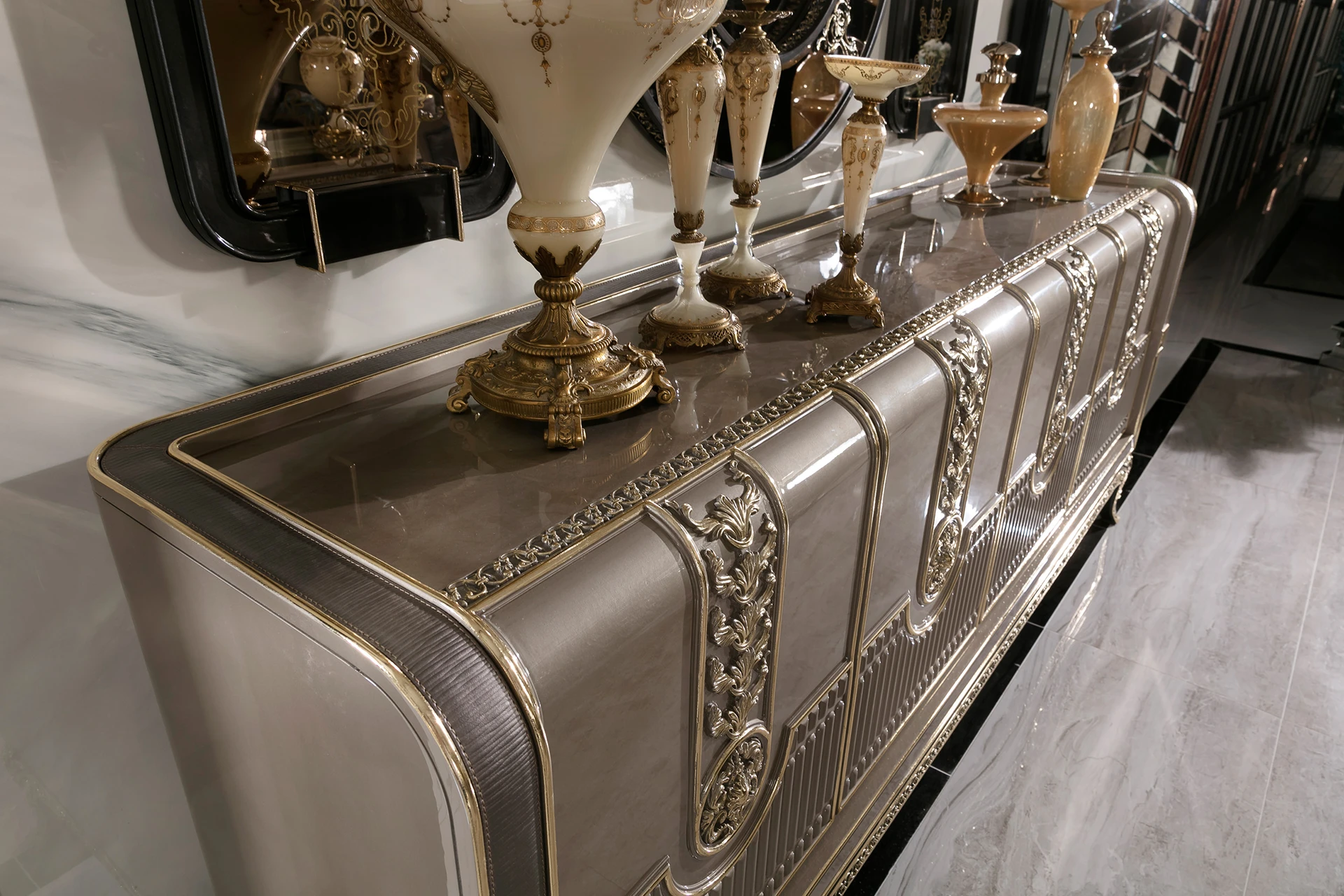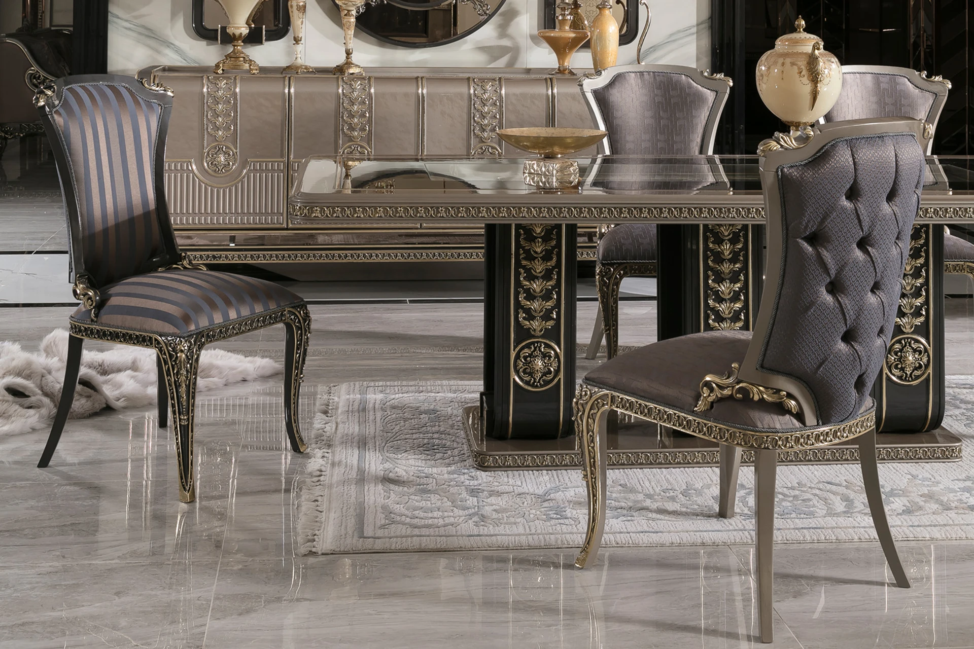 The Riva dining room set from the classic collection embodies luxury and sophistication. The dining table, with its sleek design and intricately carved base, serves as a stunning focal point in any dining space. Its glossy finish reflects elegance, while the ornate detailing showcases masterful craftsmanship. Accompanying the table are upholstered chairs with high backs, offering both comfort and style. The set is completed by a majestic sideboard adorned with exquisite carvings and mirror accents, adding a touch of opulence. The Riva dining room set transforms every meal into a grand dining experience, elevating the ambiance with its timeless elegance.