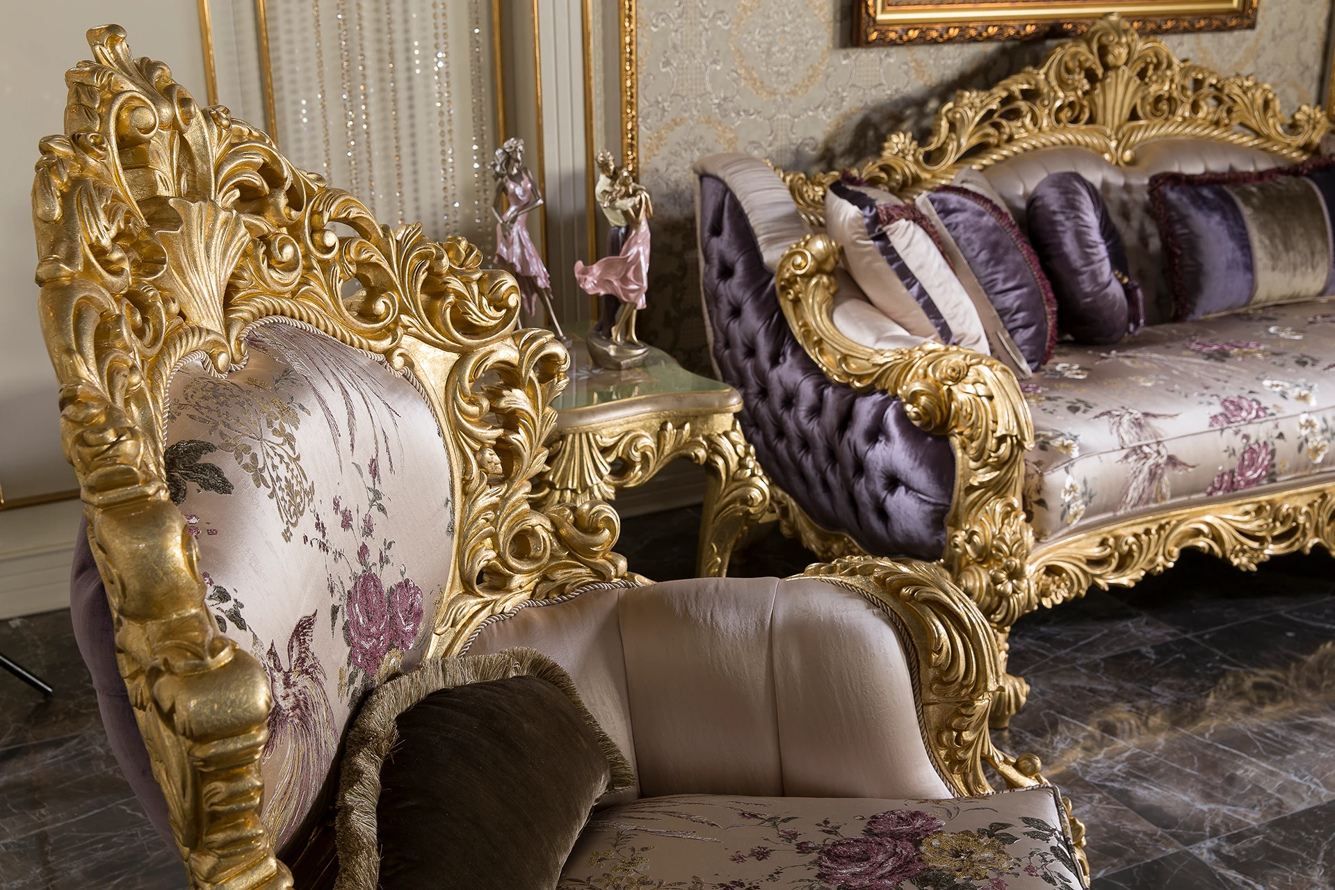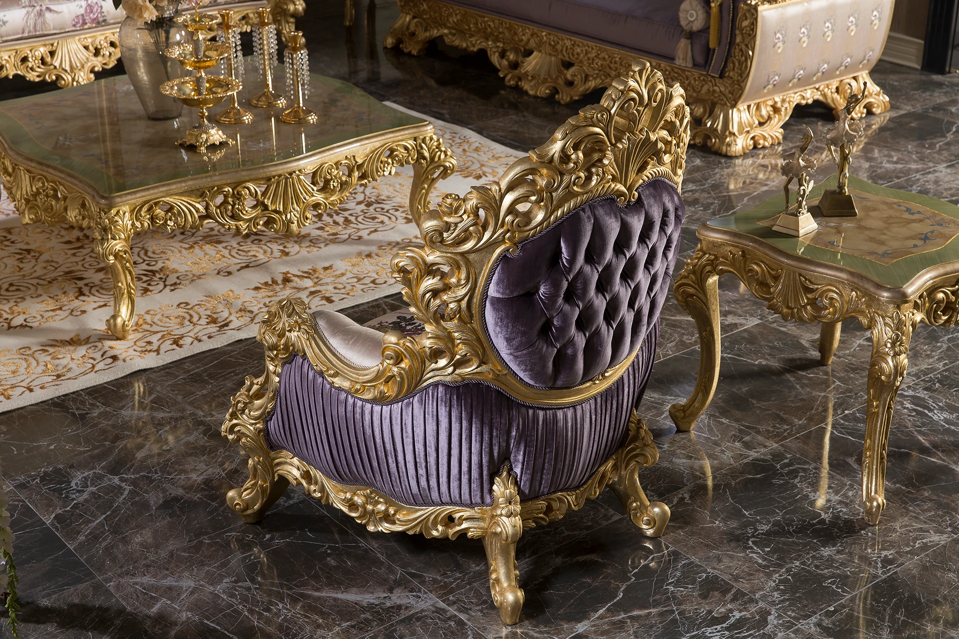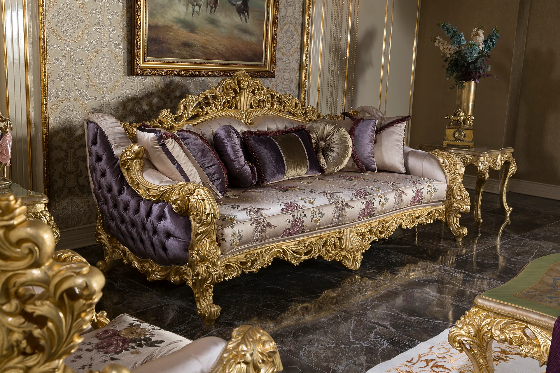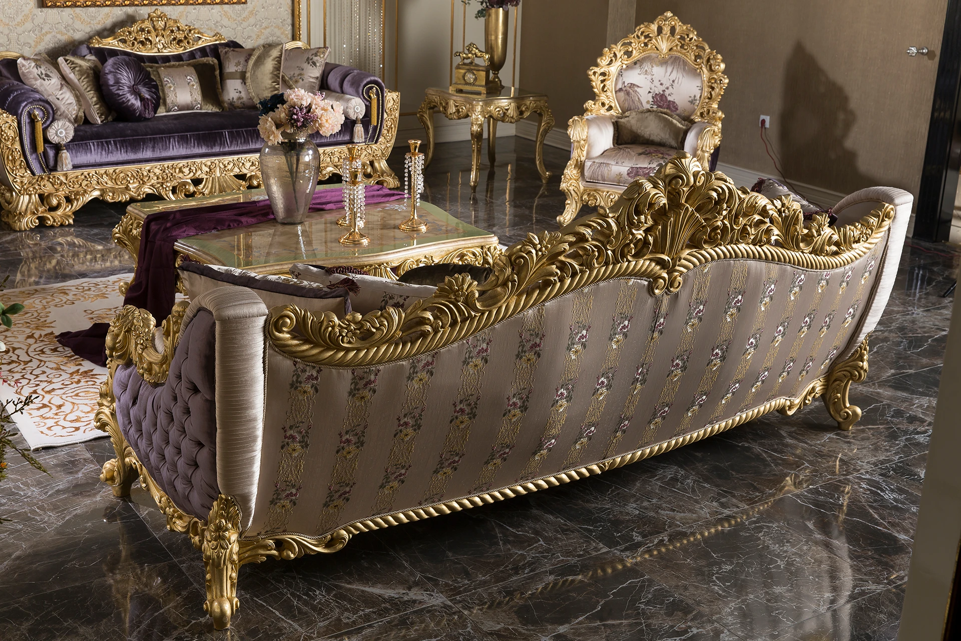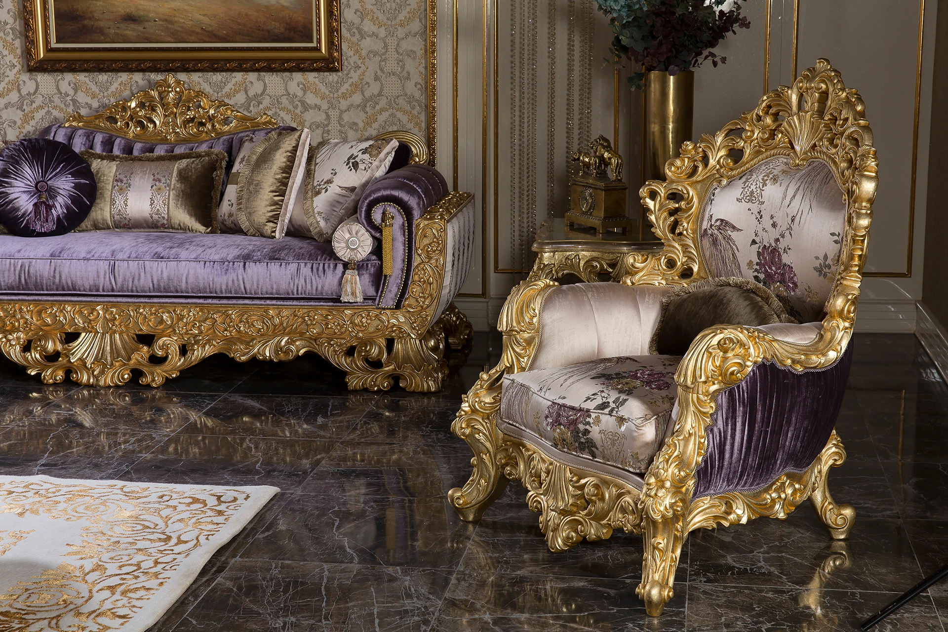 The Ronesans sofa set exudes luxury and sophistication with its exquisite gold detailing and opulent design. Its rich upholstery in regal purple shades, combined with the intricate floral patterns, provides a striking visual appeal. Each piece is crafted with elaborately carved wooden frames that exude classical elegance. The cushions add a plush comfort, perfectly complementing the grandiose style of the set. This living room ensemble creates an atmosphere of timeless beauty, making it the centerpiece of any sophisticated space.