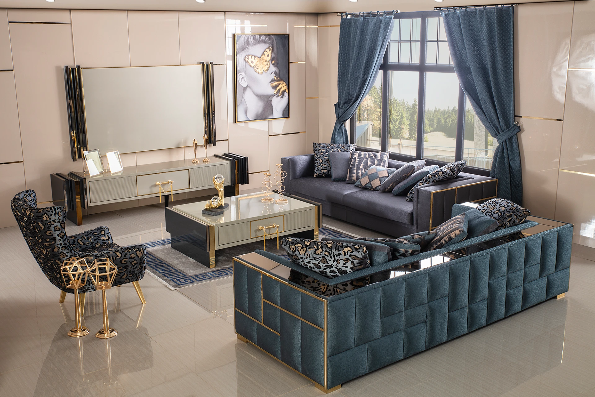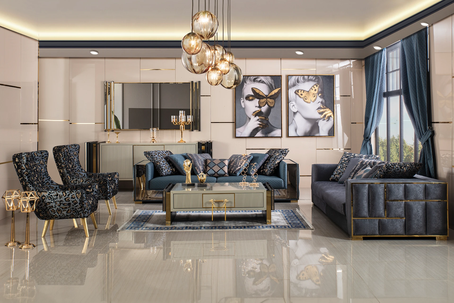 The Sahra sofa set is the perfect blend of modern elegance and luxurious comfort, designed to make a bold statement in any living room. The deep, rich hues combined with sleek gold accents create a striking visual appeal. With its plush cushions and textured fabrics, this set offers unparalleled comfort, while the geometric patterns and sophisticated details add a touch of contemporary artistry. The Sahra Sofa Set is ideal for those who appreciate modern design without compromising on comfort, turning your living space into a haven of style and relaxation.