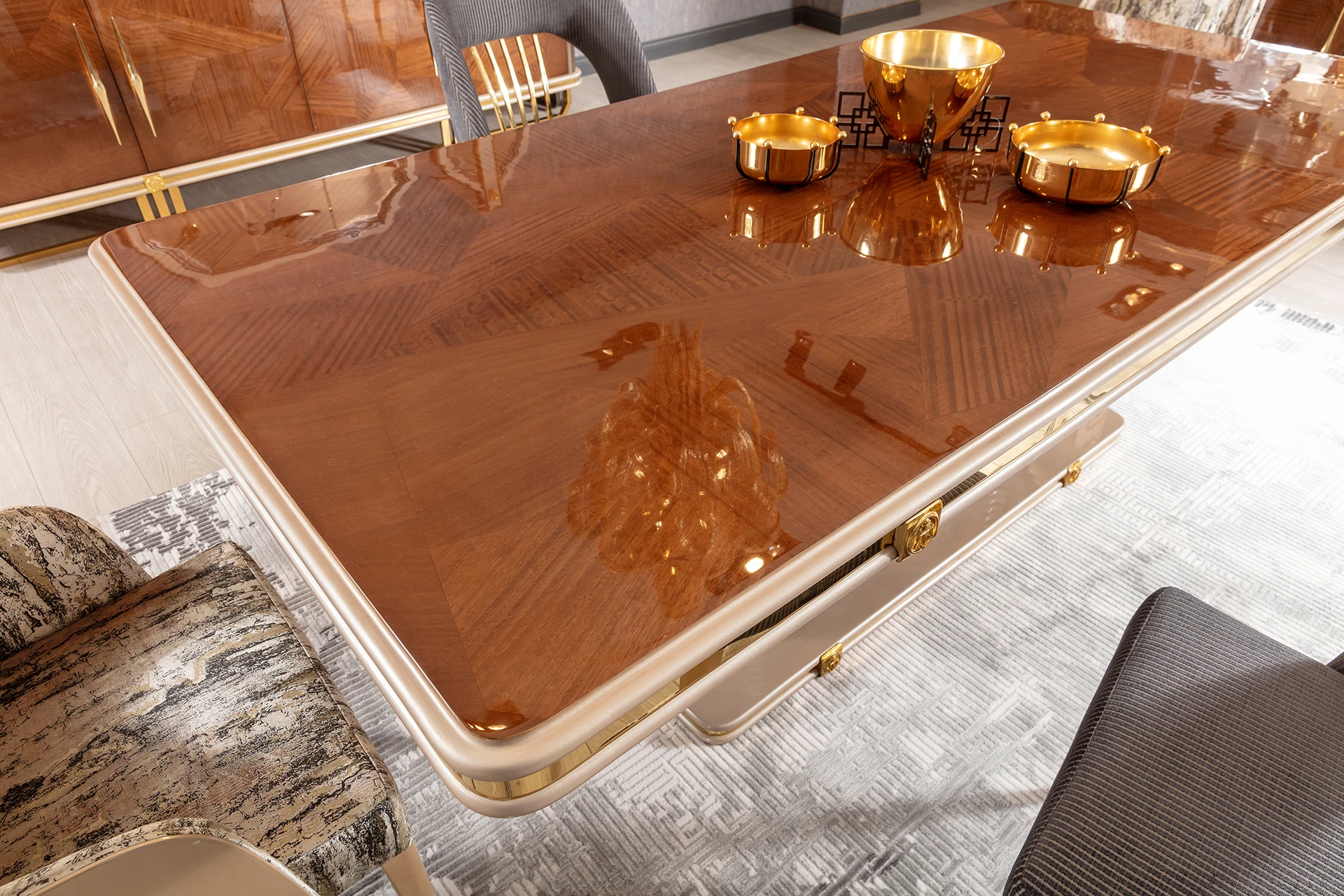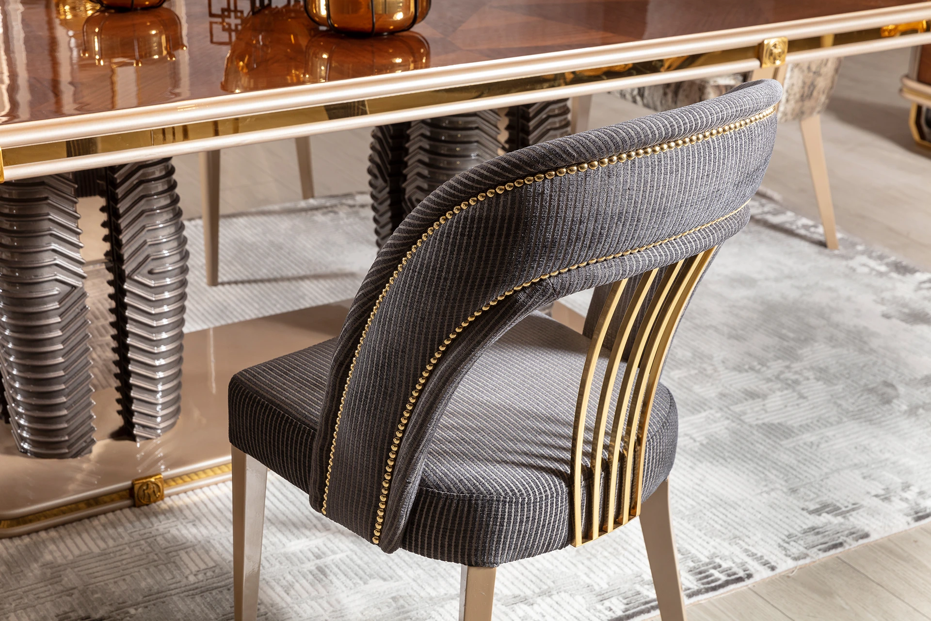 The Selva dining room set exudes a luxurious yet modern aesthetic, designed to elevate any dining space. Featuring a stunning combination of polished wood finishes, gold accents, and sleek lines, this set brings sophistication and elegance to the room. The chairs, with their plush upholstery and detailed patterns, offer both comfort and style. The centerpiece of the set is the dining table, with a bold, sculptural base that adds a unique artistic element. The mirrored accents and rich textures of the cabinet further enhance the set’s opulent vibe, making the selva dining room set perfect for those who appreciate high-end, contemporary design.