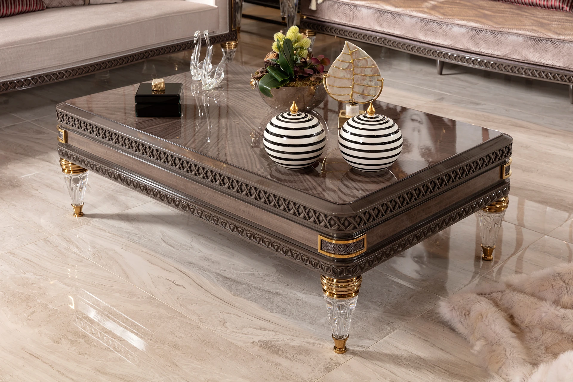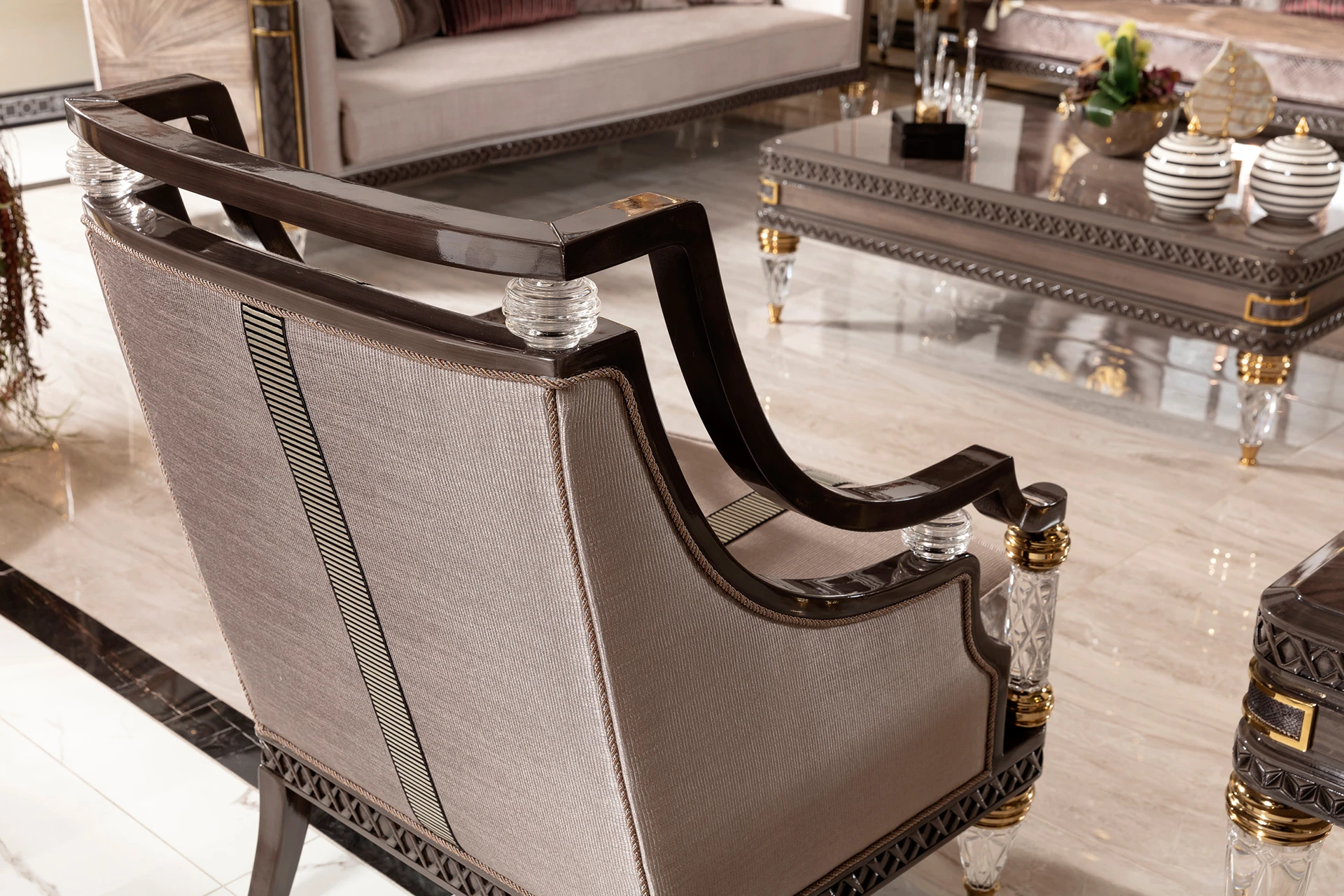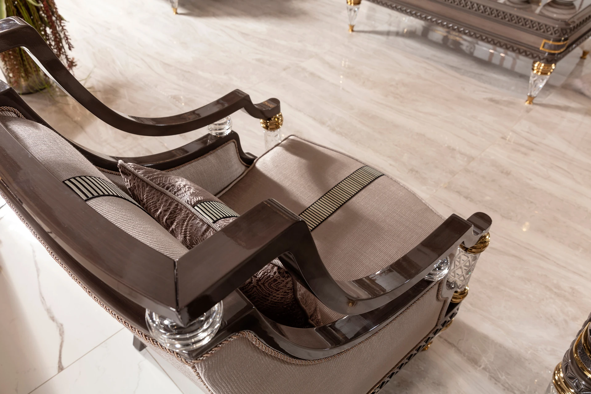 The Soprano sofa set from the classic collection exudes sophistication and luxury. Crafted with meticulous attention to detail, this set features elegant seating with plush cushioning for exceptional comfort. The sofas are adorned with intricate wood accents and stylish upholstery, creating a statement piece for any living room. The armchairs complement the ensemble with their refined design, adding a regal touch. The coffee table, with its polished surface and carved legs, ties the set together, providing a perfect balance of function and style. This ensemble offers an inviting atmosphere for relaxation and gatherings.