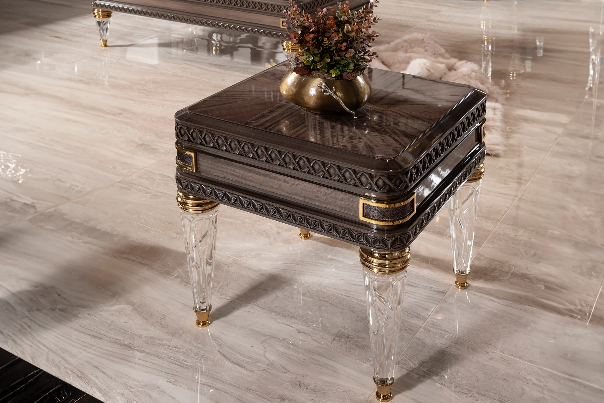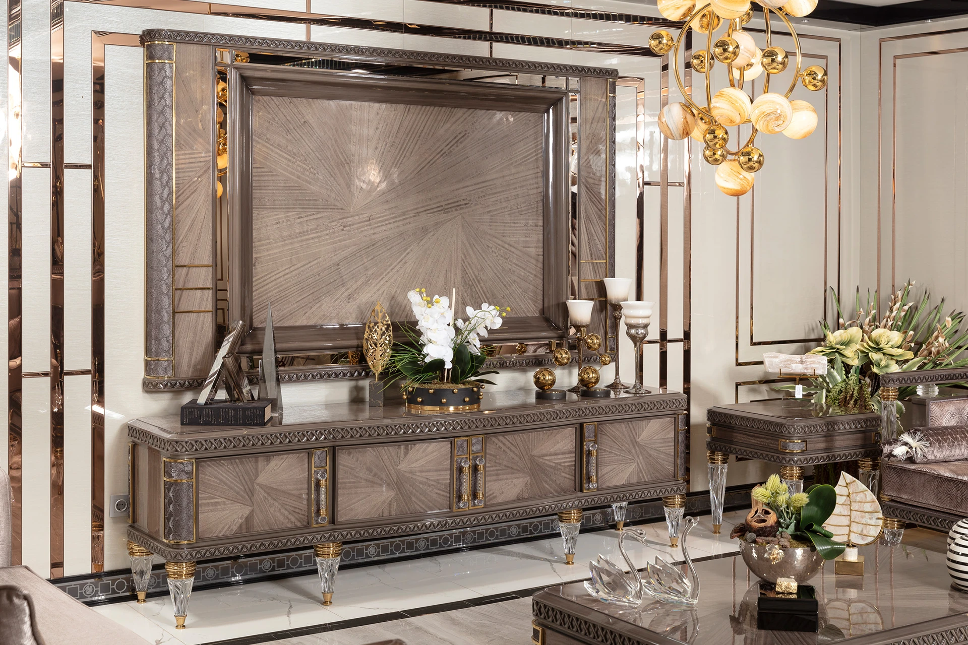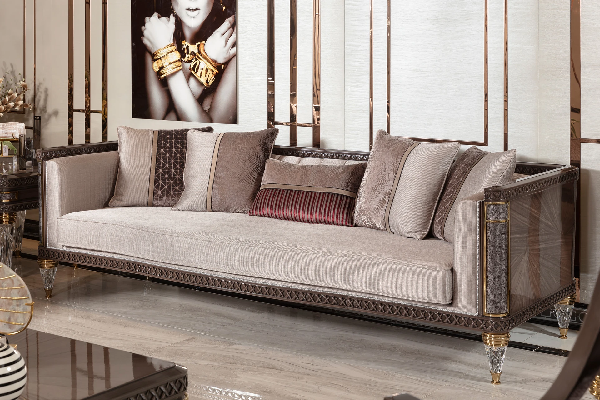 The Soprano sofa set from the classic collection exudes sophistication and luxury. Crafted with meticulous attention to detail, this set features elegant seating with plush cushioning for exceptional comfort. The sofas are adorned with intricate wood accents and stylish upholstery, creating a statement piece for any living room. The armchairs complement the ensemble with their refined design, adding a regal touch. The coffee table, with its polished surface and carved legs, ties the set together, providing a perfect balance of function and style. This ensemble offers an inviting atmosphere for relaxation and gatherings.