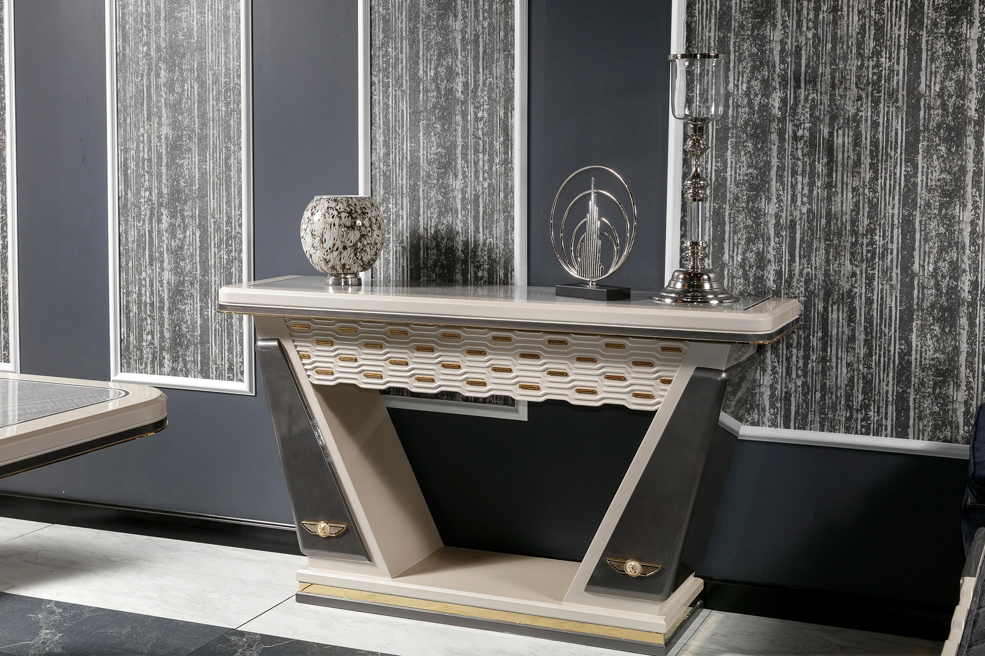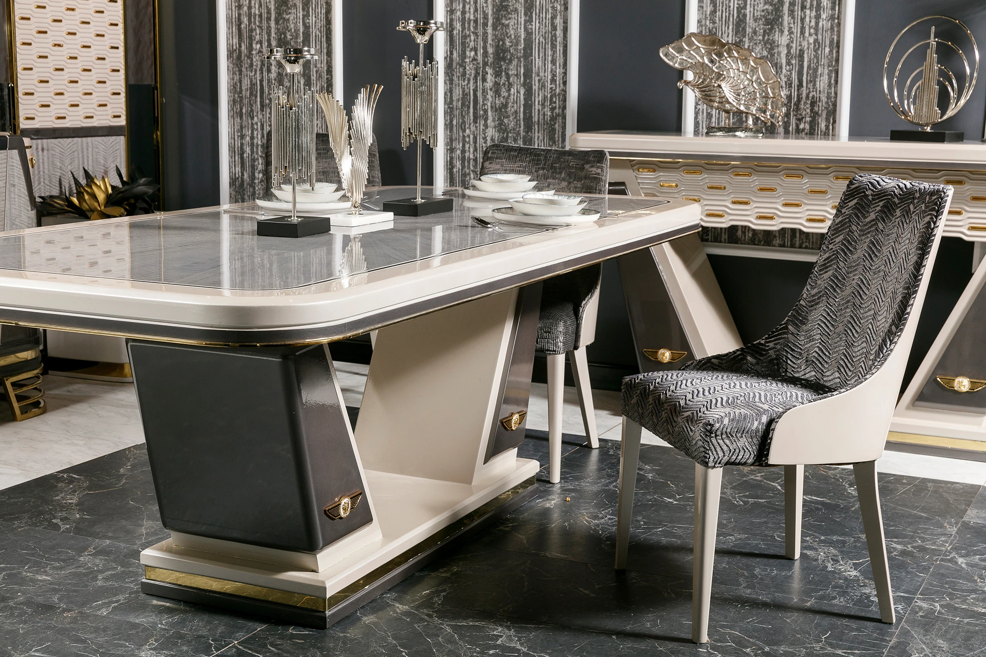 The Star Dining room set blends contemporary elegance with practical luxury. Featuring a sleek, modern design with sharp lines and glossy surfaces, this set exudes sophistication and style. The dining table’s robust structure is accentuated by metallic accents that give it a polished and high-end look. Paired with plush chairs that offer both comfort and style, this set creates a perfect ambiance for hosting elegant dinners or casual family gatherings. Its neutral color palette allows for easy integration into various interiors, while its craftsmanship ensures durability. Elevate your dining experience with the Star Dining Room Set where luxury meets modern living.