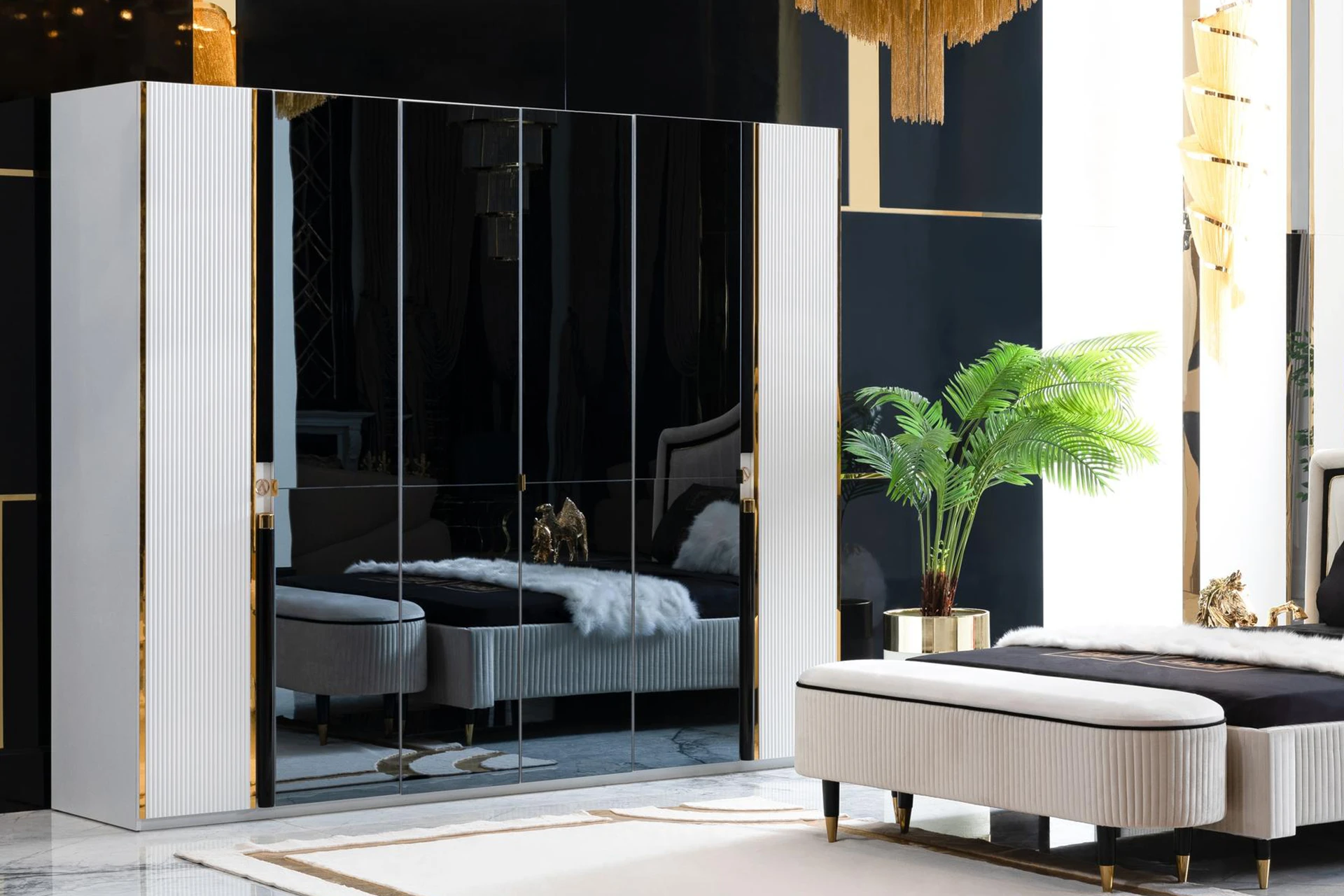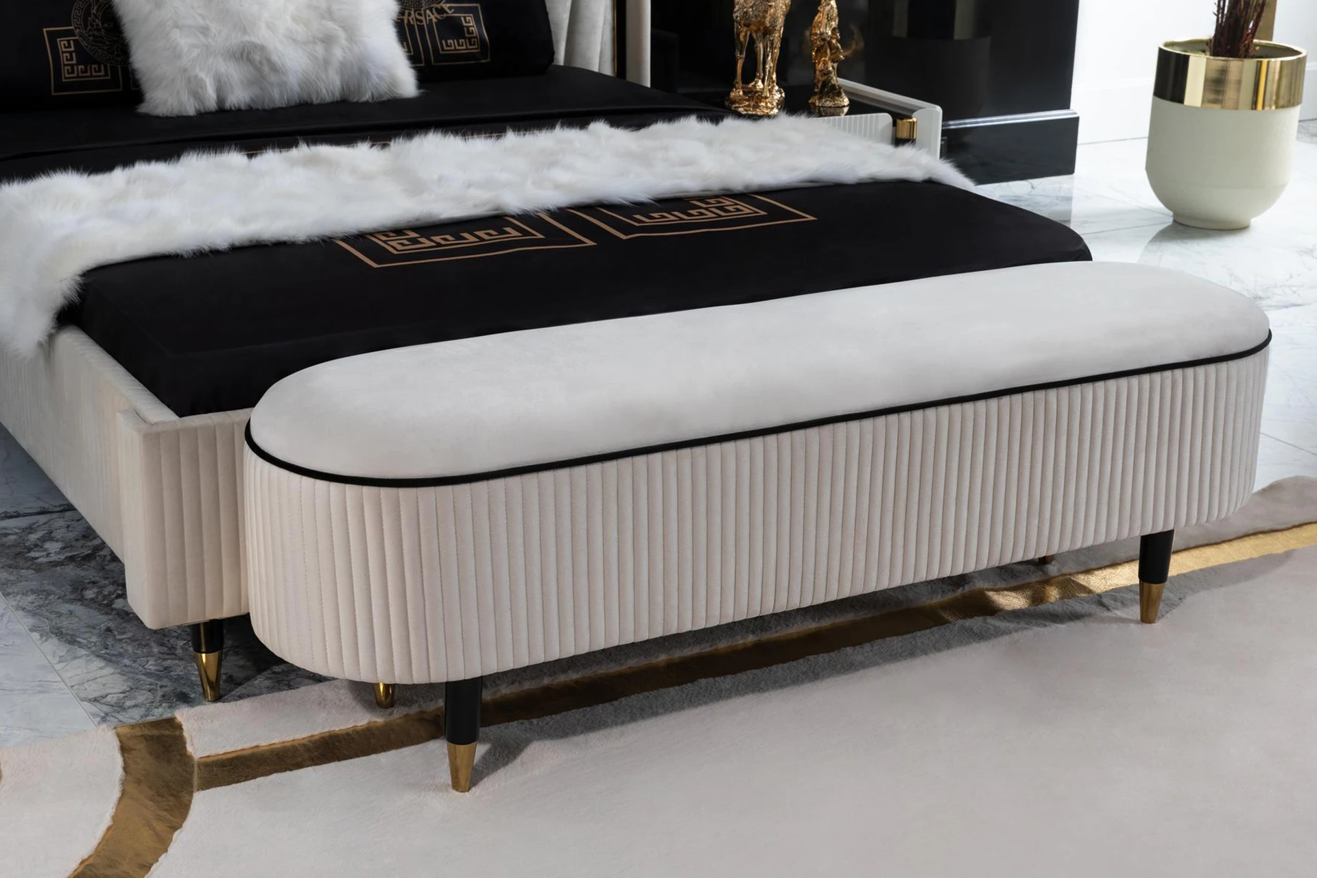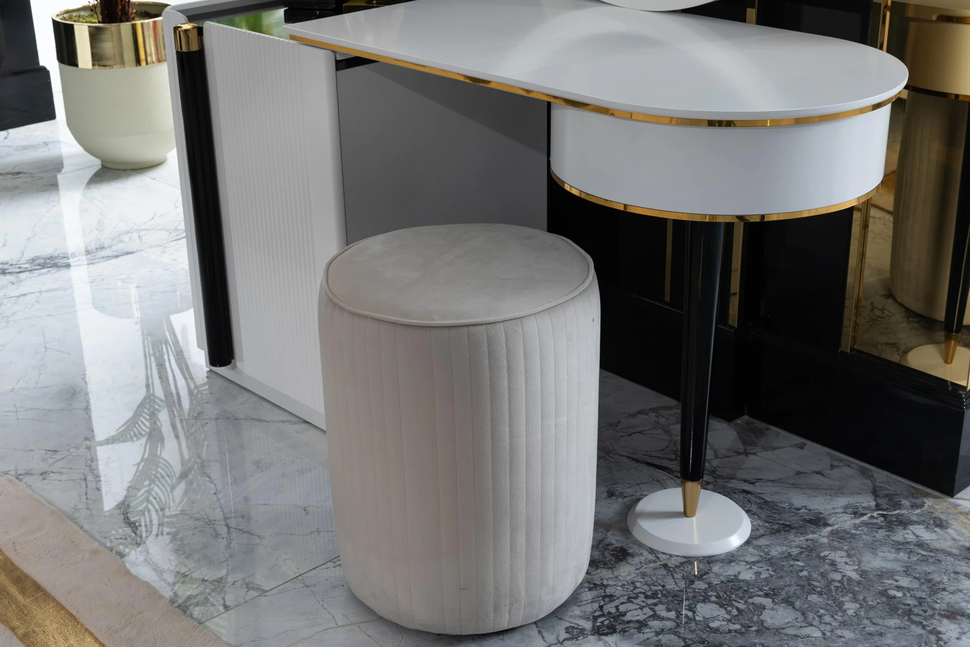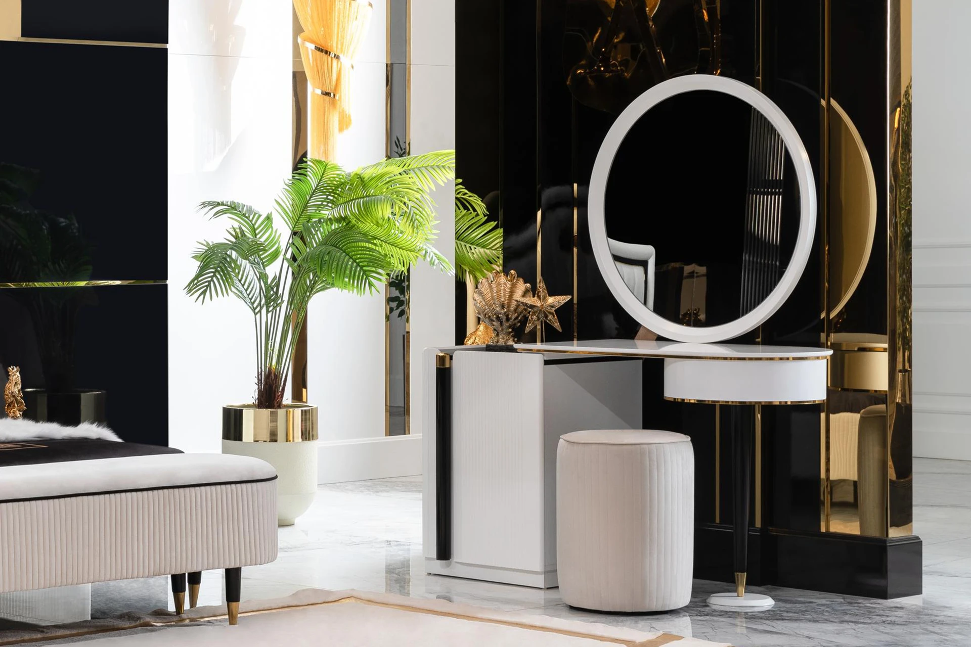 The Stella bedroom set radiates elegance with its soft curves and plush upholstery. The bed frame features a luxurious, quilted headboard, creating a serene and stylish focal point. Complementing the bed, the bedside tables have sleek lines and a sophisticated design, perfect for adding a touch of modern glamour. The vanity table, with its rounded mirror and minimalist structure, offers a chic spot for daily routines, accompanied by a padded stool for comfort. Finished in white tones with gold accents, this set effortlessly blends luxury and contemporary style, ideal for a refined bedroom ambiance.