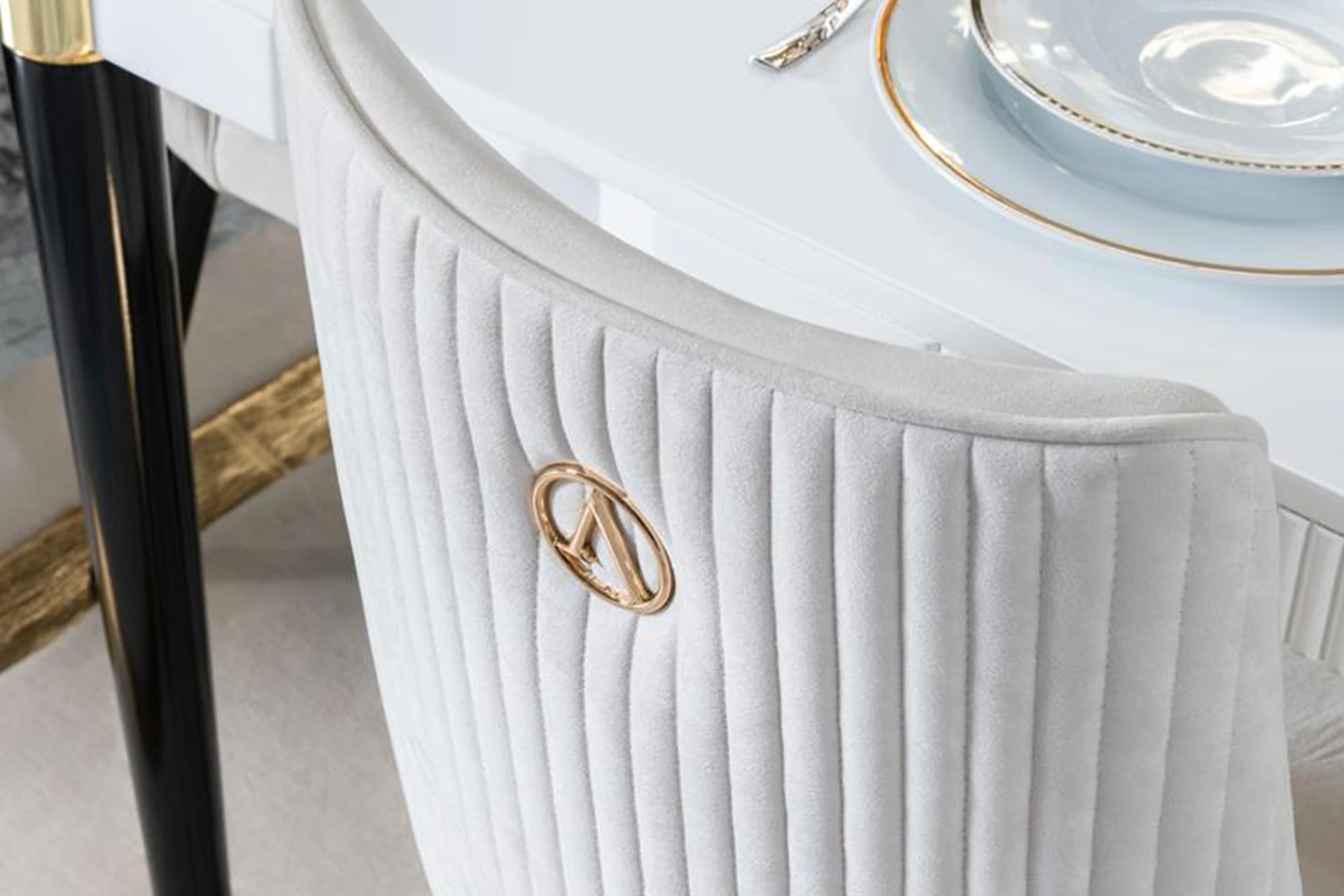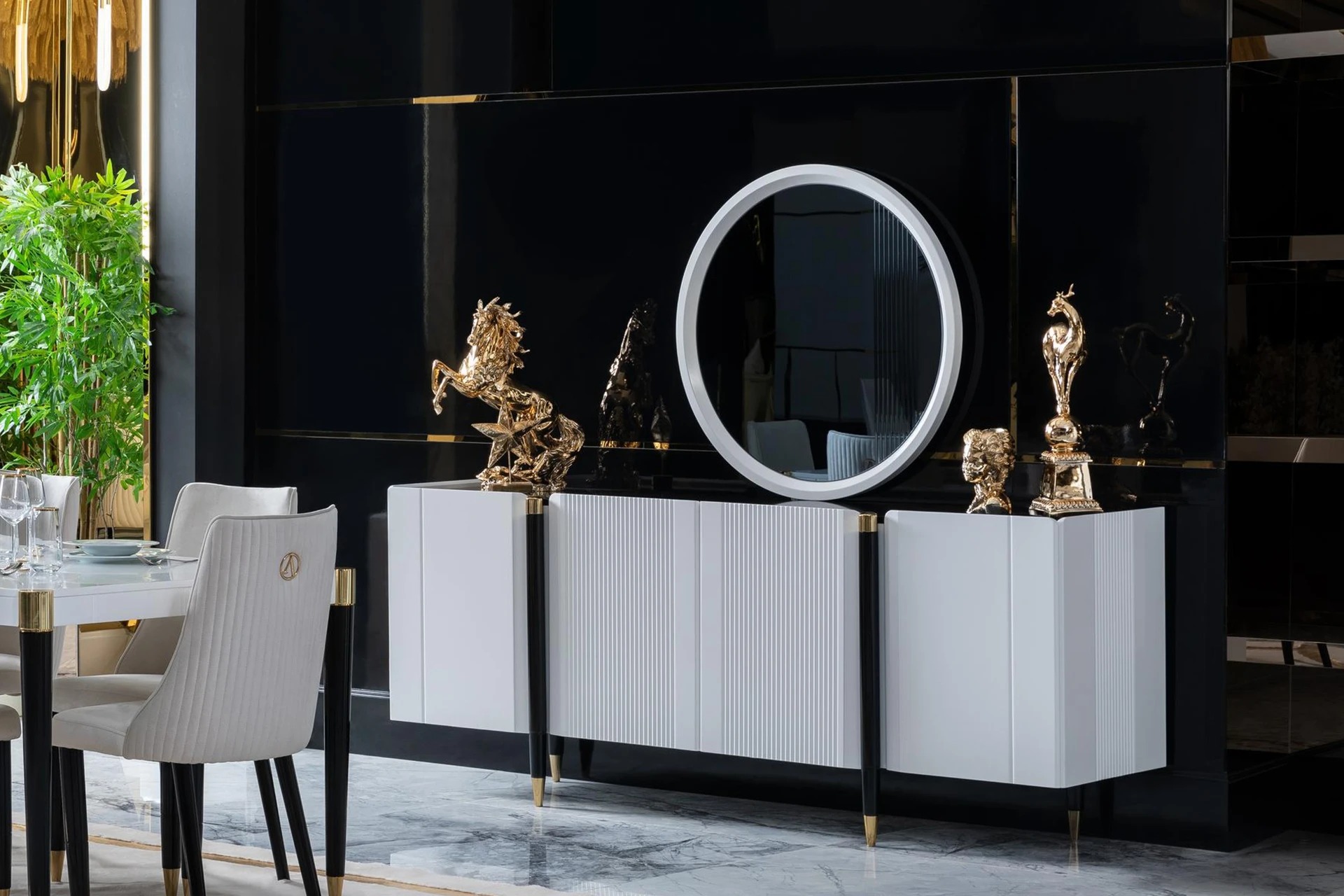 The Stella dining room set exudes contemporary elegance with its refined lines and minimalist charm. The sleek table, finished in a glossy white surface, pairs perfectly with chairs that feature soft upholstery and elegant stitching. Gold accents on the legs of both the table and chairs add a luxurious touch, enhancing the set’s sophisticated aesthetic. The set is complemented by a modern sideboard, adorned with a circular mirror, making it an exquisite choice for those seeking a refined dining atmosphere. Ideal for both intimate dinners and elegant gatherings, the Stella dining room set embodies modern luxury.