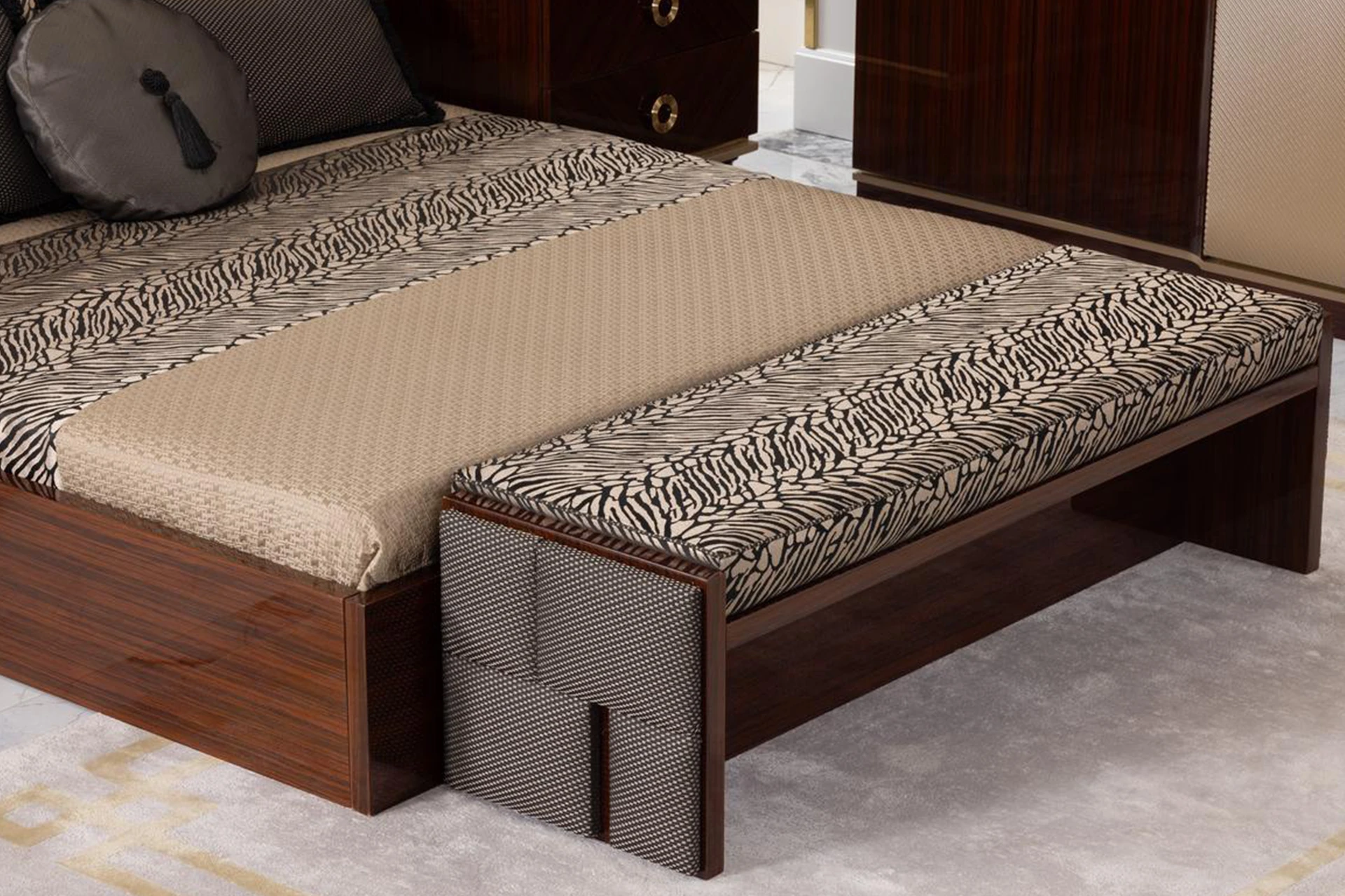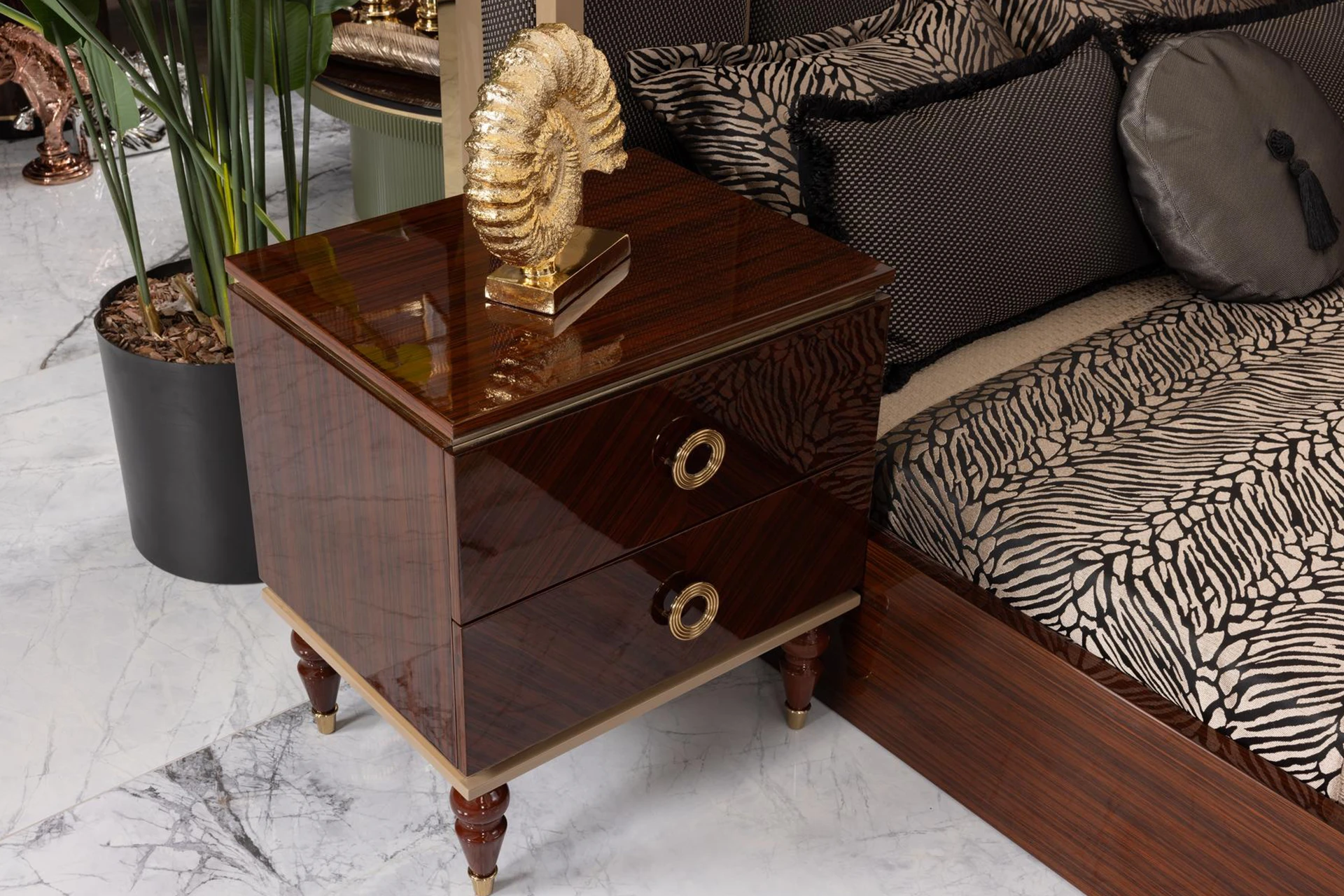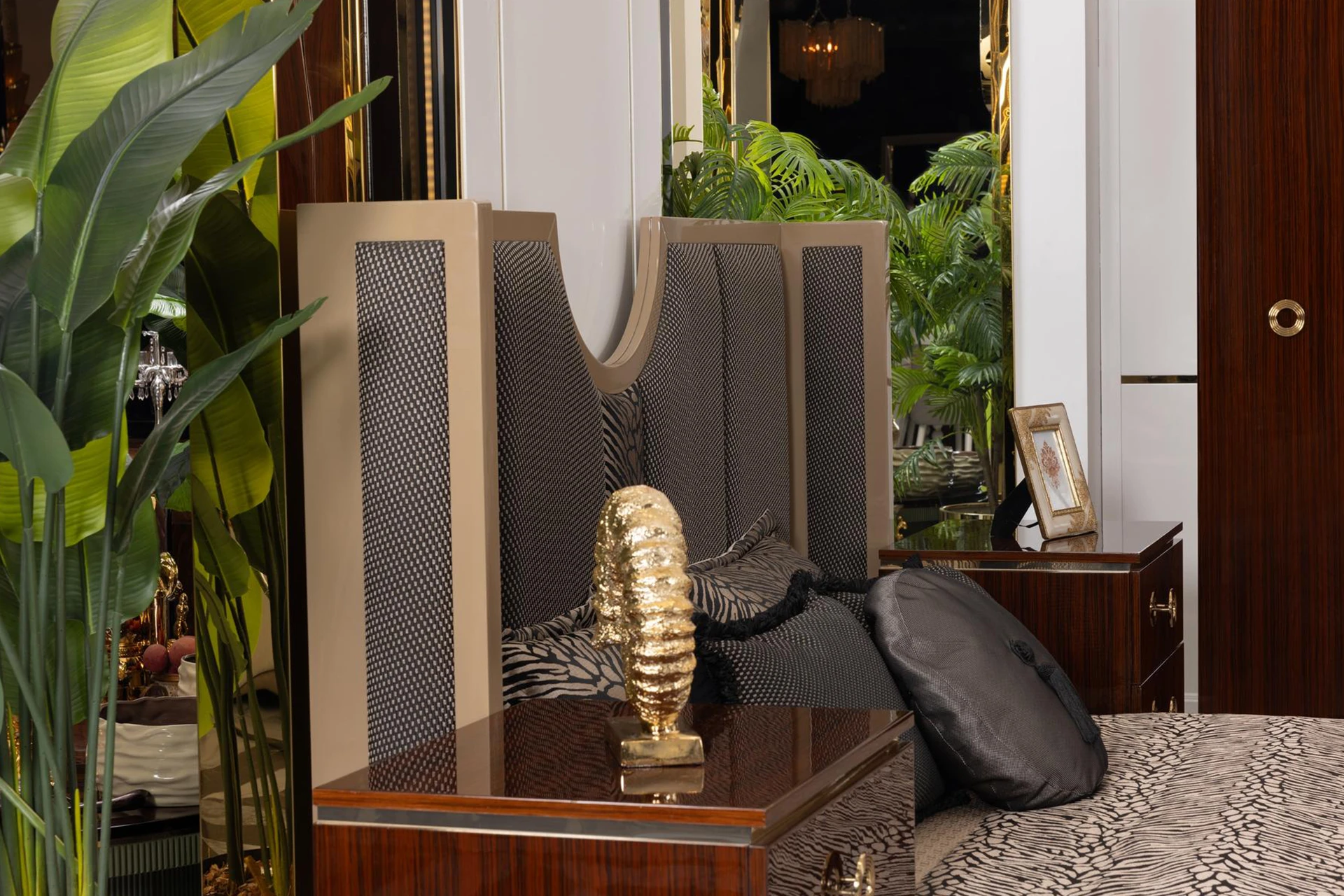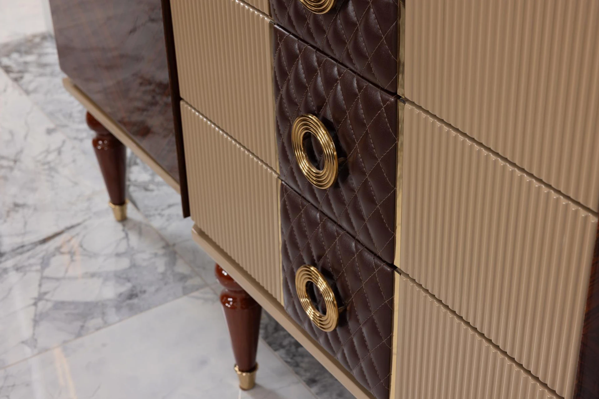 The Taren bedroom set exudes a sophisticated charm with its rich wooden accents and luxurious fabric details. The bed frame stands out with its high, padded headboard adorned in a mix of textures, providing both comfort and elegance. Flanking the bed are bedside tables with a polished wood finish and gold-tone hardware, adding a touch of opulence. The matching dresser, with its intricate drawer design and framed mirror, completes the set, offering a cohesive and stylish look to any bedroom. This ensemble promises a retreat that blends classic design with modern luxury.