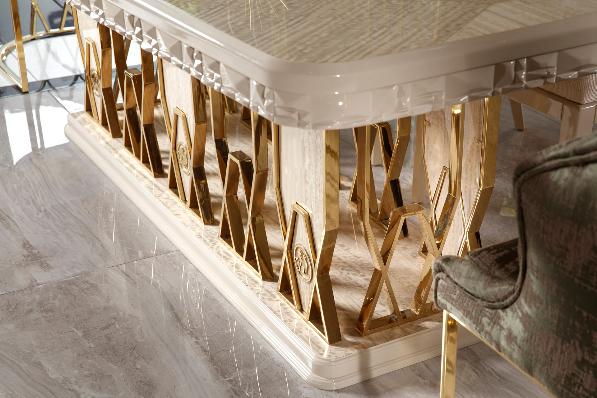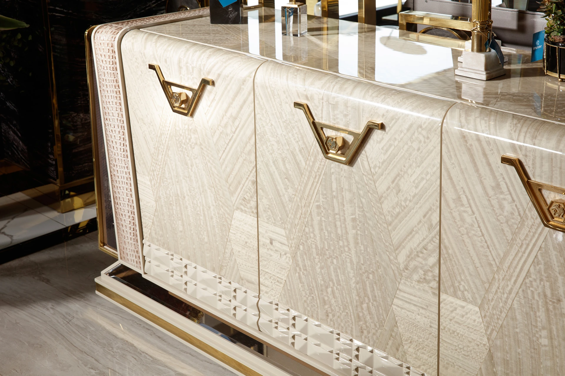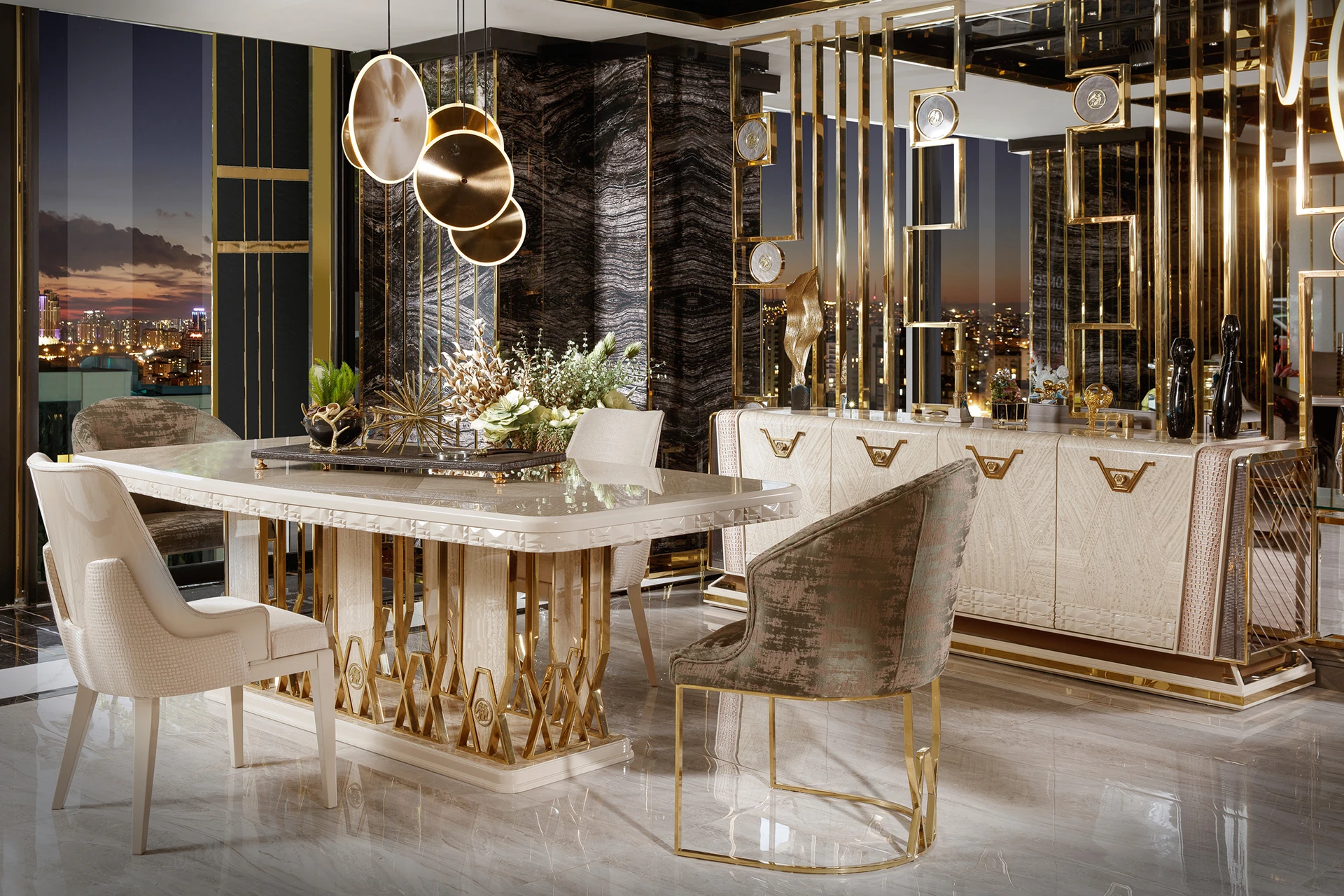 The Tudor White dining room set combines modern luxury with an air of sophistication, perfect for those who seek a refined dining experience. The glossy white table, supported by a stunning gold base, serves as the centerpiece of the set, creating a dramatic and elegant look. The chairs, upholstered in plush fabrics, provide both comfort and style, while the matching sideboard adds a touch of glamour with its sleek lines and golden accents. The intricate details and polished finishes of the Tudor White Dining Room Set make it a statement piece, turning any dining room into a space of contemporary elegance and luxury.