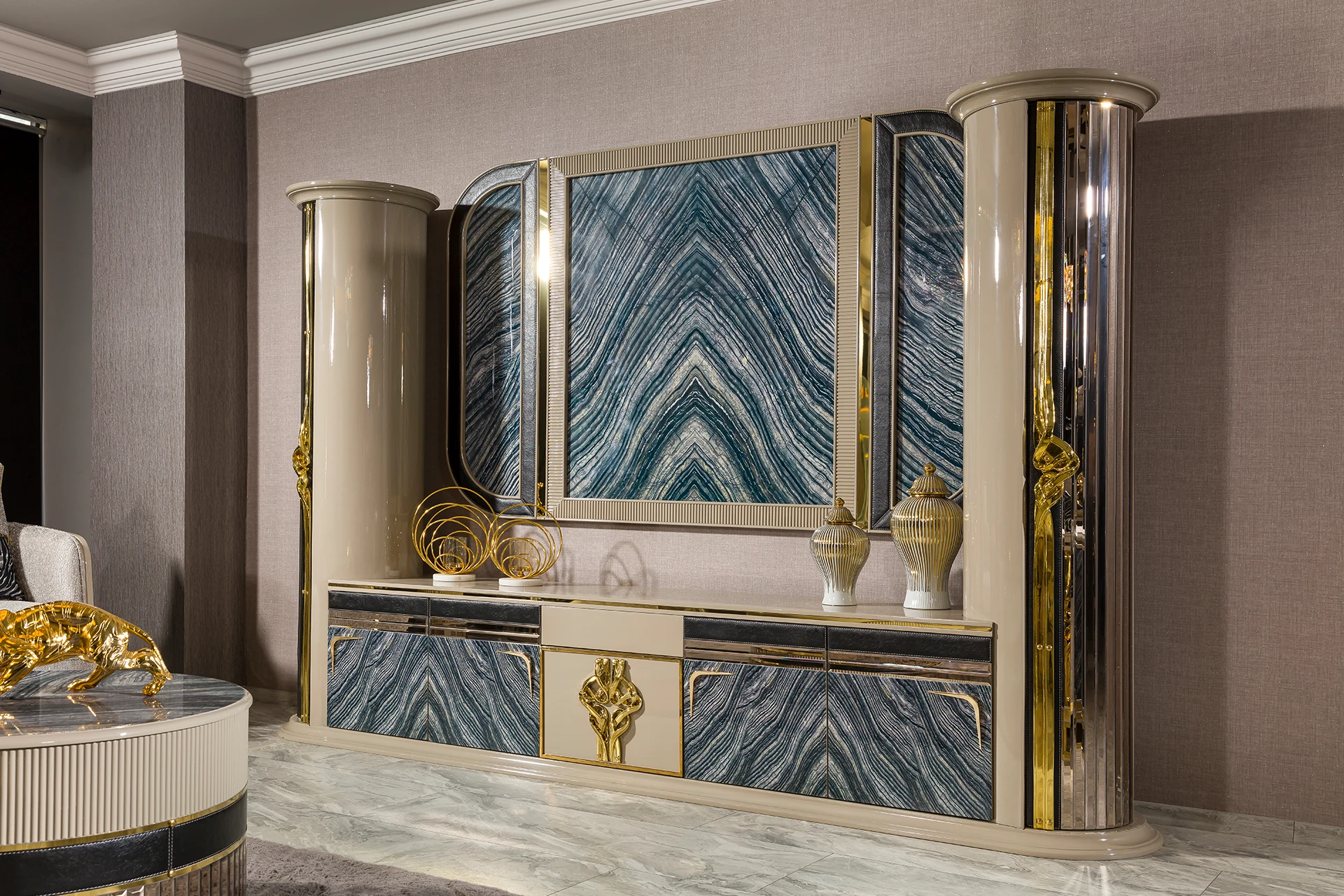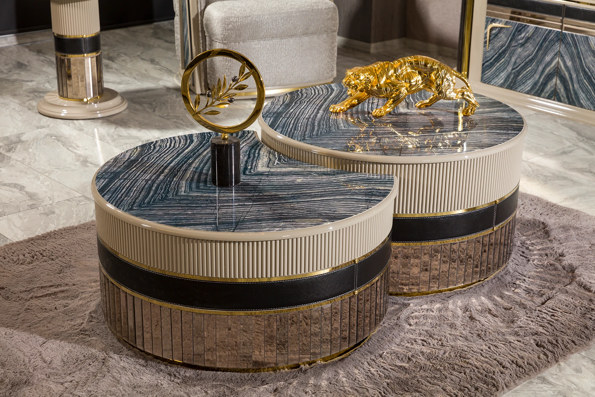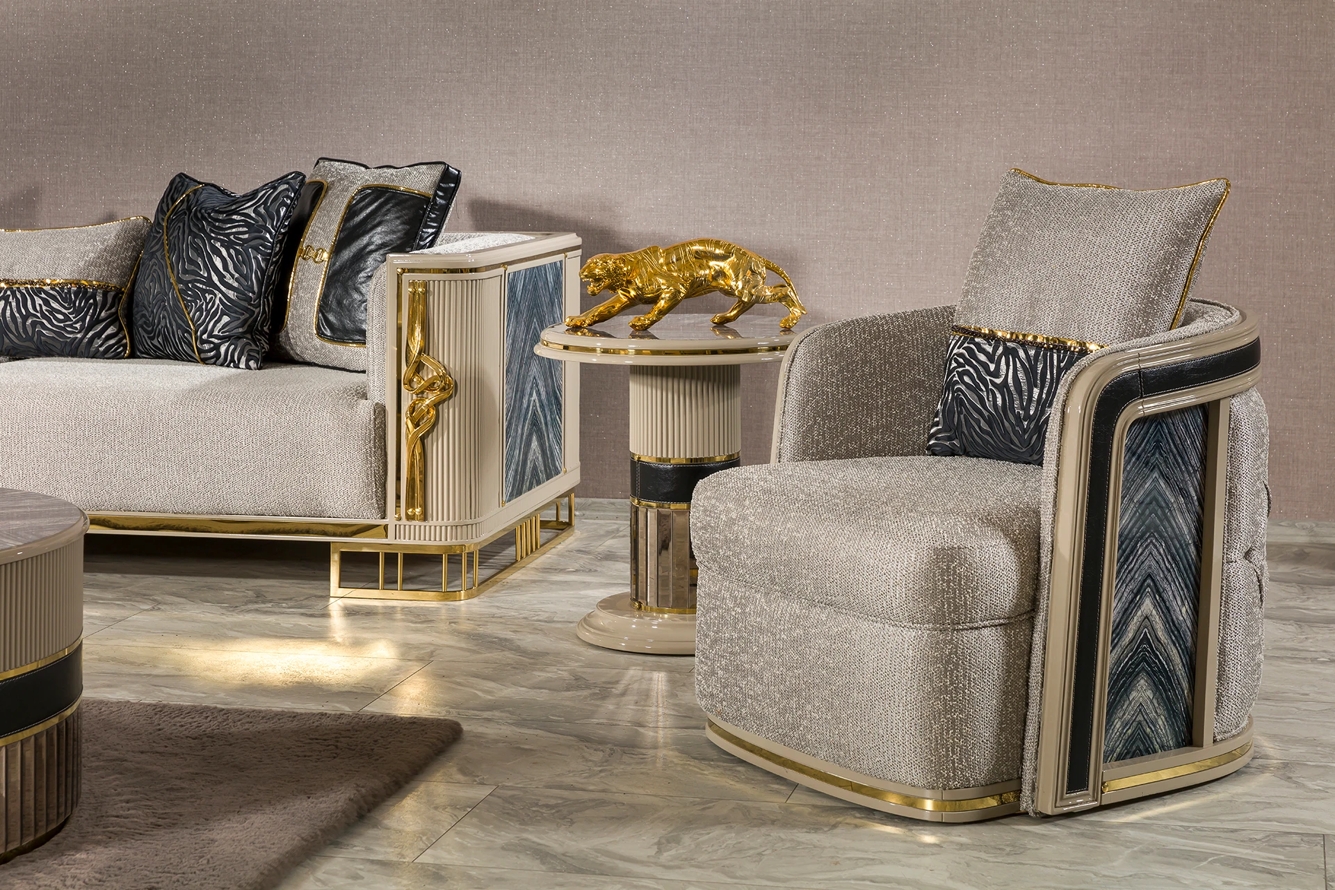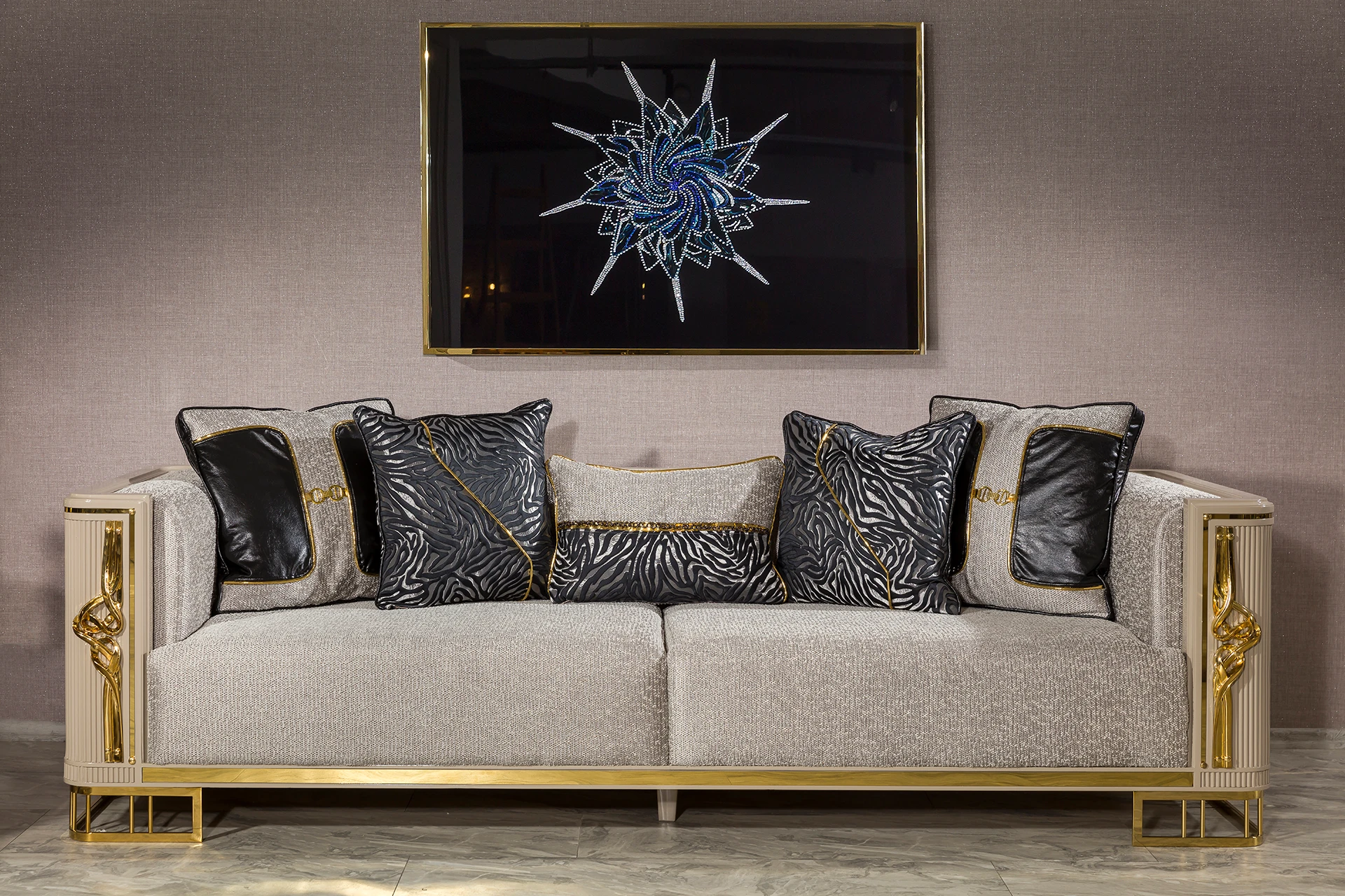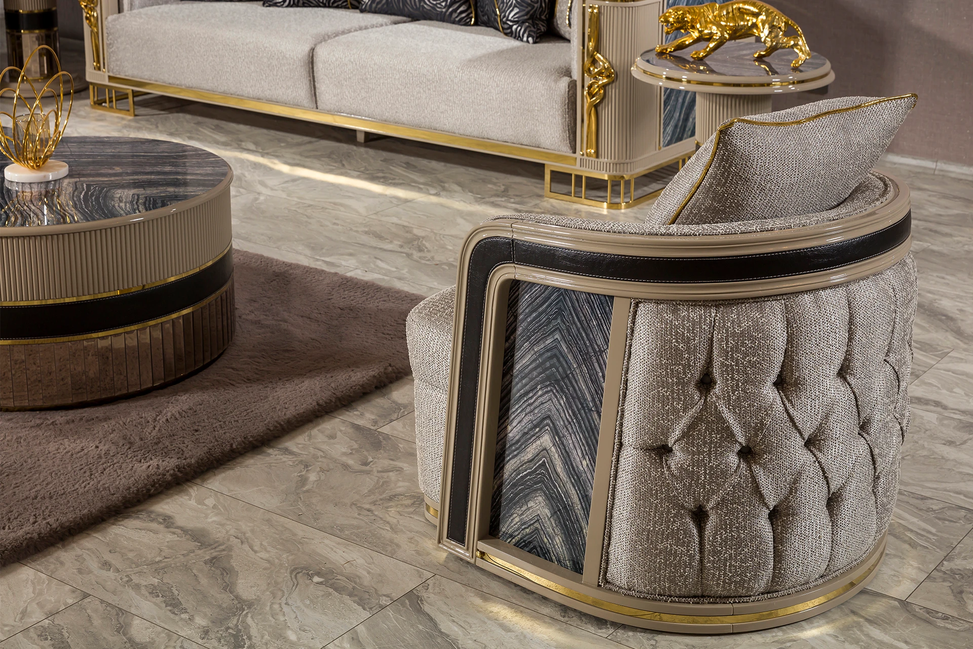 The Valento sofa set combines sleek modernity with artistic craftsmanship, making it the ideal choice for those looking to elevate their living space. Featuring clean lines and exquisite details, this set brings a refined elegance to any room. The plush upholstery offers unmatched comfort, while the gold accents and marble-like patterns add a touch of luxury. Perfect for both formal entertaining and relaxed lounging, the Valento Sofa Set is designed to provide both style and function. Its neutral color palette makes it versatile enough to blend seamlessly into any decor, creating a sophisticated and cozy atmosphere.