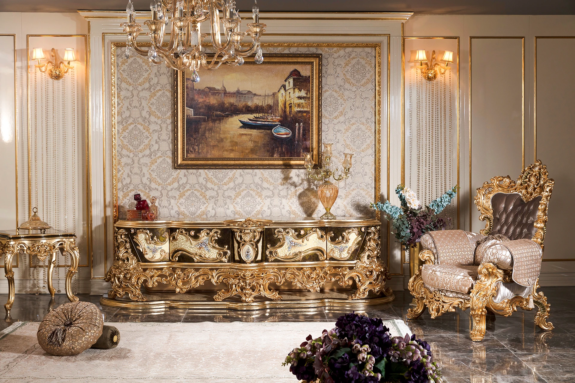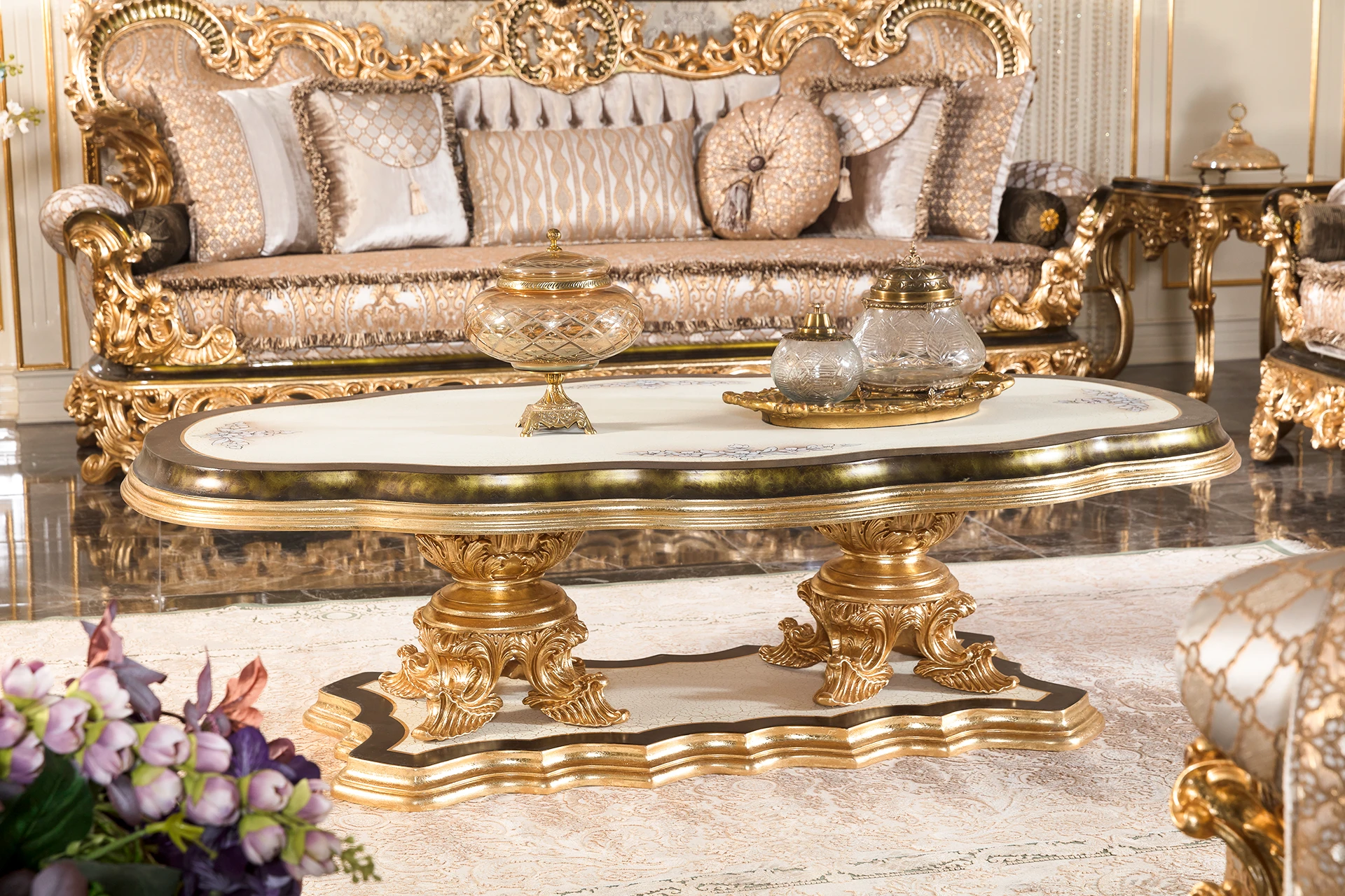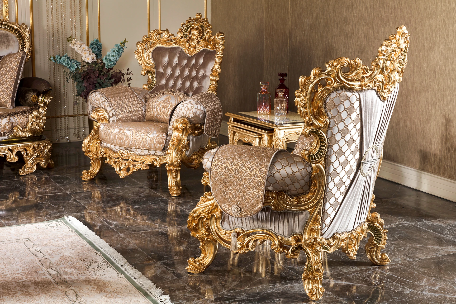 The Valessia sofa set is a striking display of luxury and elegance. Adorned with lavish golden carvings, the sofas exude a regal presence, complemented by plush upholstery in opulent tones. The detailed craftsmanship extends to the armrests and legs, showcasing a blend of classic sophistication and comfort. Ornate cushions add a touch of refinement, enhancing the set’s overall grandeur. The centerpiece table, with its curved lines and intricate gold accents, ties the room together. The Valessia set transforms any space into a luxurious haven, perfect for those who appreciate timeless beauty.