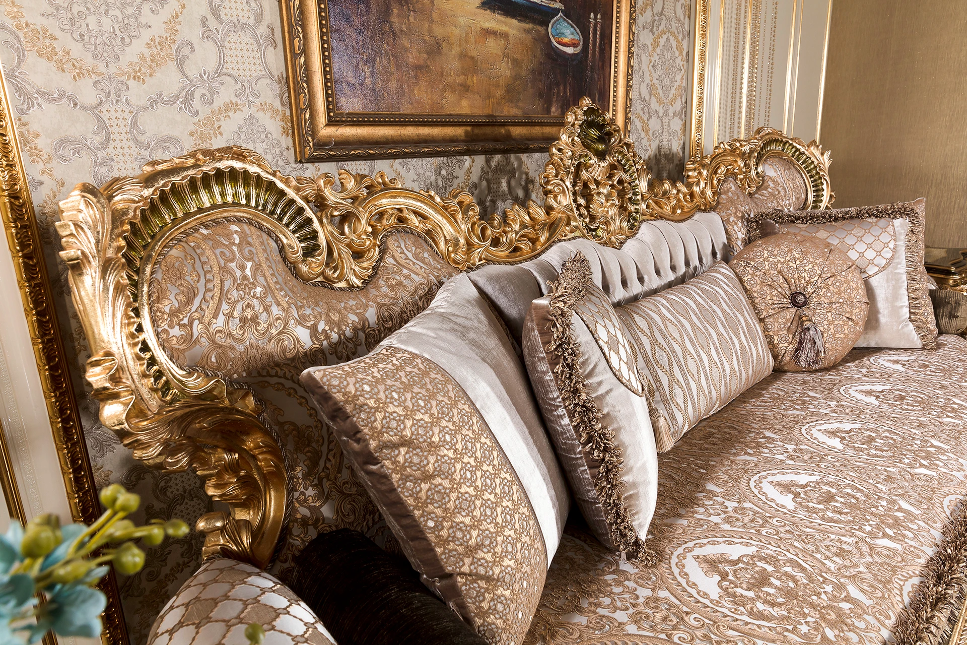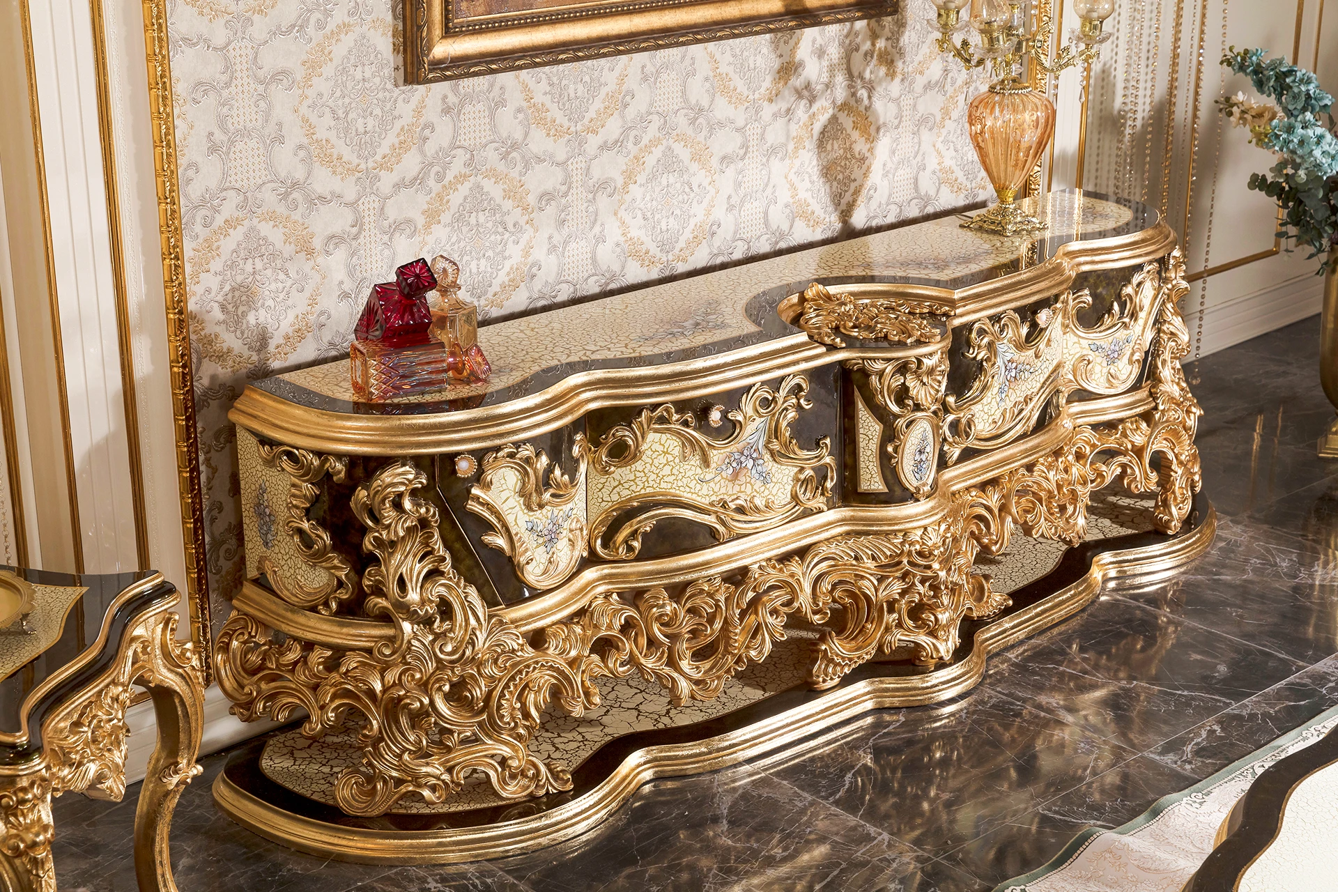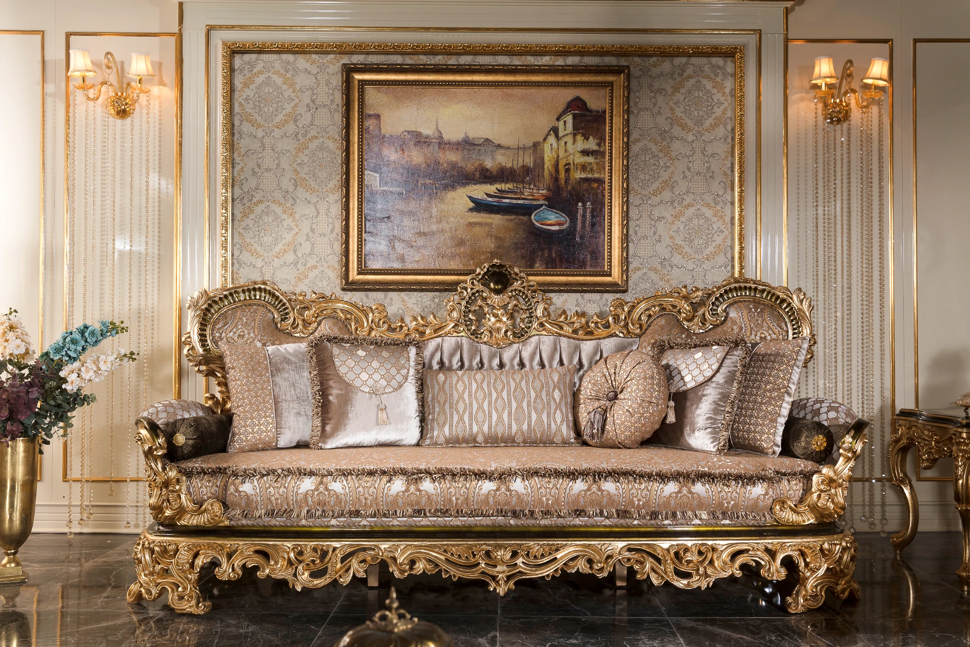 The Valessia sofa set is a striking display of luxury and elegance. Adorned with lavish golden carvings, the sofas exude a regal presence, complemented by plush upholstery in opulent tones. The detailed craftsmanship extends to the armrests and legs, showcasing a blend of classic sophistication and comfort. Ornate cushions add a touch of refinement, enhancing the set’s overall grandeur. The centerpiece table, with its curved lines and intricate gold accents, ties the room together. The Valessia set transforms any space into a luxurious haven, perfect for those who appreciate timeless beauty.
