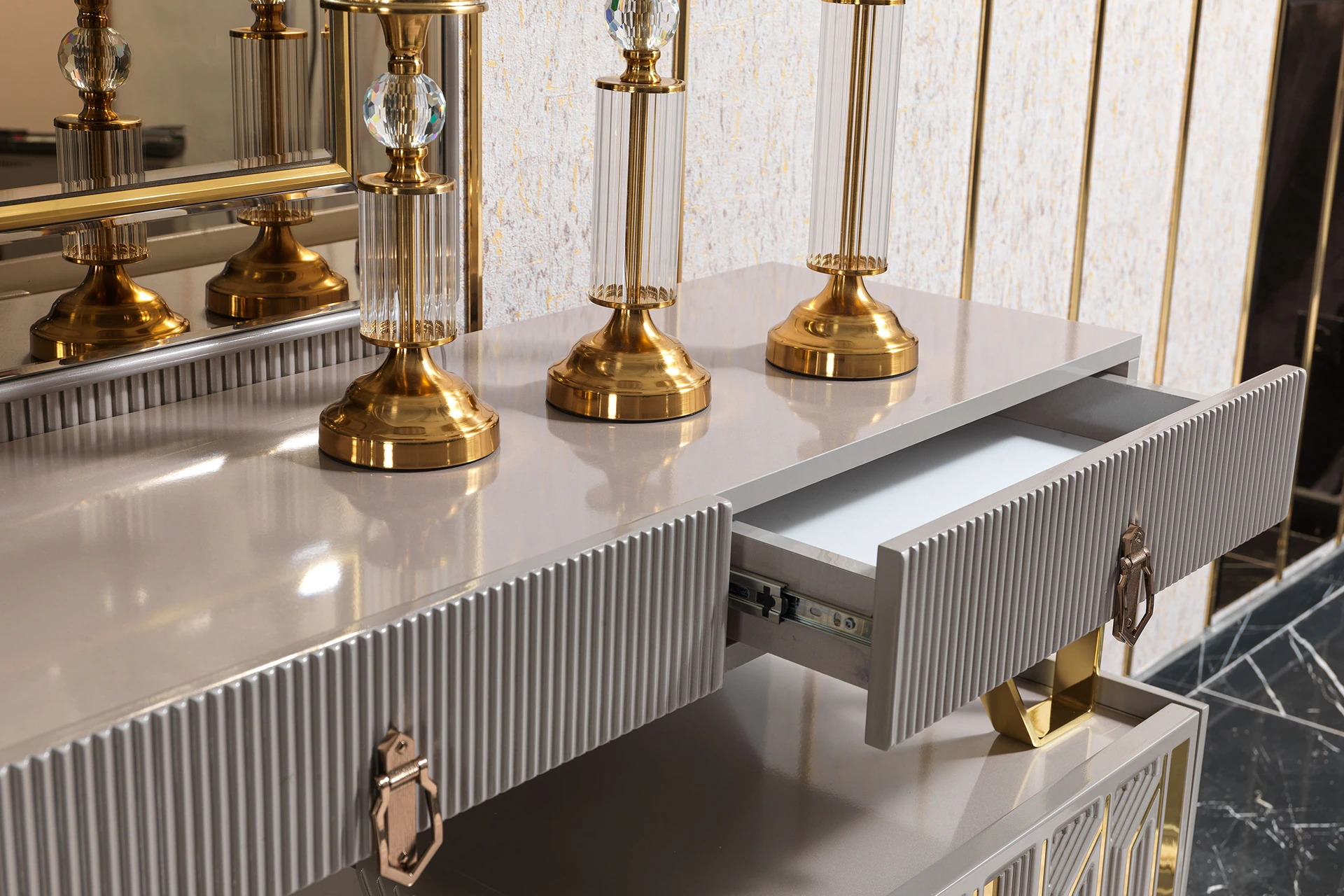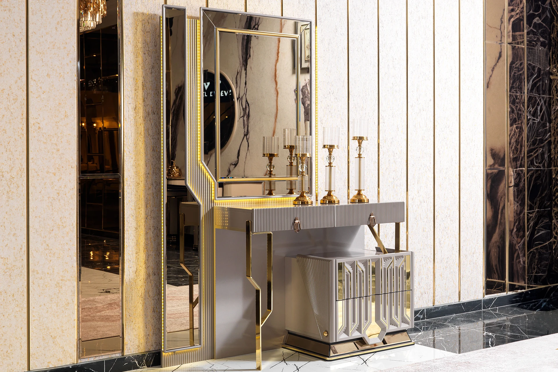 The Valoria bedroom set exudes modern luxury and sophistication. The bed’s upholstered headboard features a striking geometric pattern, accentuated by sleek metallic details that add a touch of elegance. The mirrored wardrobe, with its reflective panels and vertical lines, creates a sense of spaciousness while showcasing impeccable craftsmanship. The nightstands are designed to match the overall theme, boasting intricate detailing and a glossy finish. This set, with its blend of contemporary design and opulent touches, transforms any bedroom into a stylish retreat.
