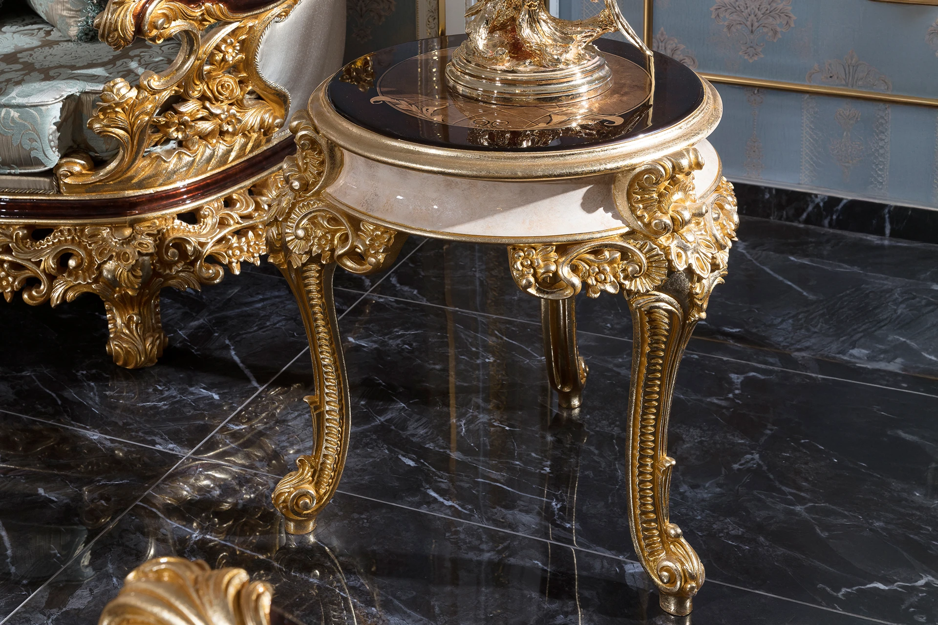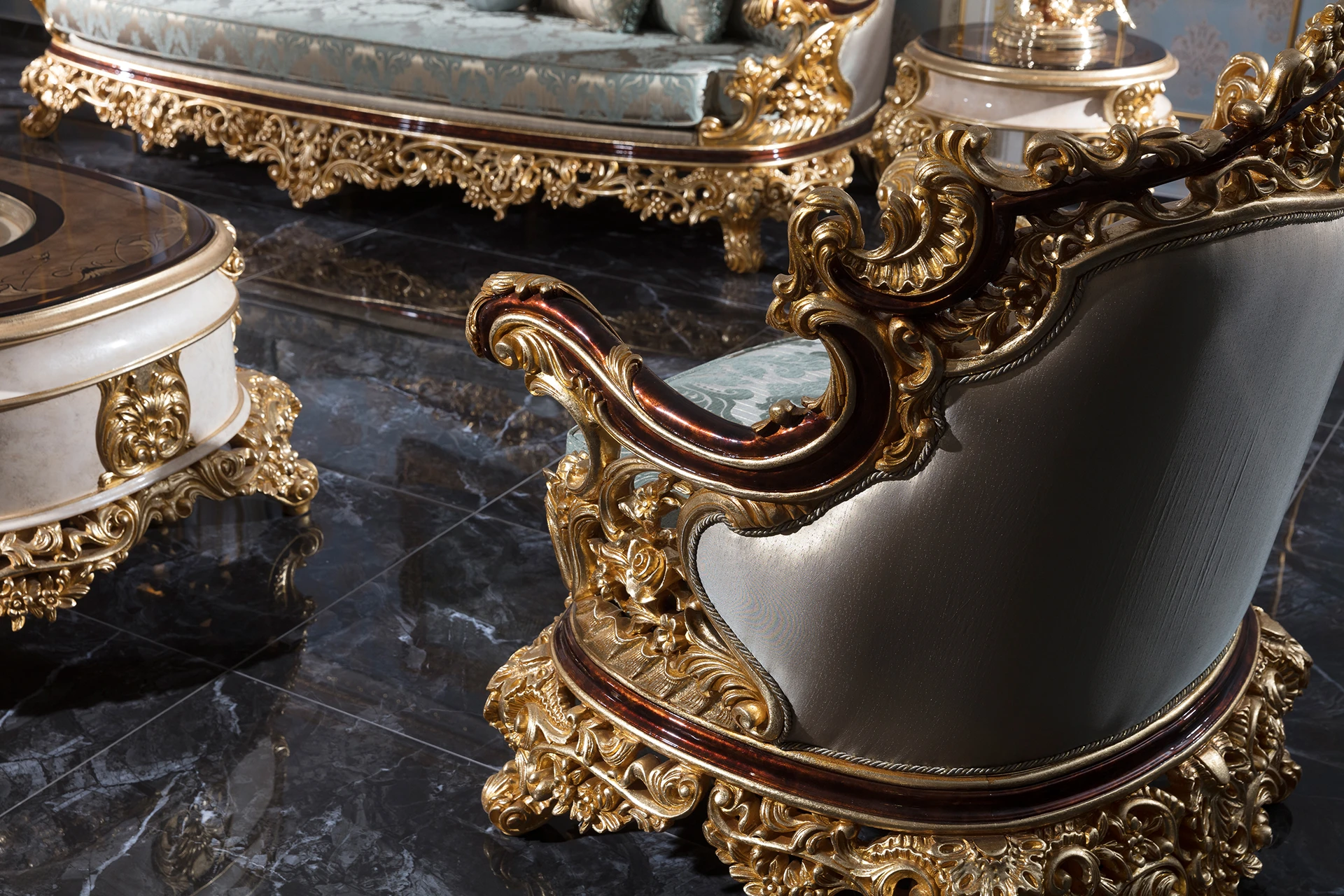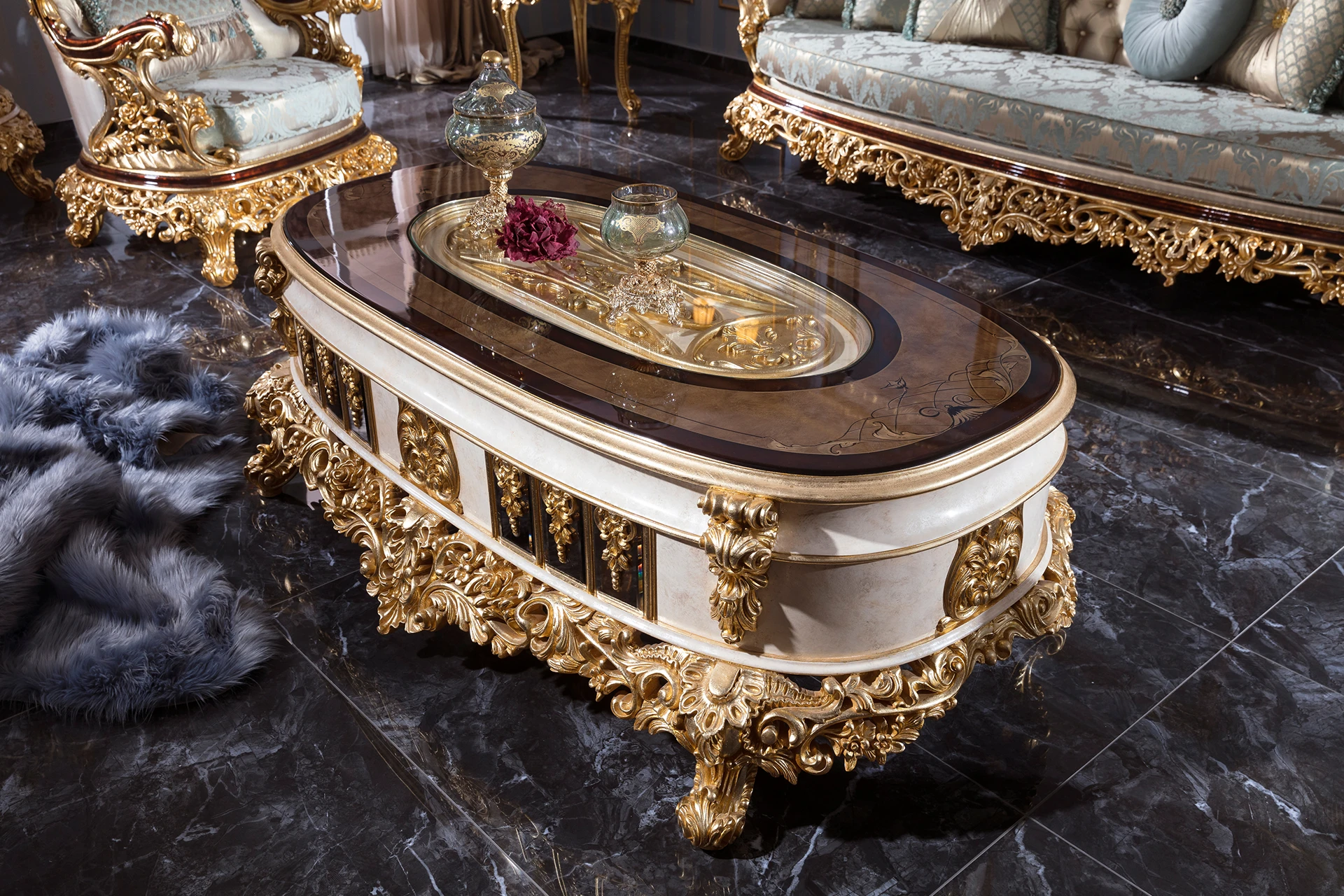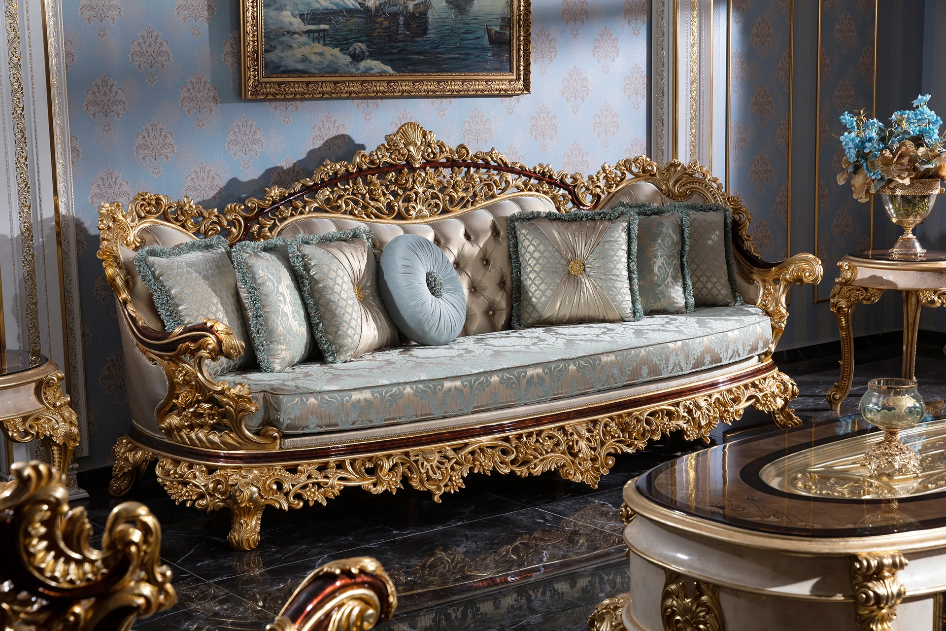 The Varno sofa set epitomizes opulent elegance with its richly detailed carvings and luxurious fabric upholstery. The curved sofa features a stunningly ornate frame, accentuated by gilded accents, creating a regal atmosphere in any living space. The plush cushions provide exceptional comfort while maintaining a sophisticated look. Accompanying armchairs are equally lavish, with intricate carvings and tufted backrests. The coffee table, with its marble-inspired surface and gold embellishments, perfectly complements the set. Ideal for those who desire a blend of comfort and classical grandeur.