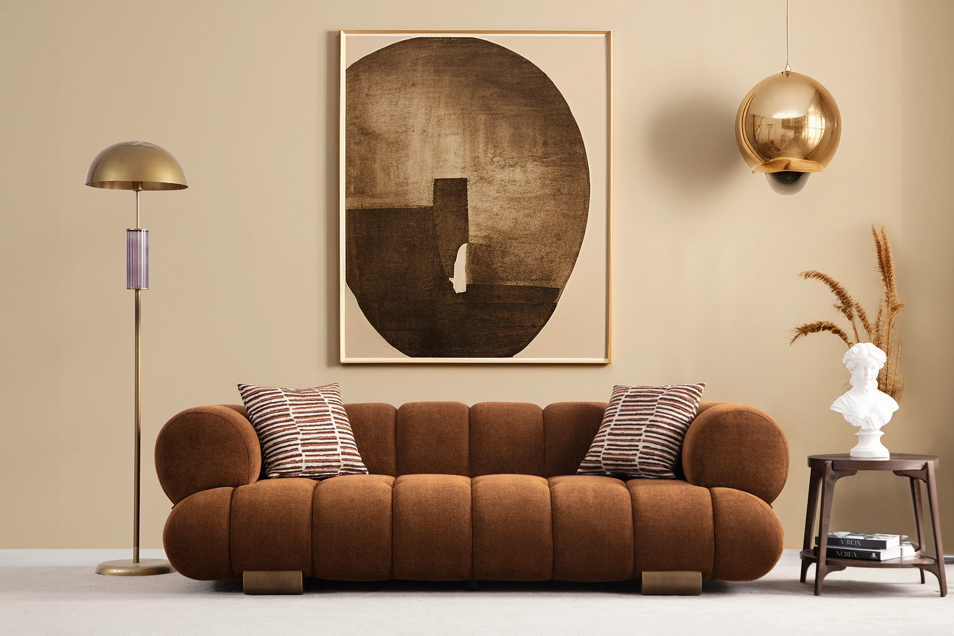 The Venus sofa set showcases a perfect fusion of comfort and modern design. Its rounded, plush seating creates an inviting and cozy atmosphere, while the mix of earthy tones brings warmth to the room. The set features a unique blend of textures, combining soft upholstery with smooth leather accents. The contemporary coffee table with its simple lines complements the sofas, creating a harmonious and stylish living space ideal for relaxation or sophisticated gatherings.