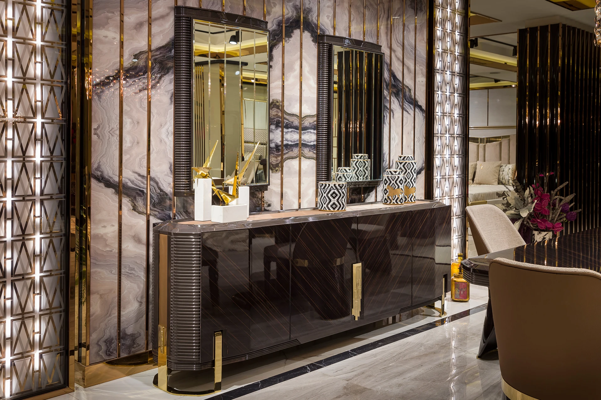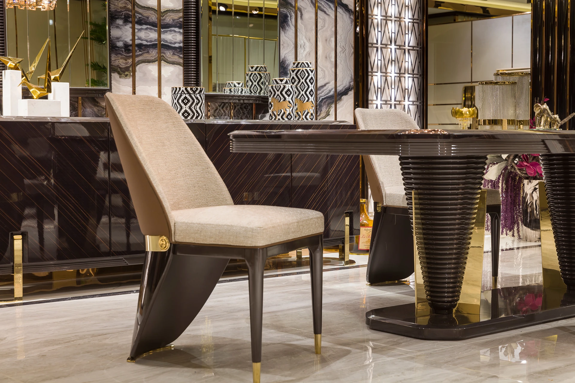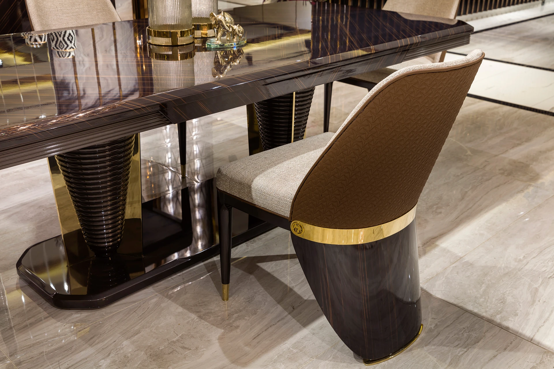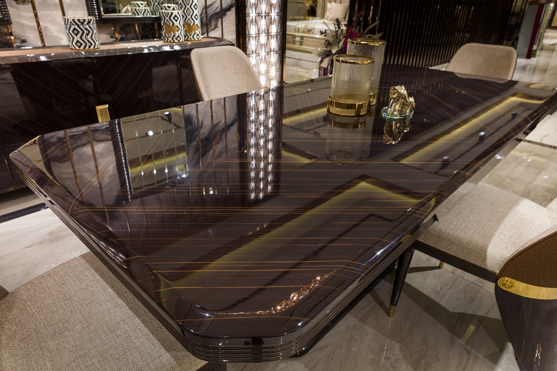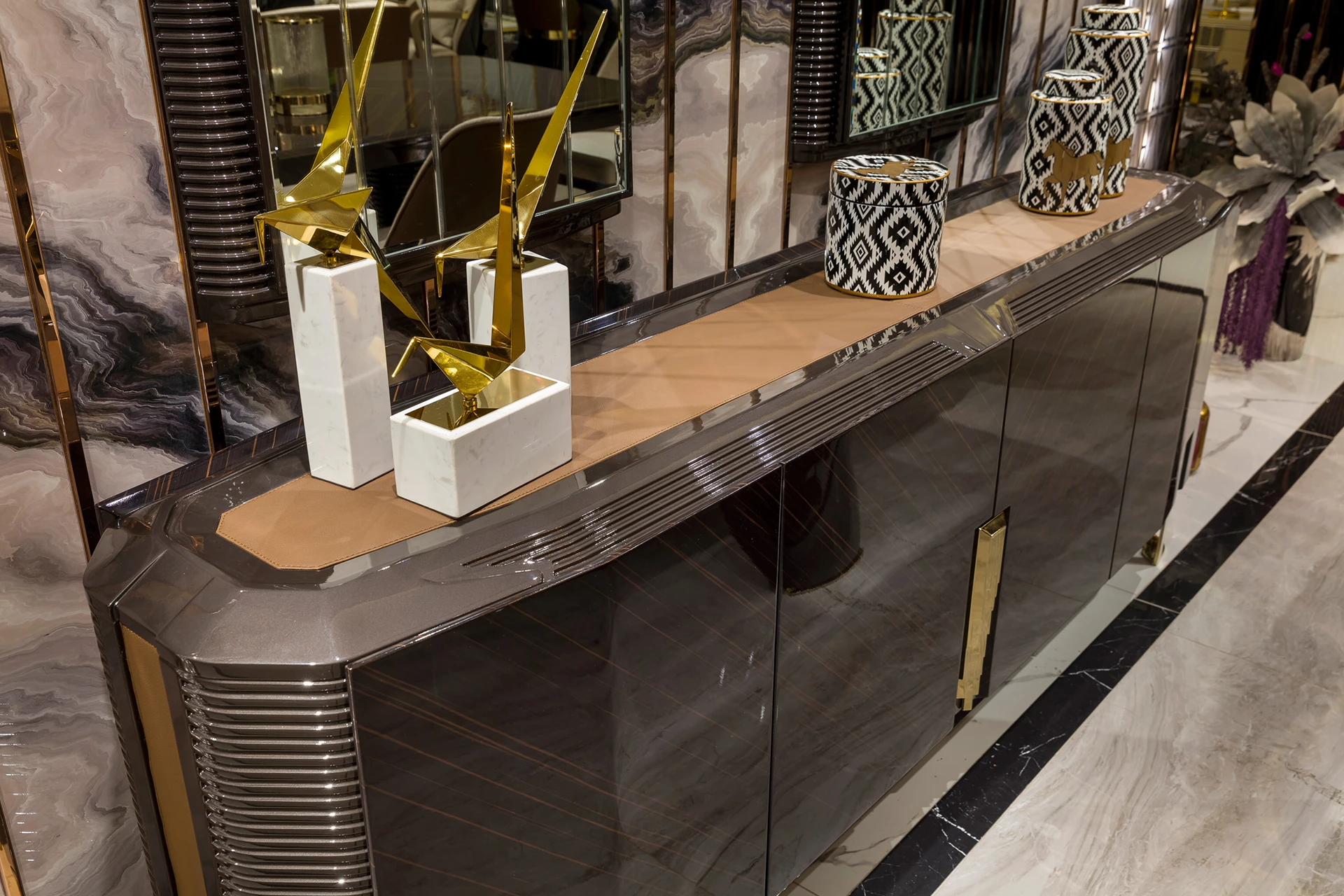 Elevate your dining experience with the Vsta dining room set, a stunning combination of modern elegance and luxurious design. The sleek dining table, finished in a high-gloss dark tone, is complemented by plush, upholstered chairs with a touch of metallic accents. The sideboard features ample storage space and showcases a sophisticated look, highlighted by its polished surfaces. This set brings a refined and contemporary vibe to any dining area, creating the perfect ambiance for memorable gatherings.