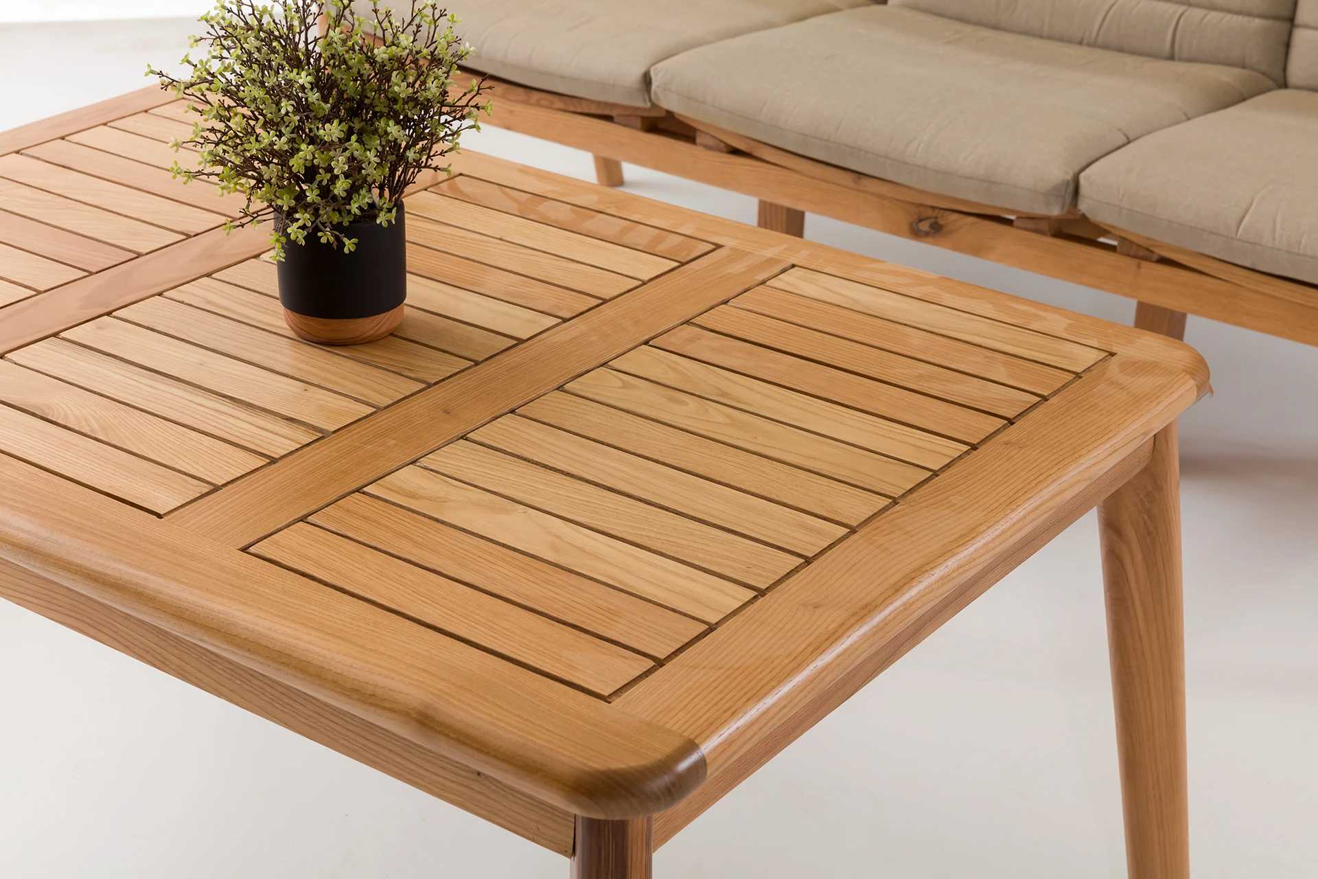 Elevate your outdoor relaxation with the Zarafet garden seating group, designed for those who value both elegance and comfort. Crafted from high-quality wood, this set includes a spacious three-seater sofa and two stylish armchairs, all featuring plush, neutral-toned cushions that promise luxurious comfort. The sleek lines and natural wood finish make this set a timeless addition to any garden, patio, or poolside. Completing the look is a matching wooden coffee table, perfect for casual dining or entertaining guests. Built to withstand the elements, the Zarafet garden seating group offers durability and charm for your outdoor living space.