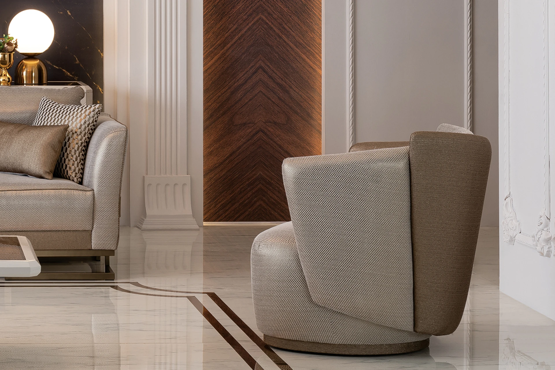 The Zenith sofa set embodies timeless elegance and modern design, blending luxurious textures with sophisticated accents. This set features plush seating upholstered in soft, neutral tones, complemented by sleek metallic legs and subtle decorative elements. The minimalist design is elevated by refined details such as the signature emblem on the armrest, adding a touch of exclusivity. The overall ambiance is one of understated luxury, perfect for creating a serene and stylish living space.